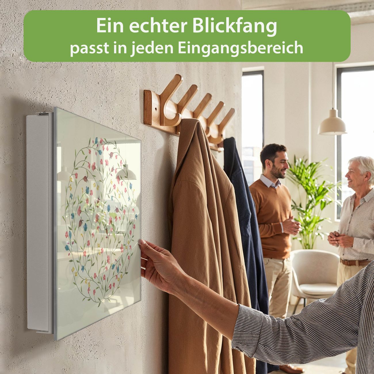 Bringe Ordnung und Eleganz in deinen Eingangsbereich mit dem banjado Schlüsselkasten Motiv Motiv Blumenreigen. Die moderne Schlüsselbox kombiniert funktionales Design mit hochwertiger Verarbeitung und wird so zu einem echten Hingucker in Flur, Büro oder Ferienwohnung. ✅ Stilvolle Schlüsselaufbewahrung mit Glasfront im Motiv Motiv Blumenreigen Der Design-Schlüsselkasten Motiv Motiv Blumenreigen bietet Platz für bis zu 50 Schlüssel, die auf 5 stabilen Reihen mit je 10 Haken übersichtlich verstaut werden. Mit seinen kompakten Maßen von 30 x 30 x 5 cm passt die Schlüsselbox perfekt auch in kleinere Räume. Der weiß lackierte Stahlkorpus mit rechts angeschlagenem Türscharnier harmoniert mit der Glasfront und fügt sich nahtlos in jedes Wohnambiente ein. Ob als Schlüsselorganizer für Zuhause oder als praktische Lösung für Büros, Praxen und Gewerbe, der banjado Schlüsselkasten sorgt für Ordnung und Übersicht. Dank der magnetischen, mit Kreidestiften beschreibbaren Glasfront kannst du Notizen anheften oder Termine direkt auf der Oberfläche festhalten. Die Schlüsselbox Motiv Motiv Blumenreigen zur Wandmontage wird inklusive Befestigungsmaterial geliefert und ist schnell angebracht. So hast du deine Schlüssel jederzeit griffbereit und zugleich stilvoll verstaut. Mit diesem banjado Schlüsselkasten Motiv Motiv Blumenreigen kombinierst du praktische Aufbewahrung mit stilvollem Wohndesign. Ob privat oder geschäftlich, die Schlüsselbox sorgt für mehr Ordnung, Übersicht und ein wohnliches Ambiente.Vorteile im Überblick
