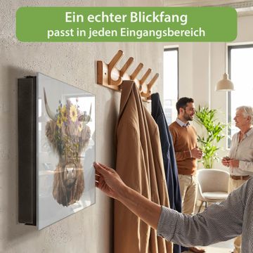 Bringe Ordnung und Eleganz in deinen Eingangsbereich mit dem banjado Schlüsselkasten Motiv Motiv Blumige Highland-Kuh. Die moderne Schlüsselbox kombiniert funktionales Design mit hochwertiger Verarbeitung und wird so zu einem echten Hingucker in Flur, Büro oder Ferienwohnung. ✅ Stilvolle Schlüsselaufbewahrung mit Glasfront im Motiv Motiv Blumige Highland-Kuh Der Design-Schlüsselkasten Motiv Motiv Blumige Highland-Kuh bietet Platz für bis zu 50 Schlüssel, die auf 5 stabilen Reihen mit je 10 Haken übersichtlich verstaut werden. Mit seinen kompakten Maßen von 30 x 30 x 5 cm passt die Schlüsselbox perfekt auch in kleinere Räume. Der schwarz lackierte Stahlkorpus mit rechts angeschlagenem Türscharnier harmoniert mit der Glasfront und fügt sich nahtlos in jedes Wohnambiente ein. Ob als Schlüsselorganizer für Zuhause oder als praktische Lösung für Büros, Praxen und Gewerbe, der banjado Schlüsselkasten sorgt für Ordnung und Übersicht. Dank der magnetischen, mit Kreidestiften beschreibbaren Glasfront kannst du Notizen anheften oder Termine direkt auf der Oberfläche festhalten. Die Schlüsselbox Motiv Motiv Blumige Highland-Kuh zur Wandmontage wird inklusive Befestigungsmaterial geliefert und ist schnell angebracht. So hast du deine Schlüssel jederzeit griffbereit und zugleich stilvoll verstaut. Mit diesem banjado Schlüsselkasten Motiv Motiv Blumige Highland-Kuh kombinierst du praktische Aufbewahrung mit stilvollem Wohndesign. Ob privat oder geschäftlich, die Schlüsselbox sorgt für mehr Ordnung, Übersicht und ein wohnliches Ambiente.Vorteile im Überblick