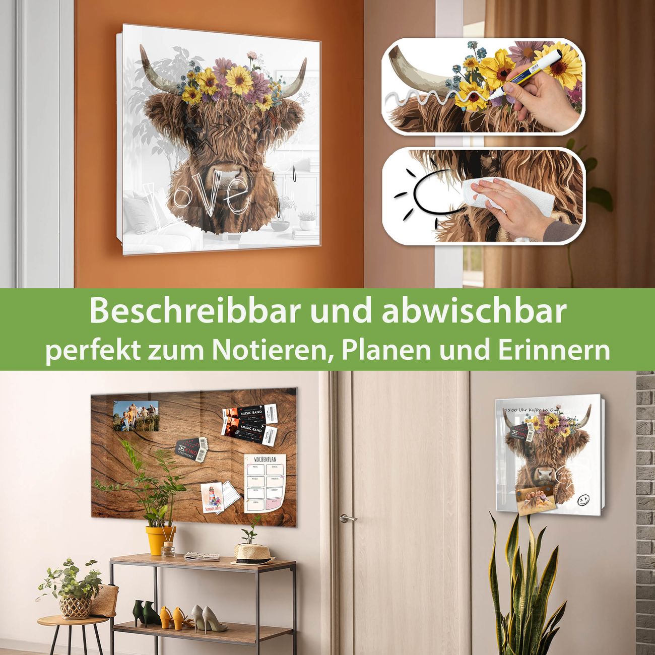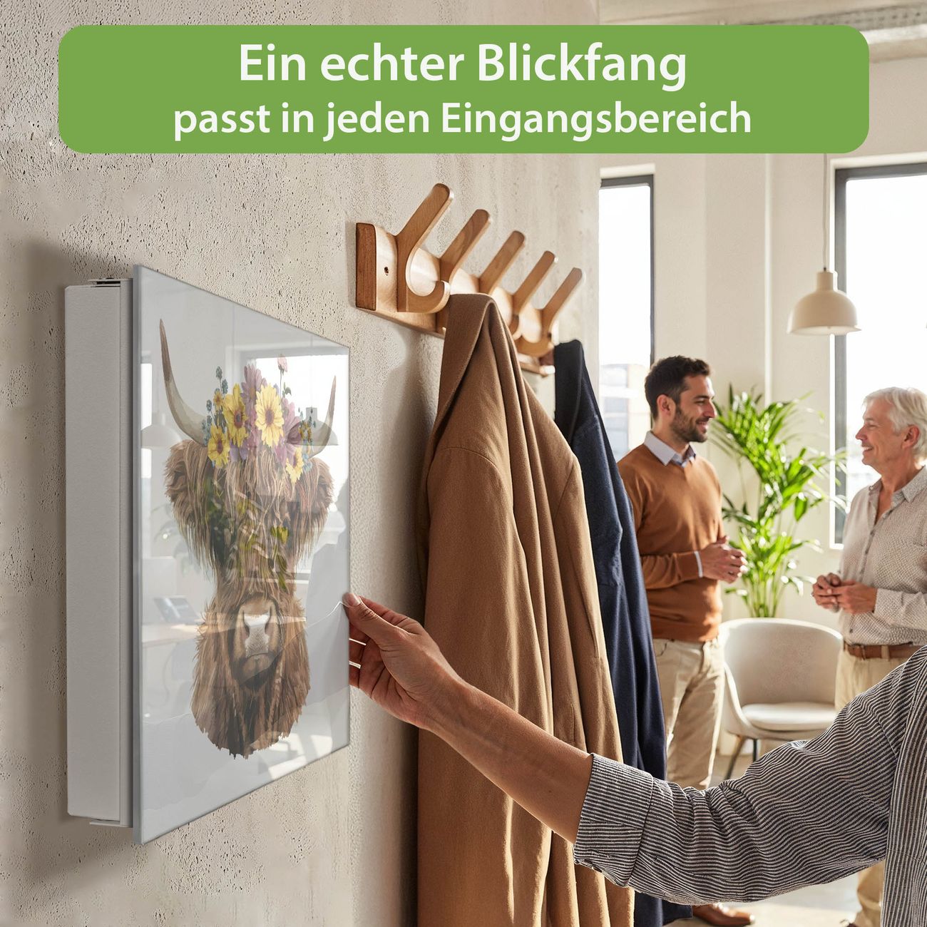 Bringe Ordnung und Eleganz in deinen Eingangsbereich mit dem banjado Schlüsselkasten Motiv Motiv Blumige Highland-Kuh. Die moderne Schlüsselbox kombiniert funktionales Design mit hochwertiger Verarbeitung und wird so zu einem echten Hingucker in Flur, Büro oder Ferienwohnung. ✅ Stilvolle Schlüsselaufbewahrung mit Glasfront im Motiv Motiv Blumige Highland-Kuh Der Design-Schlüsselkasten Motiv Motiv Blumige Highland-Kuh bietet Platz für bis zu 50 Schlüssel, die auf 5 stabilen Reihen mit je 10 Haken übersichtlich verstaut werden. Mit seinen kompakten Maßen von 30 x 30 x 5 cm passt die Schlüsselbox perfekt auch in kleinere Räume. Der weiß lackierte Stahlkorpus mit rechts angeschlagenem Türscharnier harmoniert mit der Glasfront und fügt sich nahtlos in jedes Wohnambiente ein. Ob als Schlüsselorganizer für Zuhause oder als praktische Lösung für Büros, Praxen und Gewerbe, der banjado Schlüsselkasten sorgt für Ordnung und Übersicht. Dank der magnetischen, mit Kreidestiften beschreibbaren Glasfront kannst du Notizen anheften oder Termine direkt auf der Oberfläche festhalten. Die Schlüsselbox Motiv Motiv Blumige Highland-Kuh zur Wandmontage wird inklusive Befestigungsmaterial geliefert und ist schnell angebracht. So hast du deine Schlüssel jederzeit griffbereit und zugleich stilvoll verstaut. Mit diesem banjado Schlüsselkasten Motiv Motiv Blumige Highland-Kuh kombinierst du praktische Aufbewahrung mit stilvollem Wohndesign. Ob privat oder geschäftlich, die Schlüsselbox sorgt für mehr Ordnung, Übersicht und ein wohnliches Ambiente.Vorteile im Überblick