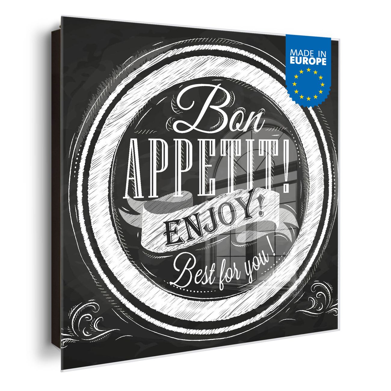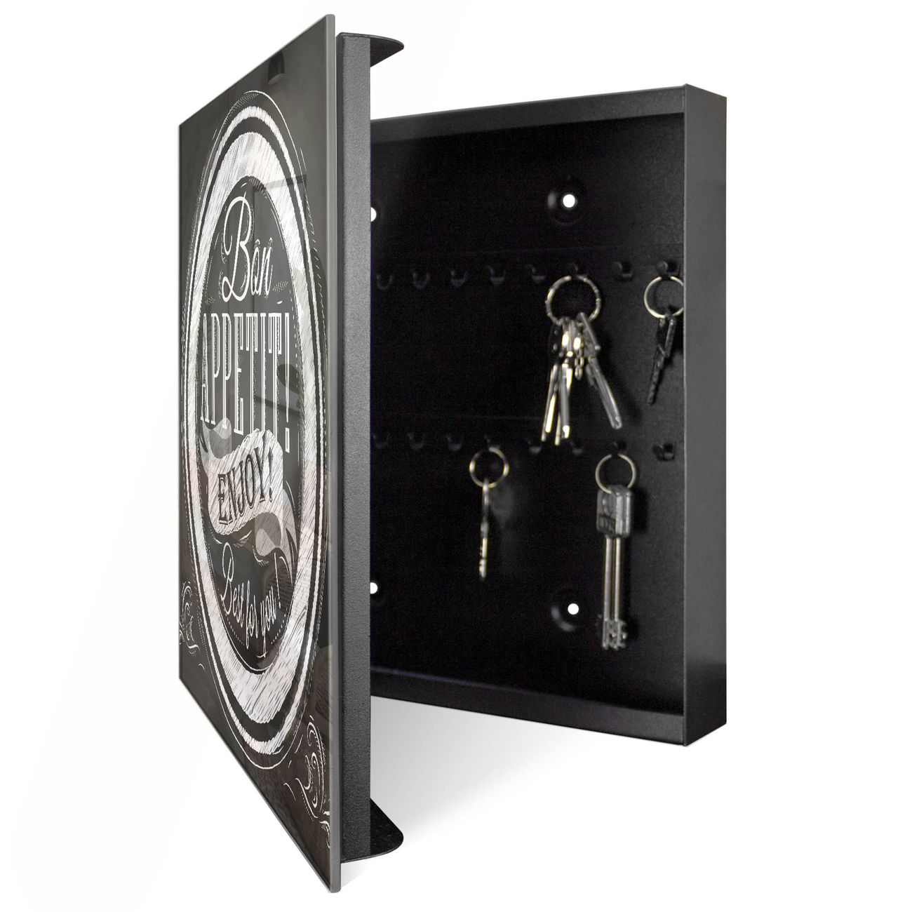 Bringe Ordnung und Eleganz in deinen Eingangsbereich mit dem banjado Schlüsselkasten Motiv Motiv Bon Appetit. Die moderne Schlüsselbox kombiniert funktionales Design mit hochwertiger Verarbeitung und wird so zu einem echten Hingucker in Flur, Büro oder Ferienwohnung. ✅ Stilvolle Schlüsselaufbewahrung mit Glasfront im Motiv Motiv Bon Appetit Der Design-Schlüsselkasten Motiv Motiv Bon Appetit bietet Platz für bis zu 50 Schlüssel, die auf 5 stabilen Reihen mit je 10 Haken übersichtlich verstaut werden. Mit seinen kompakten Maßen von 30 x 30 x 5 cm passt die Schlüsselbox perfekt auch in kleinere Räume. Der schwarz lackierte Stahlkorpus mit rechts angeschlagenem Türscharnier harmoniert mit der Glasfront und fügt sich nahtlos in jedes Wohnambiente ein. Ob als Schlüsselorganizer für Zuhause oder als praktische Lösung für Büros, Praxen und Gewerbe, der banjado Schlüsselkasten sorgt für Ordnung und Übersicht. Dank der magnetischen, mit Kreidestiften beschreibbaren Glasfront kannst du Notizen anheften oder Termine direkt auf der Oberfläche festhalten. Die Schlüsselbox Motiv Motiv Bon Appetit zur Wandmontage wird inklusive Befestigungsmaterial geliefert und ist schnell angebracht. So hast du deine Schlüssel jederzeit griffbereit und zugleich stilvoll verstaut. Mit diesem banjado Schlüsselkasten Motiv Motiv Bon Appetit kombinierst du praktische Aufbewahrung mit stilvollem Wohndesign. Ob privat oder geschäftlich, die Schlüsselbox sorgt für mehr Ordnung, Übersicht und ein wohnliches Ambiente.Vorteile im Überblick