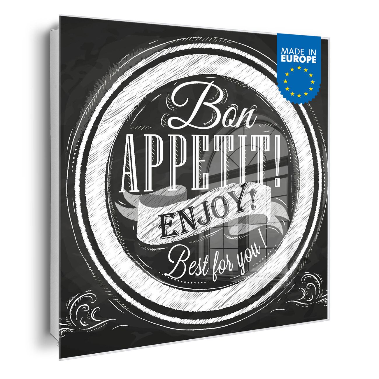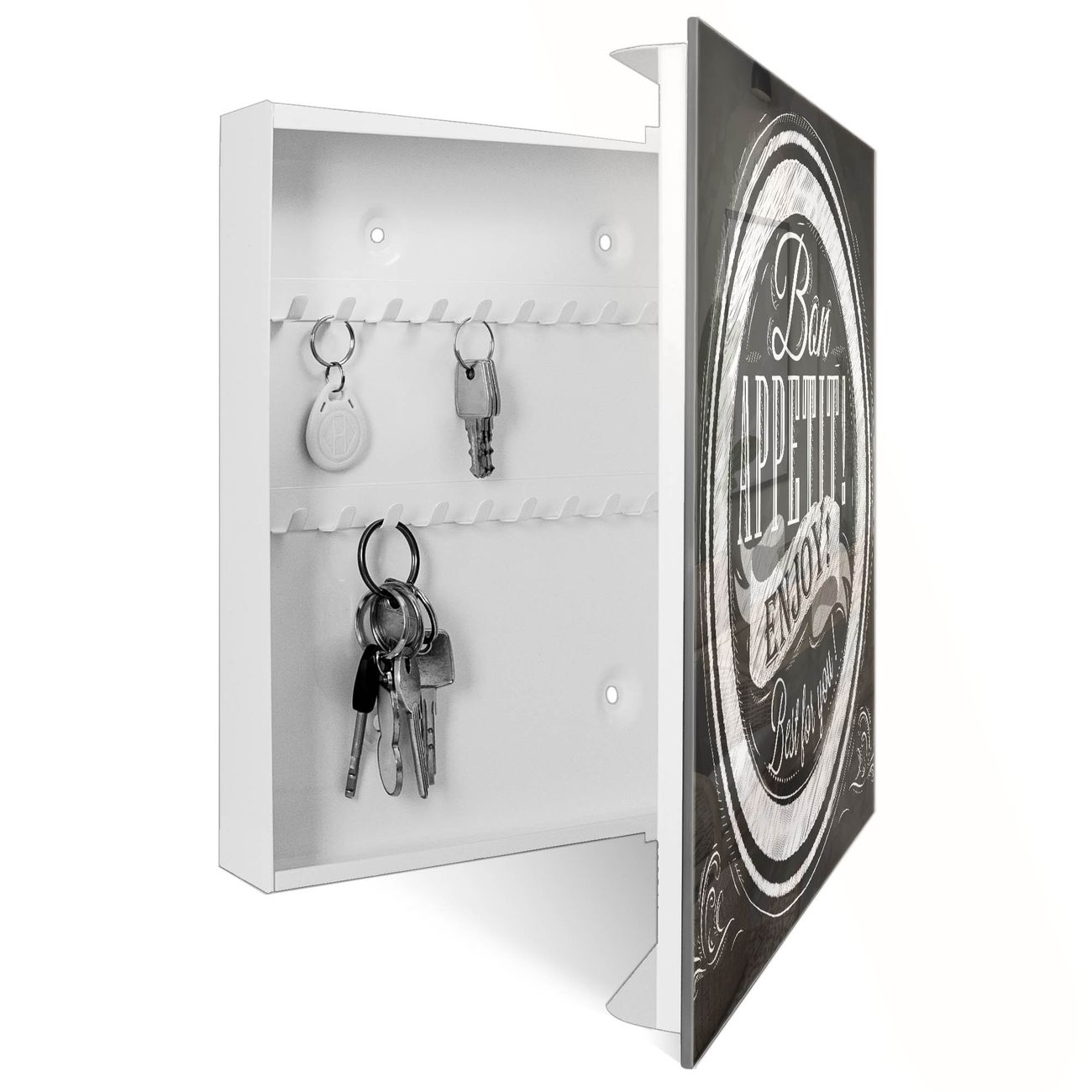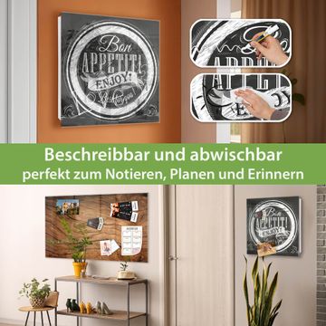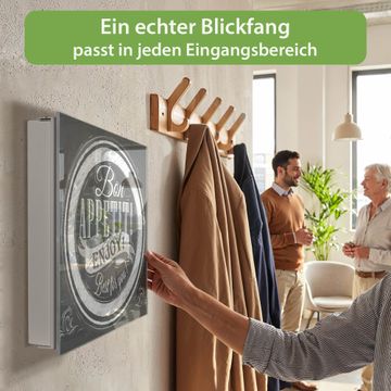 Bringe Ordnung und Eleganz in deinen Eingangsbereich mit dem banjado Schlüsselkasten Motiv Motiv Bon Appetit. Die moderne Schlüsselbox kombiniert funktionales Design mit hochwertiger Verarbeitung und wird so zu einem echten Hingucker in Flur, Büro oder Ferienwohnung. ✅ Stilvolle Schlüsselaufbewahrung mit Glasfront im Motiv Motiv Bon Appetit Der Design-Schlüsselkasten Motiv Motiv Bon Appetit bietet Platz für bis zu 50 Schlüssel, die auf 5 stabilen Reihen mit je 10 Haken übersichtlich verstaut werden. Mit seinen kompakten Maßen von 30 x 30 x 5 cm passt die Schlüsselbox perfekt auch in kleinere Räume. Der weiß lackierte Stahlkorpus mit rechts angeschlagenem Türscharnier harmoniert mit der Glasfront und fügt sich nahtlos in jedes Wohnambiente ein. Ob als Schlüsselorganizer für Zuhause oder als praktische Lösung für Büros, Praxen und Gewerbe, der banjado Schlüsselkasten sorgt für Ordnung und Übersicht. Dank der magnetischen, mit Kreidestiften beschreibbaren Glasfront kannst du Notizen anheften oder Termine direkt auf der Oberfläche festhalten. Die Schlüsselbox Motiv Motiv Bon Appetit zur Wandmontage wird inklusive Befestigungsmaterial geliefert und ist schnell angebracht. So hast du deine Schlüssel jederzeit griffbereit und zugleich stilvoll verstaut. Mit diesem banjado Schlüsselkasten Motiv Motiv Bon Appetit kombinierst du praktische Aufbewahrung mit stilvollem Wohndesign. Ob privat oder geschäftlich, die Schlüsselbox sorgt für mehr Ordnung, Übersicht und ein wohnliches Ambiente.Vorteile im Überblick