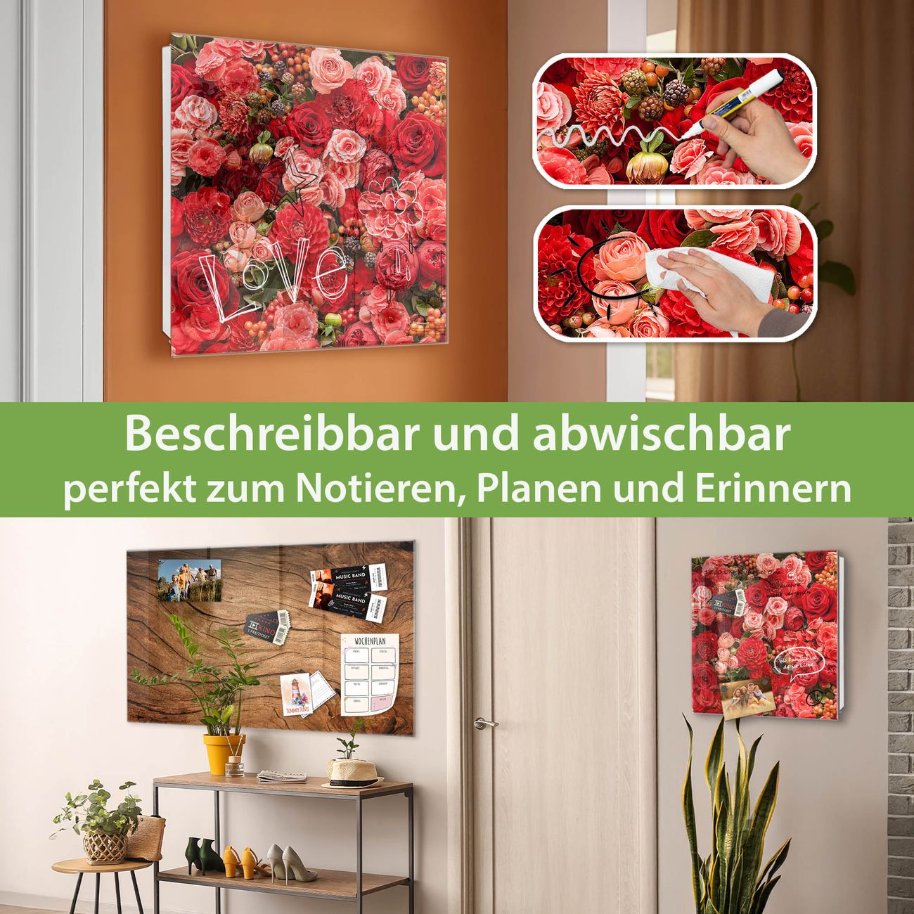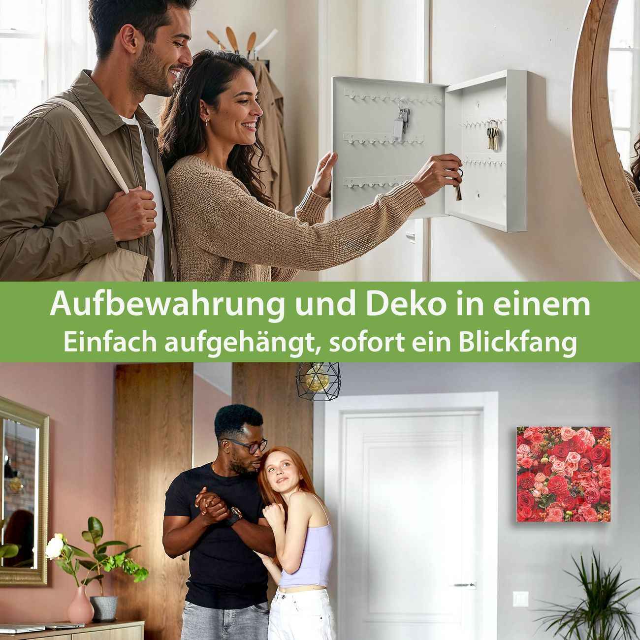 Bringe Ordnung und Eleganz in deinen Eingangsbereich mit dem banjado Schlüsselkasten Motiv Motiv Bouquet in Rot. Die moderne Schlüsselbox kombiniert funktionales Design mit hochwertiger Verarbeitung und wird so zu einem echten Hingucker in Flur, Büro oder Ferienwohnung. ✅ Stilvolle Schlüsselaufbewahrung mit Glasfront im Motiv Motiv Bouquet in Rot Der Design-Schlüsselkasten Motiv Motiv Bouquet in Rot bietet Platz für bis zu 50 Schlüssel, die auf 5 stabilen Reihen mit je 10 Haken übersichtlich verstaut werden. Mit seinen kompakten Maßen von 30 x 30 x 5 cm passt die Schlüsselbox perfekt auch in kleinere Räume. Der weiß lackierte Stahlkorpus mit rechts angeschlagenem Türscharnier harmoniert mit der Glasfront und fügt sich nahtlos in jedes Wohnambiente ein. Ob als Schlüsselorganizer für Zuhause oder als praktische Lösung für Büros, Praxen und Gewerbe, der banjado Schlüsselkasten sorgt für Ordnung und Übersicht. Dank der magnetischen, mit Kreidestiften beschreibbaren Glasfront kannst du Notizen anheften oder Termine direkt auf der Oberfläche festhalten. Die Schlüsselbox Motiv Motiv Bouquet in Rot zur Wandmontage wird inklusive Befestigungsmaterial geliefert und ist schnell angebracht. So hast du deine Schlüssel jederzeit griffbereit und zugleich stilvoll verstaut. Mit diesem banjado Schlüsselkasten Motiv Motiv Bouquet in Rot kombinierst du praktische Aufbewahrung mit stilvollem Wohndesign. Ob privat oder geschäftlich, die Schlüsselbox sorgt für mehr Ordnung, Übersicht und ein wohnliches Ambiente.Vorteile im Überblick