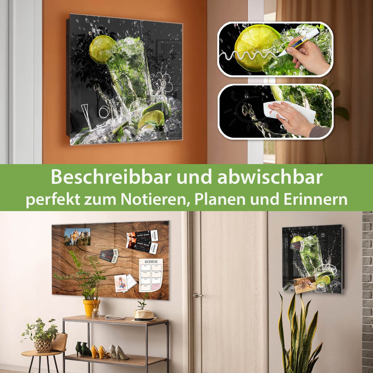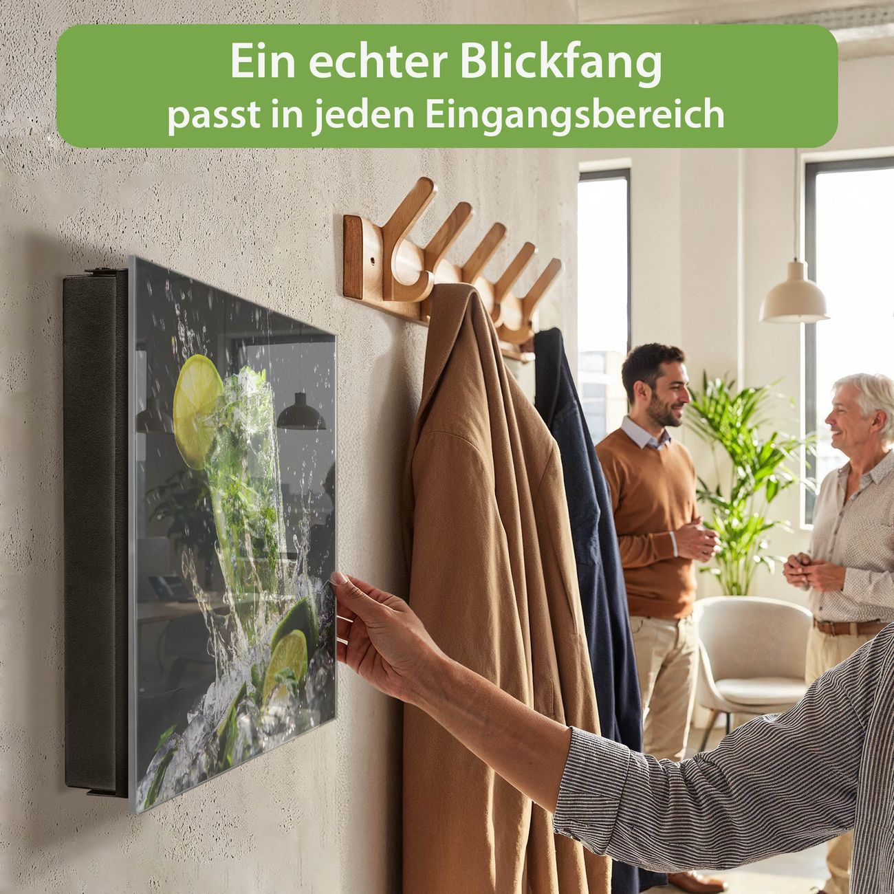 Bringe Ordnung und Eleganz in deinen Eingangsbereich mit dem banjado Schlüsselkasten Motiv Motiv Brasilianischer Cocktail. Die moderne Schlüsselbox kombiniert funktionales Design mit hochwertiger Verarbeitung und wird so zu einem echten Hingucker in Flur, Büro oder Ferienwohnung. ✅ Stilvolle Schlüsselaufbewahrung mit Glasfront im Motiv Motiv Brasilianischer Cocktail Der Design-Schlüsselkasten Motiv Motiv Brasilianischer Cocktail bietet Platz für bis zu 50 Schlüssel, die auf 5 stabilen Reihen mit je 10 Haken übersichtlich verstaut werden. Mit seinen kompakten Maßen von 30 x 30 x 5 cm passt die Schlüsselbox perfekt auch in kleinere Räume. Der schwarz lackierte Stahlkorpus mit rechts angeschlagenem Türscharnier harmoniert mit der Glasfront und fügt sich nahtlos in jedes Wohnambiente ein. Ob als Schlüsselorganizer für Zuhause oder als praktische Lösung für Büros, Praxen und Gewerbe, der banjado Schlüsselkasten sorgt für Ordnung und Übersicht. Dank der magnetischen, mit Kreidestiften beschreibbaren Glasfront kannst du Notizen anheften oder Termine direkt auf der Oberfläche festhalten. Die Schlüsselbox Motiv Motiv Brasilianischer Cocktail zur Wandmontage wird inklusive Befestigungsmaterial geliefert und ist schnell angebracht. So hast du deine Schlüssel jederzeit griffbereit und zugleich stilvoll verstaut. Mit diesem banjado Schlüsselkasten Motiv Motiv Brasilianischer Cocktail kombinierst du praktische Aufbewahrung mit stilvollem Wohndesign. Ob privat oder geschäftlich, die Schlüsselbox sorgt für mehr Ordnung, Übersicht und ein wohnliches Ambiente.Vorteile im Überblick
