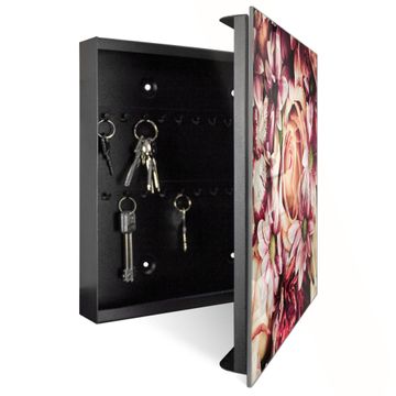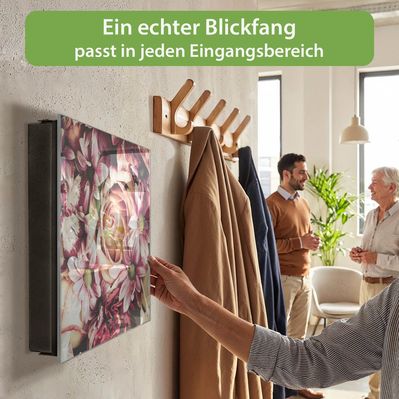 Bringe Ordnung und Eleganz in deinen Eingangsbereich mit dem banjado Schlüsselkasten Motiv Motiv Brautstrauss. Die moderne Schlüsselbox kombiniert funktionales Design mit hochwertiger Verarbeitung und wird so zu einem echten Hingucker in Flur, Büro oder Ferienwohnung. ✅ Stilvolle Schlüsselaufbewahrung mit Glasfront im Motiv Motiv Brautstrauss Der Design-Schlüsselkasten Motiv Motiv Brautstrauss bietet Platz für bis zu 50 Schlüssel, die auf 5 stabilen Reihen mit je 10 Haken übersichtlich verstaut werden. Mit seinen kompakten Maßen von 30 x 30 x 5 cm passt die Schlüsselbox perfekt auch in kleinere Räume. Der schwarz lackierte Stahlkorpus mit rechts angeschlagenem Türscharnier harmoniert mit der Glasfront und fügt sich nahtlos in jedes Wohnambiente ein. Ob als Schlüsselorganizer für Zuhause oder als praktische Lösung für Büros, Praxen und Gewerbe, der banjado Schlüsselkasten sorgt für Ordnung und Übersicht. Dank der magnetischen, mit Kreidestiften beschreibbaren Glasfront kannst du Notizen anheften oder Termine direkt auf der Oberfläche festhalten. Die Schlüsselbox Motiv Motiv Brautstrauss zur Wandmontage wird inklusive Befestigungsmaterial geliefert und ist schnell angebracht. So hast du deine Schlüssel jederzeit griffbereit und zugleich stilvoll verstaut. Mit diesem banjado Schlüsselkasten Motiv Motiv Brautstrauss kombinierst du praktische Aufbewahrung mit stilvollem Wohndesign. Ob privat oder geschäftlich, die Schlüsselbox sorgt für mehr Ordnung, Übersicht und ein wohnliches Ambiente.Vorteile im Überblick