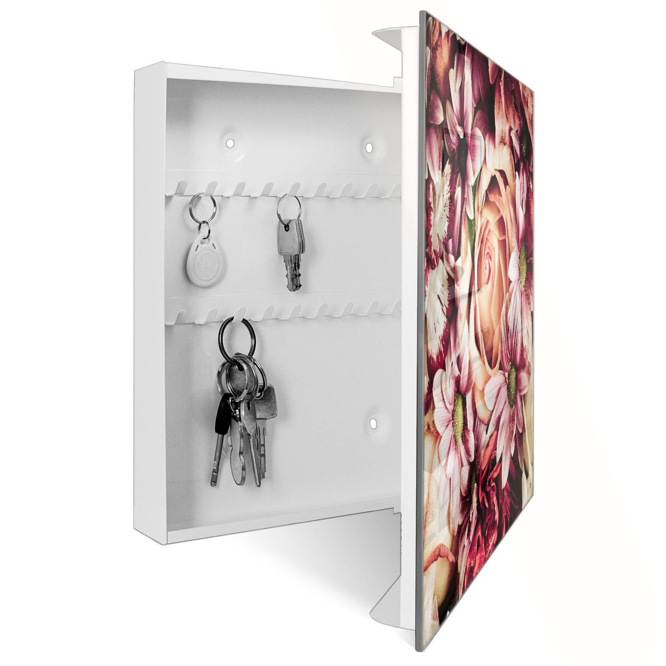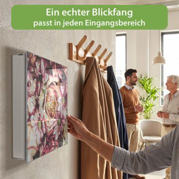 Bringe Ordnung und Eleganz in deinen Eingangsbereich mit dem banjado Schlüsselkasten Motiv Motiv Brautstrauss. Die moderne Schlüsselbox kombiniert funktionales Design mit hochwertiger Verarbeitung und wird so zu einem echten Hingucker in Flur, Büro oder Ferienwohnung. ✅ Stilvolle Schlüsselaufbewahrung mit Glasfront im Motiv Motiv Brautstrauss Der Design-Schlüsselkasten Motiv Motiv Brautstrauss bietet Platz für bis zu 50 Schlüssel, die auf 5 stabilen Reihen mit je 10 Haken übersichtlich verstaut werden. Mit seinen kompakten Maßen von 30 x 30 x 5 cm passt die Schlüsselbox perfekt auch in kleinere Räume. Der weiß lackierte Stahlkorpus mit rechts angeschlagenem Türscharnier harmoniert mit der Glasfront und fügt sich nahtlos in jedes Wohnambiente ein. Ob als Schlüsselorganizer für Zuhause oder als praktische Lösung für Büros, Praxen und Gewerbe, der banjado Schlüsselkasten sorgt für Ordnung und Übersicht. Dank der magnetischen, mit Kreidestiften beschreibbaren Glasfront kannst du Notizen anheften oder Termine direkt auf der Oberfläche festhalten. Die Schlüsselbox Motiv Motiv Brautstrauss zur Wandmontage wird inklusive Befestigungsmaterial geliefert und ist schnell angebracht. So hast du deine Schlüssel jederzeit griffbereit und zugleich stilvoll verstaut. Mit diesem banjado Schlüsselkasten Motiv Motiv Brautstrauss kombinierst du praktische Aufbewahrung mit stilvollem Wohndesign. Ob privat oder geschäftlich, die Schlüsselbox sorgt für mehr Ordnung, Übersicht und ein wohnliches Ambiente.Vorteile im Überblick
