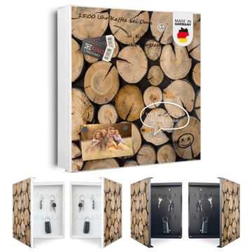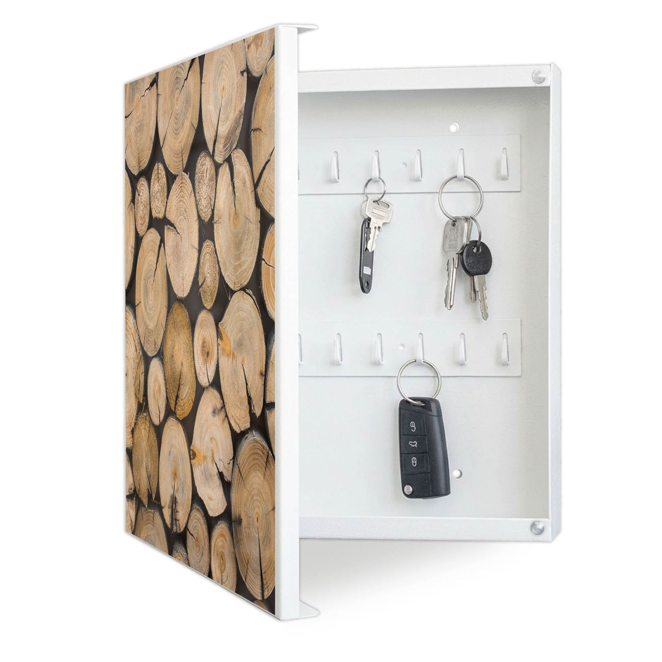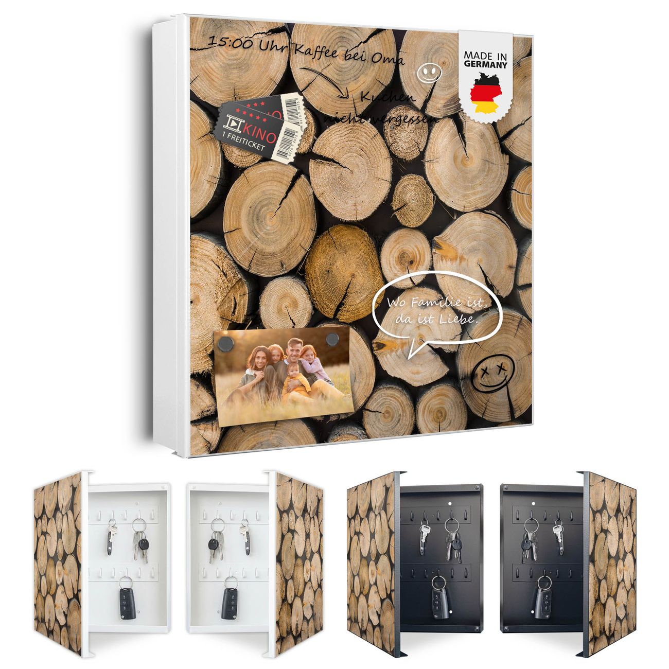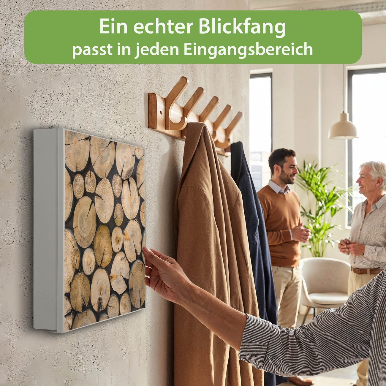 Bringe Ordnung und Eleganz in deinen Eingangsbereich mit dem banjado Schlüsselkasten Motiv Motiv Brennholz. Die moderne Schlüsselbox kombiniert funktionales Design mit hochwertiger Verarbeitung und wird so zu einem echten Hingucker in Flur, Büro oder Ferienwohnung. ✅ Stilvolle Schlüsselaufbewahrung mit Motiv Motiv Brennholz Der Design-Schlüsselkasten Motiv Motiv Brennholz bietet Platz für bis zu 32 Schlüssel, die auf 4 stabilen Reihen mit je 8 Haken übersichtlich verstaut werden. Mit seinen kompakten Maßen von 30 x 30 x 5 cm passt die Schlüsselbox perfekt auch in kleinere Räume. Der weiß lackierte Stahlkorpus mit links angeschlagenem Türscharnier harmoniert mit gedruckten Folie auf der Front und fügt sich nahtlos in jedes Wohnambiente ein. Ob als Schlüsselorganizer für Zuhause oder als praktische Lösung für Büros, Praxen und Gewerbe, der banjado Schlüsselkasten sorgt für Ordnung und Übersicht. Dank der magnetischen, mit Kreidestiften beschreibbaren Folie auf der Front kannst du Notizen anheften oder Termine direkt auf der Oberfläche festhalten. Die Schlüsselbox Motiv Motiv Brennholz zur Wandmontage wird inklusive Befestigungsmaterial geliefert und ist schnell angebracht. So hast du deine Schlüssel jederzeit griffbereit und zugleich stilvoll verstaut. Mit diesem banjado Schlüsselkasten Motiv Motiv Brennholz kombinierst du praktische Aufbewahrung mit stilvollem Wohndesign. Ob privat oder geschäftlich, die Schlüsselbox sorgt für mehr Ordnung, Übersicht und ein wohnliches Ambiente.Vorteile im Überblick