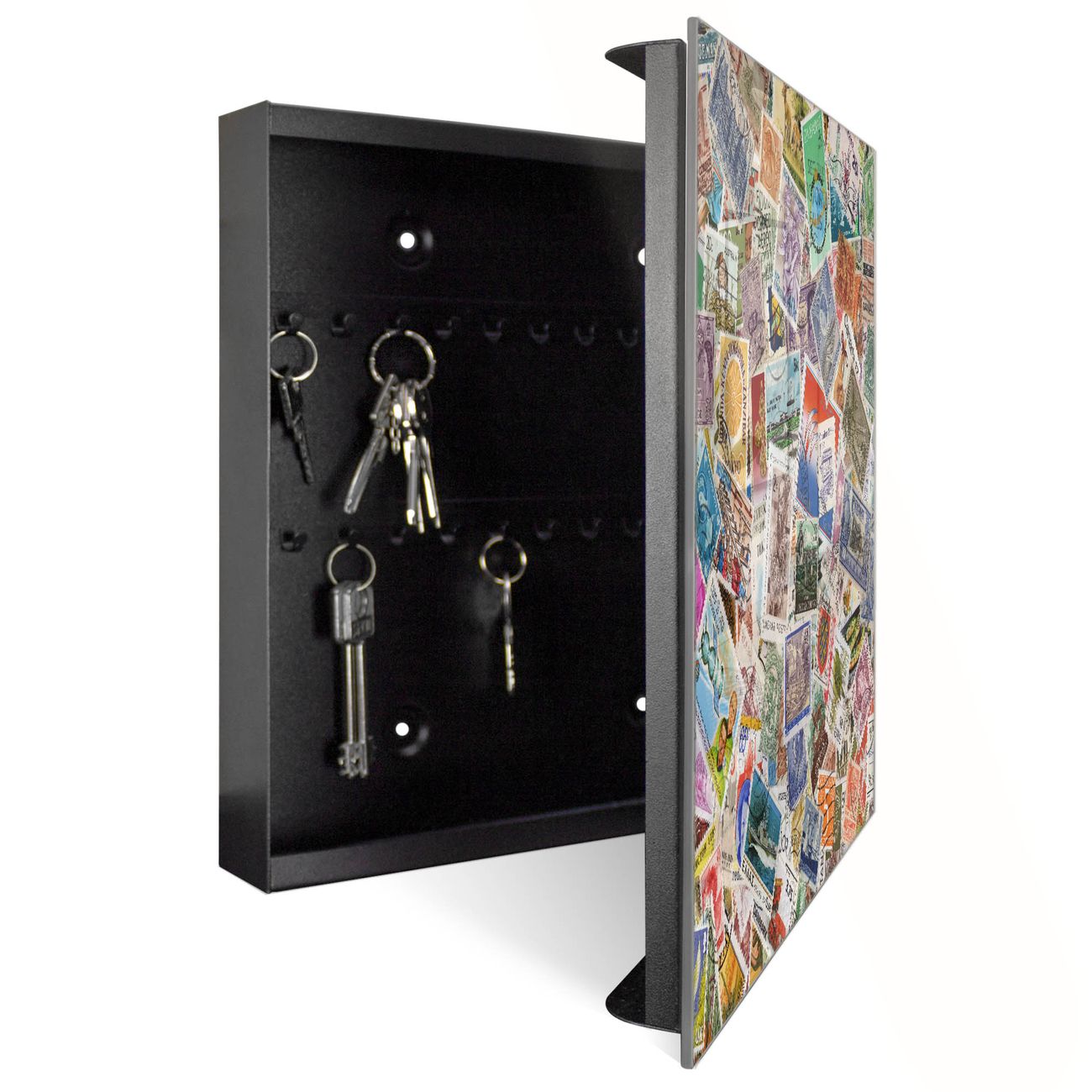 Bringe Ordnung und Eleganz in deinen Eingangsbereich mit dem banjado Schlüsselkasten Motiv Motiv Briefmarken. Die moderne Schlüsselbox kombiniert funktionales Design mit hochwertiger Verarbeitung und wird so zu einem echten Hingucker in Flur, Büro oder Ferienwohnung. ✅ Stilvolle Schlüsselaufbewahrung mit Glasfront im Motiv Motiv Briefmarken Der Design-Schlüsselkasten Motiv Motiv Briefmarken bietet Platz für bis zu 50 Schlüssel, die auf 5 stabilen Reihen mit je 10 Haken übersichtlich verstaut werden. Mit seinen kompakten Maßen von 30 x 30 x 5 cm passt die Schlüsselbox perfekt auch in kleinere Räume. Der schwarz lackierte Stahlkorpus mit rechts angeschlagenem Türscharnier harmoniert mit der Glasfront und fügt sich nahtlos in jedes Wohnambiente ein. Ob als Schlüsselorganizer für Zuhause oder als praktische Lösung für Büros, Praxen und Gewerbe, der banjado Schlüsselkasten sorgt für Ordnung und Übersicht. Dank der magnetischen, mit Kreidestiften beschreibbaren Glasfront kannst du Notizen anheften oder Termine direkt auf der Oberfläche festhalten. Die Schlüsselbox Motiv Motiv Briefmarken zur Wandmontage wird inklusive Befestigungsmaterial geliefert und ist schnell angebracht. So hast du deine Schlüssel jederzeit griffbereit und zugleich stilvoll verstaut. Mit diesem banjado Schlüsselkasten Motiv Motiv Briefmarken kombinierst du praktische Aufbewahrung mit stilvollem Wohndesign. Ob privat oder geschäftlich, die Schlüsselbox sorgt für mehr Ordnung, Übersicht und ein wohnliches Ambiente.Vorteile im Überblick