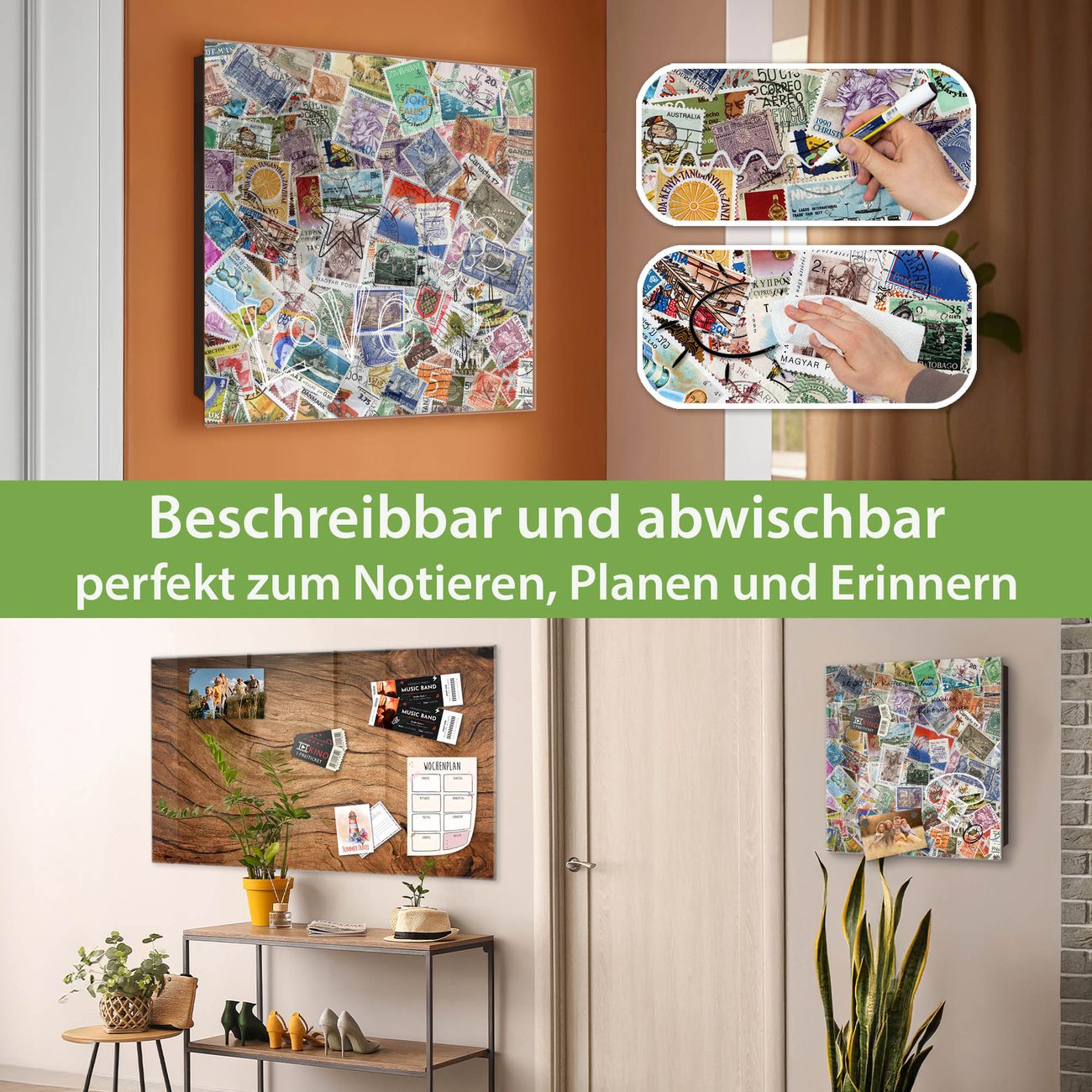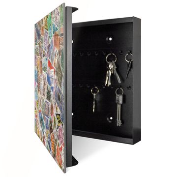 Bringe Ordnung und Eleganz in deinen Eingangsbereich mit dem banjado Schlüsselkasten Motiv Motiv Briefmarken. Die moderne Schlüsselbox kombiniert funktionales Design mit hochwertiger Verarbeitung und wird so zu einem echten Hingucker in Flur, Büro oder Ferienwohnung. ✅ Stilvolle Schlüsselaufbewahrung mit Glasfront im Motiv Motiv Briefmarken Der Design-Schlüsselkasten Motiv Motiv Briefmarken bietet Platz für bis zu 50 Schlüssel, die auf 5 stabilen Reihen mit je 10 Haken übersichtlich verstaut werden. Mit seinen kompakten Maßen von 30 x 30 x 5 cm passt die Schlüsselbox perfekt auch in kleinere Räume. Der schwarz lackierte Stahlkorpus mit rechts angeschlagenem Türscharnier harmoniert mit der Glasfront und fügt sich nahtlos in jedes Wohnambiente ein. Ob als Schlüsselorganizer für Zuhause oder als praktische Lösung für Büros, Praxen und Gewerbe, der banjado Schlüsselkasten sorgt für Ordnung und Übersicht. Dank der magnetischen, mit Kreidestiften beschreibbaren Glasfront kannst du Notizen anheften oder Termine direkt auf der Oberfläche festhalten. Die Schlüsselbox Motiv Motiv Briefmarken zur Wandmontage wird inklusive Befestigungsmaterial geliefert und ist schnell angebracht. So hast du deine Schlüssel jederzeit griffbereit und zugleich stilvoll verstaut. Mit diesem banjado Schlüsselkasten Motiv Motiv Briefmarken kombinierst du praktische Aufbewahrung mit stilvollem Wohndesign. Ob privat oder geschäftlich, die Schlüsselbox sorgt für mehr Ordnung, Übersicht und ein wohnliches Ambiente.Vorteile im Überblick
