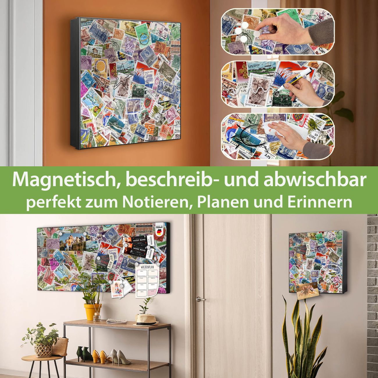 Bringe Ordnung und Eleganz in deinen Eingangsbereich mit dem banjado Schlüsselkasten Motiv Motiv Briefmarken. Die moderne Schlüsselbox kombiniert funktionales Design mit hochwertiger Verarbeitung und wird so zu einem echten Hingucker in Flur, Büro oder Ferienwohnung. ✅ Stilvolle Schlüsselaufbewahrung mit Motiv Motiv Briefmarken Der Design-Schlüsselkasten Motiv Motiv Briefmarken bietet Platz für bis zu 32 Schlüssel, die auf 4 stabilen Reihen mit je 8 Haken übersichtlich verstaut werden. Mit seinen kompakten Maßen von 30 x 30 x 5 cm passt die Schlüsselbox perfekt auch in kleinere Räume. Der schwarz lackierte Stahlkorpus mit links angeschlagenem Türscharnier harmoniert mit gedruckten Folie auf der Front und fügt sich nahtlos in jedes Wohnambiente ein. Ob als Schlüsselorganizer für Zuhause oder als praktische Lösung für Büros, Praxen und Gewerbe, der banjado Schlüsselkasten sorgt für Ordnung und Übersicht. Dank der magnetischen, mit Kreidestiften beschreibbaren Folie auf der Front kannst du Notizen anheften oder Termine direkt auf der Oberfläche festhalten. Die Schlüsselbox Motiv Motiv Briefmarken zur Wandmontage wird inklusive Befestigungsmaterial geliefert und ist schnell angebracht. So hast du deine Schlüssel jederzeit griffbereit und zugleich stilvoll verstaut. Mit diesem banjado Schlüsselkasten Motiv Motiv Briefmarken kombinierst du praktische Aufbewahrung mit stilvollem Wohndesign. Ob privat oder geschäftlich, die Schlüsselbox sorgt für mehr Ordnung, Übersicht und ein wohnliches Ambiente.Vorteile im Überblick