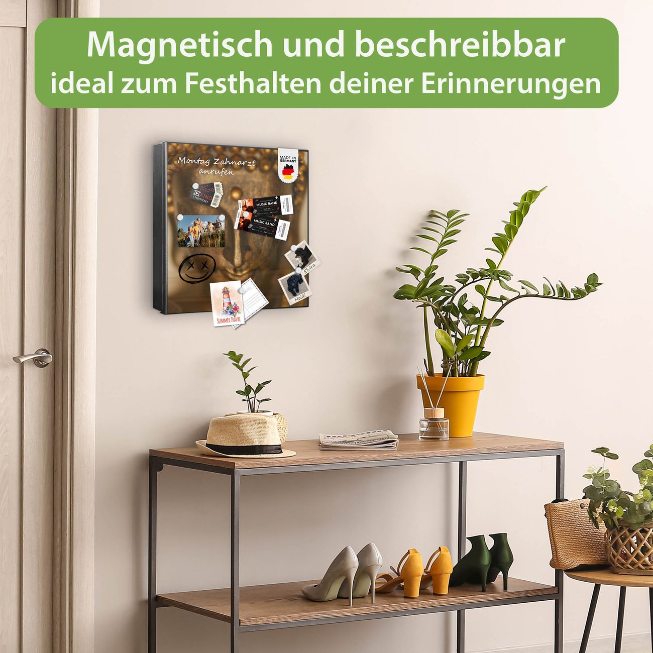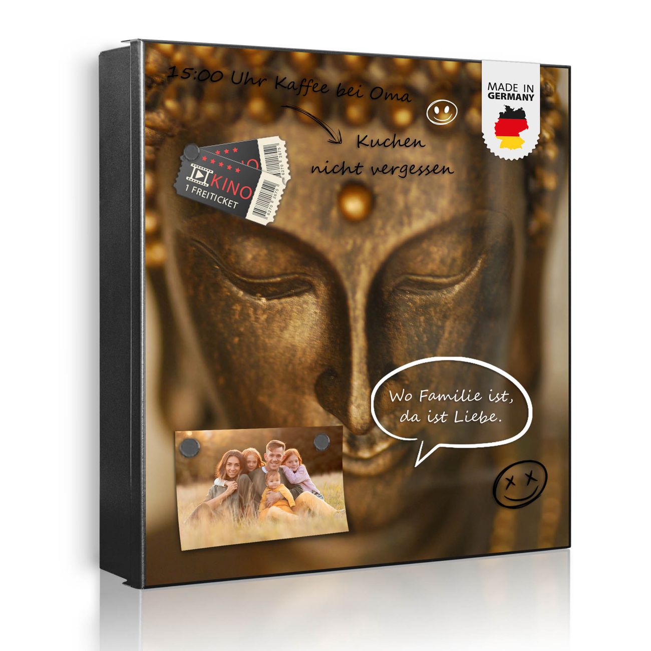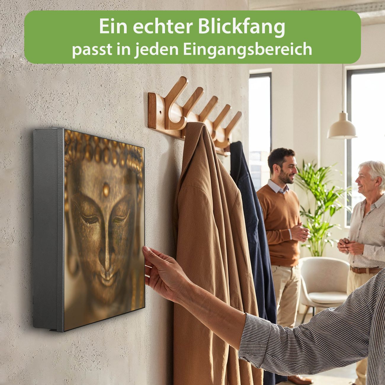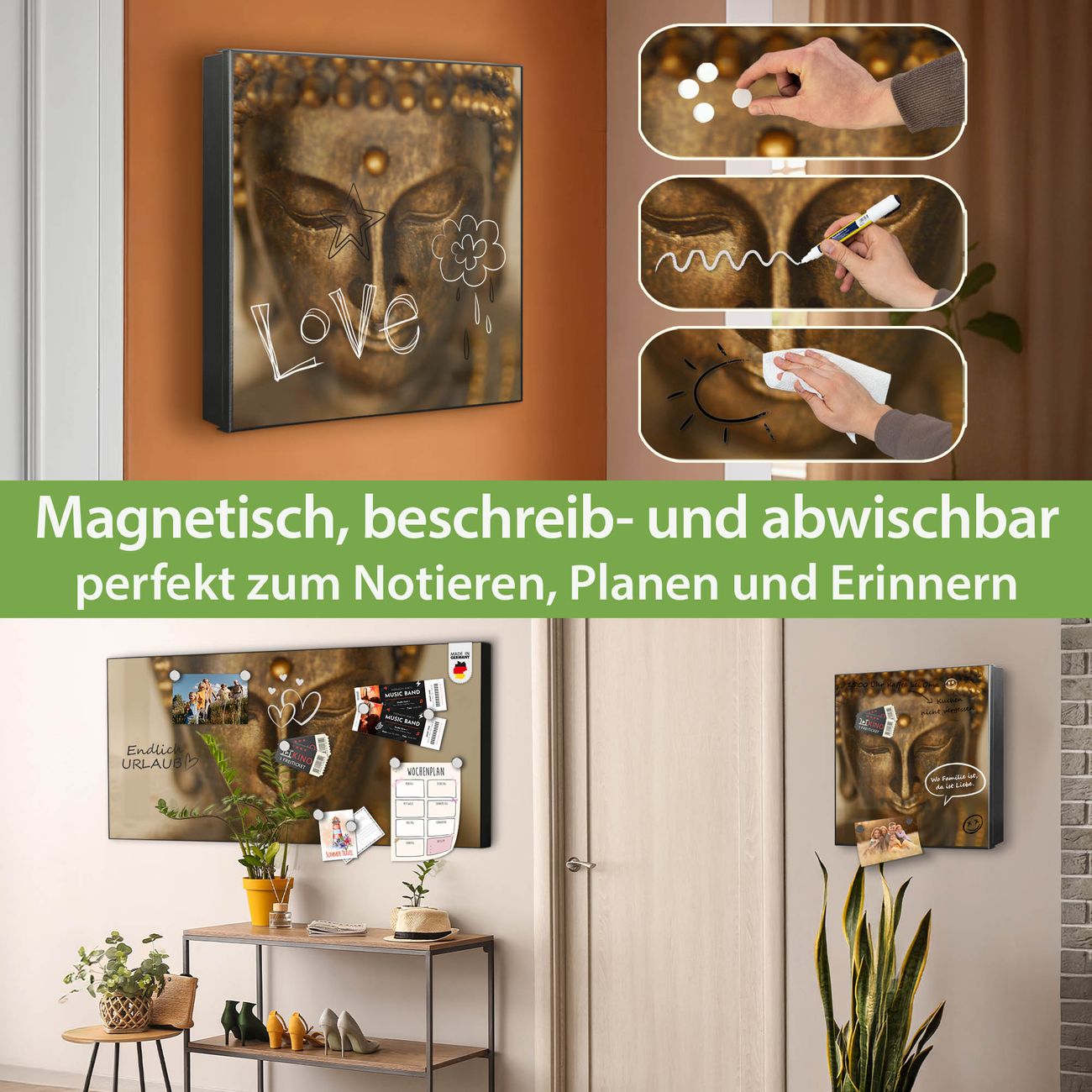 Bringe Ordnung und Eleganz in deinen Eingangsbereich mit dem banjado Schlüsselkasten Motiv Motiv Buddha Gold. Die moderne Schlüsselbox kombiniert funktionales Design mit hochwertiger Verarbeitung und wird so zu einem echten Hingucker in Flur, Büro oder Ferienwohnung. ✅ Stilvolle Schlüsselaufbewahrung mit Motiv Motiv Buddha Gold Der Design-Schlüsselkasten Motiv Motiv Buddha Gold bietet Platz für bis zu 32 Schlüssel, die auf 4 stabilen Reihen mit je 8 Haken übersichtlich verstaut werden. Mit seinen kompakten Maßen von 30 x 30 x 5 cm passt die Schlüsselbox perfekt auch in kleinere Räume. Der schwarz lackierte Stahlkorpus mit rechts angeschlagenem Türscharnier harmoniert mit gedruckten Folie auf der Front und fügt sich nahtlos in jedes Wohnambiente ein. Ob als Schlüsselorganizer für Zuhause oder als praktische Lösung für Büros, Praxen und Gewerbe, der banjado Schlüsselkasten sorgt für Ordnung und Übersicht. Dank der magnetischen, mit Kreidestiften beschreibbaren Folie auf der Front kannst du Notizen anheften oder Termine direkt auf der Oberfläche festhalten. Die Schlüsselbox Motiv Motiv Buddha Gold zur Wandmontage wird inklusive Befestigungsmaterial geliefert und ist schnell angebracht. So hast du deine Schlüssel jederzeit griffbereit und zugleich stilvoll verstaut. Mit diesem banjado Schlüsselkasten Motiv Motiv Buddha Gold kombinierst du praktische Aufbewahrung mit stilvollem Wohndesign. Ob privat oder geschäftlich, die Schlüsselbox sorgt für mehr Ordnung, Übersicht und ein wohnliches Ambiente.Vorteile im Überblick