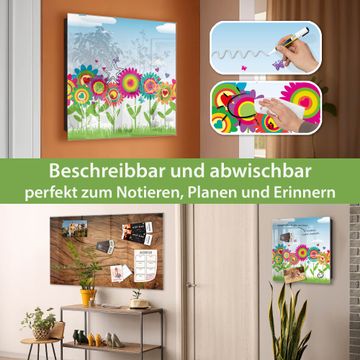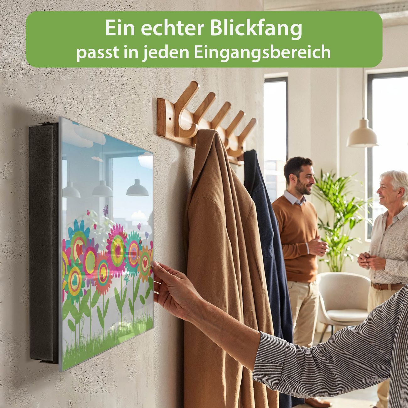 Bringe Ordnung und Eleganz in deinen Eingangsbereich mit dem banjado Schlüsselkasten Motiv Motiv Bunte Blumen. Die moderne Schlüsselbox kombiniert funktionales Design mit hochwertiger Verarbeitung und wird so zu einem echten Hingucker in Flur, Büro oder Ferienwohnung. ✅ Stilvolle Schlüsselaufbewahrung mit Glasfront im Motiv Motiv Bunte Blumen Der Design-Schlüsselkasten Motiv Motiv Bunte Blumen bietet Platz für bis zu 50 Schlüssel, die auf 5 stabilen Reihen mit je 10 Haken übersichtlich verstaut werden. Mit seinen kompakten Maßen von 30 x 30 x 5 cm passt die Schlüsselbox perfekt auch in kleinere Räume. Der schwarz lackierte Stahlkorpus mit rechts angeschlagenem Türscharnier harmoniert mit der Glasfront und fügt sich nahtlos in jedes Wohnambiente ein. Ob als Schlüsselorganizer für Zuhause oder als praktische Lösung für Büros, Praxen und Gewerbe, der banjado Schlüsselkasten sorgt für Ordnung und Übersicht. Dank der magnetischen, mit Kreidestiften beschreibbaren Glasfront kannst du Notizen anheften oder Termine direkt auf der Oberfläche festhalten. Die Schlüsselbox Motiv Motiv Bunte Blumen zur Wandmontage wird inklusive Befestigungsmaterial geliefert und ist schnell angebracht. So hast du deine Schlüssel jederzeit griffbereit und zugleich stilvoll verstaut. Mit diesem banjado Schlüsselkasten Motiv Motiv Bunte Blumen kombinierst du praktische Aufbewahrung mit stilvollem Wohndesign. Ob privat oder geschäftlich, die Schlüsselbox sorgt für mehr Ordnung, Übersicht und ein wohnliches Ambiente.Vorteile im Überblick