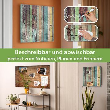 Bringe Ordnung und Eleganz in deinen Eingangsbereich mit dem banjado Schlüsselkasten Motiv Motiv Bunte Bretterwand. Die moderne Schlüsselbox kombiniert funktionales Design mit hochwertiger Verarbeitung und wird so zu einem echten Hingucker in Flur, Büro oder Ferienwohnung. ✅ Stilvolle Schlüsselaufbewahrung mit Glasfront im Motiv Motiv Bunte Bretterwand Der Design-Schlüsselkasten Motiv Motiv Bunte Bretterwand bietet Platz für bis zu 50 Schlüssel, die auf 5 stabilen Reihen mit je 10 Haken übersichtlich verstaut werden. Mit seinen kompakten Maßen von 30 x 30 x 5 cm passt die Schlüsselbox perfekt auch in kleinere Räume. Der schwarz lackierte Stahlkorpus mit rechts angeschlagenem Türscharnier harmoniert mit der Glasfront und fügt sich nahtlos in jedes Wohnambiente ein. Ob als Schlüsselorganizer für Zuhause oder als praktische Lösung für Büros, Praxen und Gewerbe, der banjado Schlüsselkasten sorgt für Ordnung und Übersicht. Dank der magnetischen, mit Kreidestiften beschreibbaren Glasfront kannst du Notizen anheften oder Termine direkt auf der Oberfläche festhalten. Die Schlüsselbox Motiv Motiv Bunte Bretterwand zur Wandmontage wird inklusive Befestigungsmaterial geliefert und ist schnell angebracht. So hast du deine Schlüssel jederzeit griffbereit und zugleich stilvoll verstaut. Mit diesem banjado Schlüsselkasten Motiv Motiv Bunte Bretterwand kombinierst du praktische Aufbewahrung mit stilvollem Wohndesign. Ob privat oder geschäftlich, die Schlüsselbox sorgt für mehr Ordnung, Übersicht und ein wohnliches Ambiente.Vorteile im Überblick