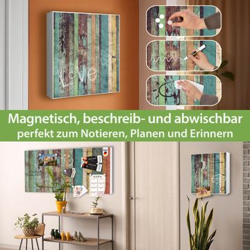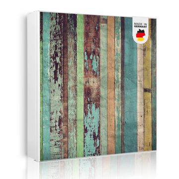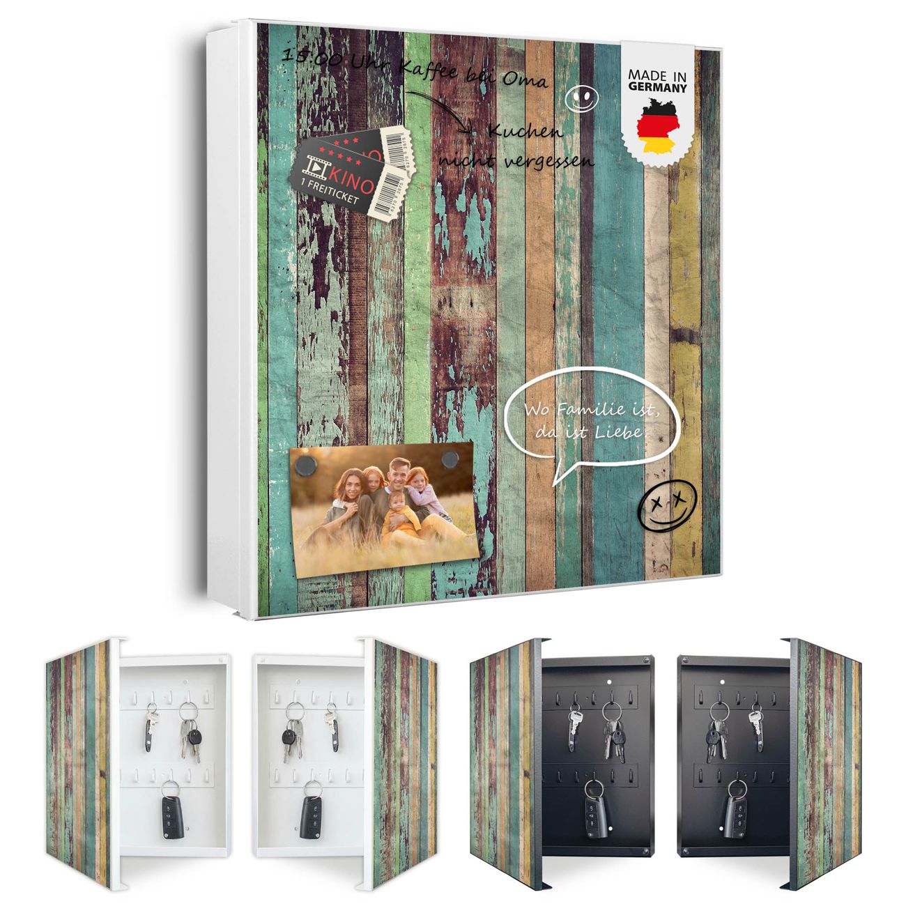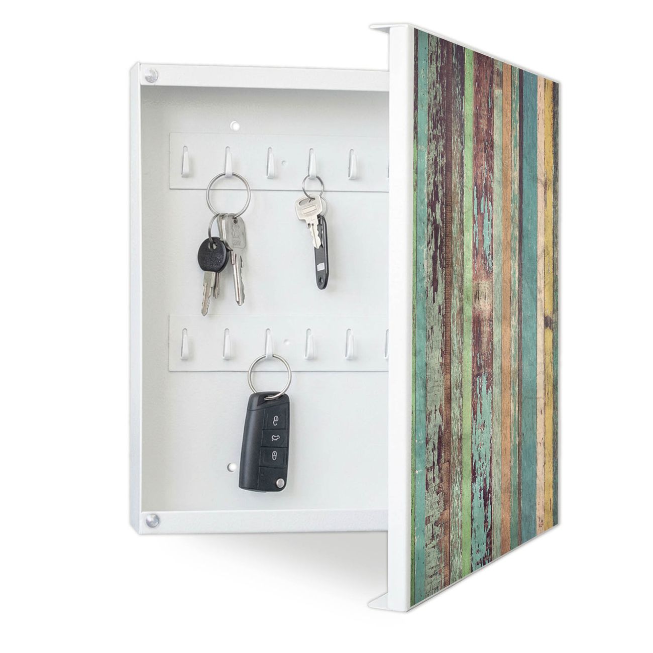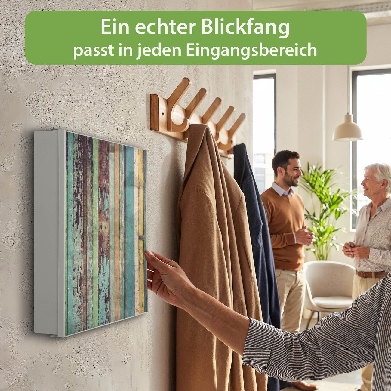 Bringe Ordnung und Eleganz in deinen Eingangsbereich mit dem banjado Schlüsselkasten Motiv Motiv Bunte Bretterwand. Die moderne Schlüsselbox kombiniert funktionales Design mit hochwertiger Verarbeitung und wird so zu einem echten Hingucker in Flur, Büro oder Ferienwohnung. ✅ Stilvolle Schlüsselaufbewahrung mit Motiv Motiv Bunte Bretterwand Der Design-Schlüsselkasten Motiv Motiv Bunte Bretterwand bietet Platz für bis zu 32 Schlüssel, die auf 4 stabilen Reihen mit je 8 Haken übersichtlich verstaut werden. Mit seinen kompakten Maßen von 30 x 30 x 5 cm passt die Schlüsselbox perfekt auch in kleinere Räume. Der weiß lackierte Stahlkorpus mit rechts angeschlagenem Türscharnier harmoniert mit gedruckten Folie auf der Front und fügt sich nahtlos in jedes Wohnambiente ein. Ob als Schlüsselorganizer für Zuhause oder als praktische Lösung für Büros, Praxen und Gewerbe, der banjado Schlüsselkasten sorgt für Ordnung und Übersicht. Dank der magnetischen, mit Kreidestiften beschreibbaren Folie auf der Front kannst du Notizen anheften oder Termine direkt auf der Oberfläche festhalten. Die Schlüsselbox Motiv Motiv Bunte Bretterwand zur Wandmontage wird inklusive Befestigungsmaterial geliefert und ist schnell angebracht. So hast du deine Schlüssel jederzeit griffbereit und zugleich stilvoll verstaut. Mit diesem banjado Schlüsselkasten Motiv Motiv Bunte Bretterwand kombinierst du praktische Aufbewahrung mit stilvollem Wohndesign. Ob privat oder geschäftlich, die Schlüsselbox sorgt für mehr Ordnung, Übersicht und ein wohnliches Ambiente.Vorteile im Überblick
