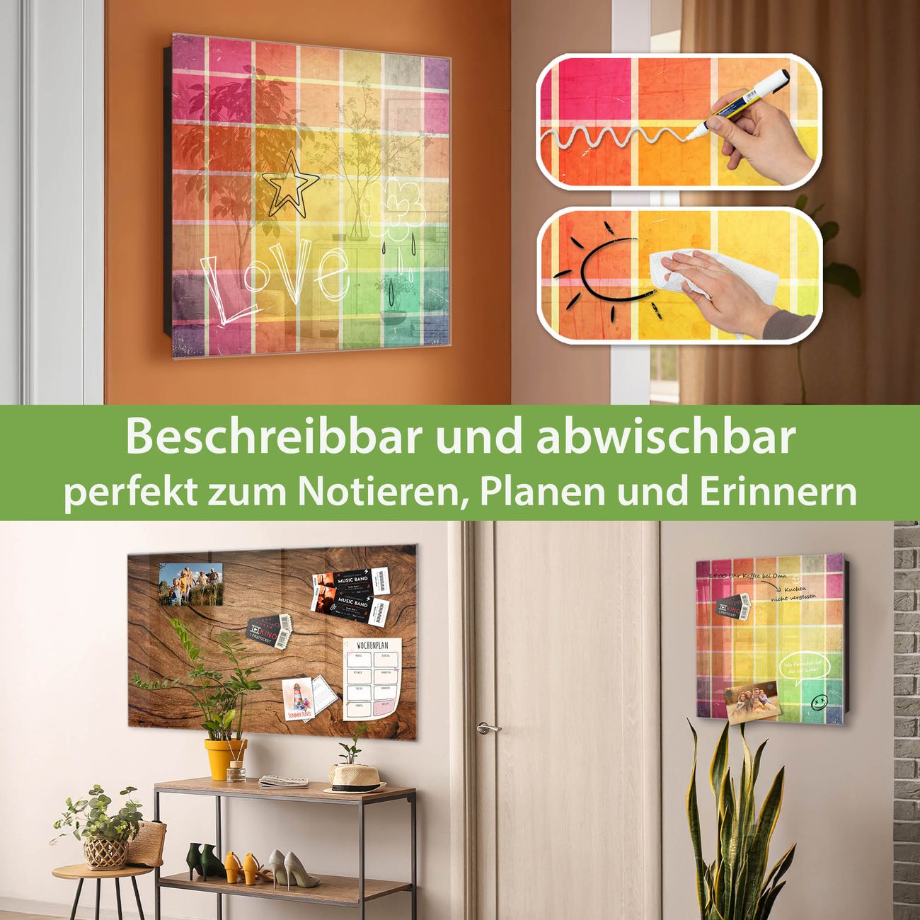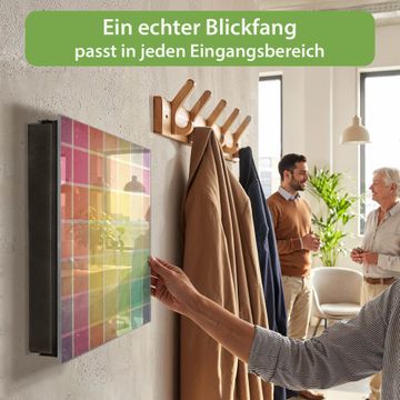 Bringe Ordnung und Eleganz in deinen Eingangsbereich mit dem banjado Schlüsselkasten Motiv Motiv Bunte Glasbausteine. Die moderne Schlüsselbox kombiniert funktionales Design mit hochwertiger Verarbeitung und wird so zu einem echten Hingucker in Flur, Büro oder Ferienwohnung. ✅ Stilvolle Schlüsselaufbewahrung mit Glasfront im Motiv Motiv Bunte Glasbausteine Der Design-Schlüsselkasten Motiv Motiv Bunte Glasbausteine bietet Platz für bis zu 50 Schlüssel, die auf 5 stabilen Reihen mit je 10 Haken übersichtlich verstaut werden. Mit seinen kompakten Maßen von 30 x 30 x 5 cm passt die Schlüsselbox perfekt auch in kleinere Räume. Der schwarz lackierte Stahlkorpus mit rechts angeschlagenem Türscharnier harmoniert mit der Glasfront und fügt sich nahtlos in jedes Wohnambiente ein. Ob als Schlüsselorganizer für Zuhause oder als praktische Lösung für Büros, Praxen und Gewerbe, der banjado Schlüsselkasten sorgt für Ordnung und Übersicht. Dank der magnetischen, mit Kreidestiften beschreibbaren Glasfront kannst du Notizen anheften oder Termine direkt auf der Oberfläche festhalten. Die Schlüsselbox Motiv Motiv Bunte Glasbausteine zur Wandmontage wird inklusive Befestigungsmaterial geliefert und ist schnell angebracht. So hast du deine Schlüssel jederzeit griffbereit und zugleich stilvoll verstaut. Mit diesem banjado Schlüsselkasten Motiv Motiv Bunte Glasbausteine kombinierst du praktische Aufbewahrung mit stilvollem Wohndesign. Ob privat oder geschäftlich, die Schlüsselbox sorgt für mehr Ordnung, Übersicht und ein wohnliches Ambiente.Vorteile im Überblick