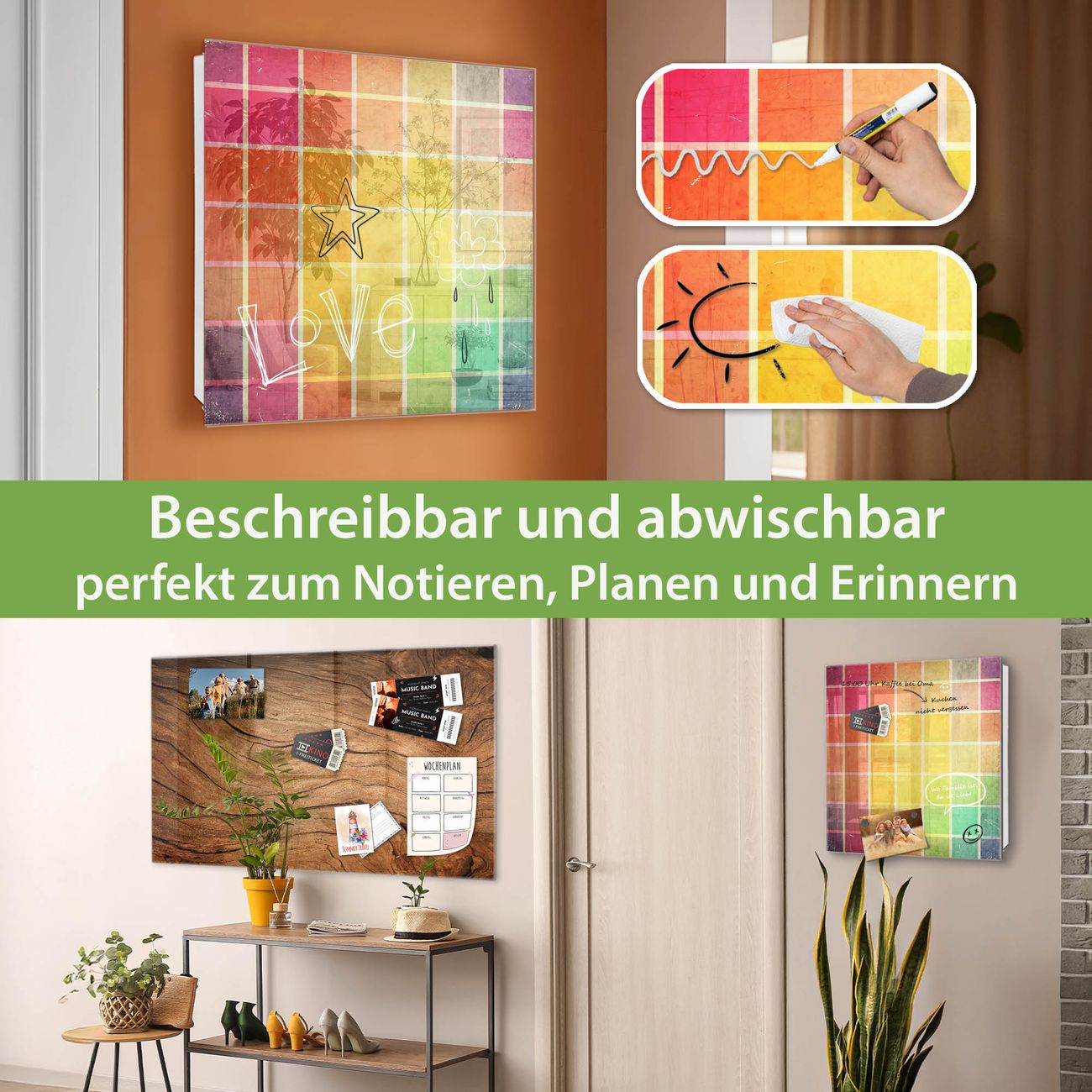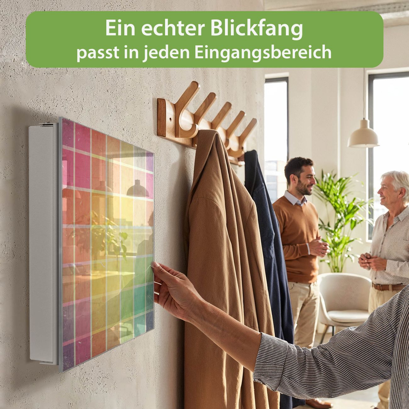 Bringe Ordnung und Eleganz in deinen Eingangsbereich mit dem banjado Schlüsselkasten Motiv Motiv Bunte Glasbausteine. Die moderne Schlüsselbox kombiniert funktionales Design mit hochwertiger Verarbeitung und wird so zu einem echten Hingucker in Flur, Büro oder Ferienwohnung. ✅ Stilvolle Schlüsselaufbewahrung mit Glasfront im Motiv Motiv Bunte Glasbausteine Der Design-Schlüsselkasten Motiv Motiv Bunte Glasbausteine bietet Platz für bis zu 50 Schlüssel, die auf 5 stabilen Reihen mit je 10 Haken übersichtlich verstaut werden. Mit seinen kompakten Maßen von 30 x 30 x 5 cm passt die Schlüsselbox perfekt auch in kleinere Räume. Der weiß lackierte Stahlkorpus mit rechts angeschlagenem Türscharnier harmoniert mit der Glasfront und fügt sich nahtlos in jedes Wohnambiente ein. Ob als Schlüsselorganizer für Zuhause oder als praktische Lösung für Büros, Praxen und Gewerbe, der banjado Schlüsselkasten sorgt für Ordnung und Übersicht. Dank der magnetischen, mit Kreidestiften beschreibbaren Glasfront kannst du Notizen anheften oder Termine direkt auf der Oberfläche festhalten. Die Schlüsselbox Motiv Motiv Bunte Glasbausteine zur Wandmontage wird inklusive Befestigungsmaterial geliefert und ist schnell angebracht. So hast du deine Schlüssel jederzeit griffbereit und zugleich stilvoll verstaut. Mit diesem banjado Schlüsselkasten Motiv Motiv Bunte Glasbausteine kombinierst du praktische Aufbewahrung mit stilvollem Wohndesign. Ob privat oder geschäftlich, die Schlüsselbox sorgt für mehr Ordnung, Übersicht und ein wohnliches Ambiente.Vorteile im Überblick