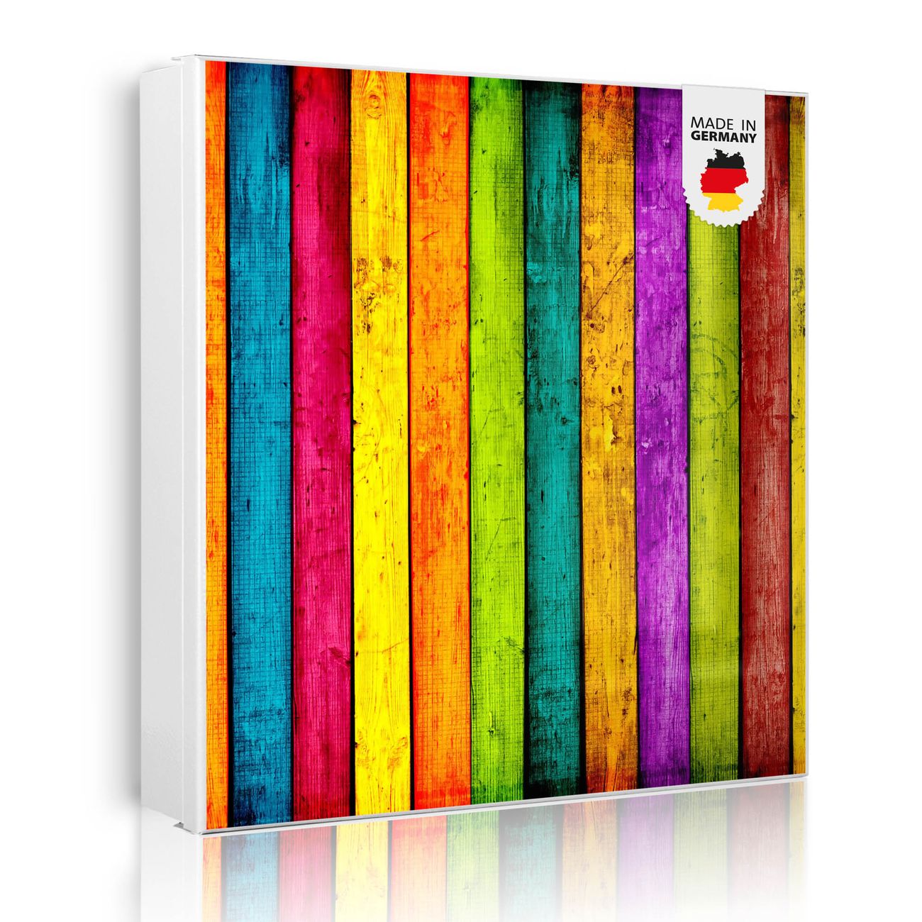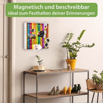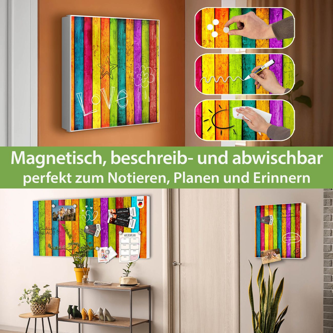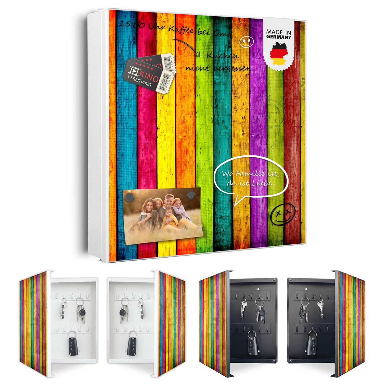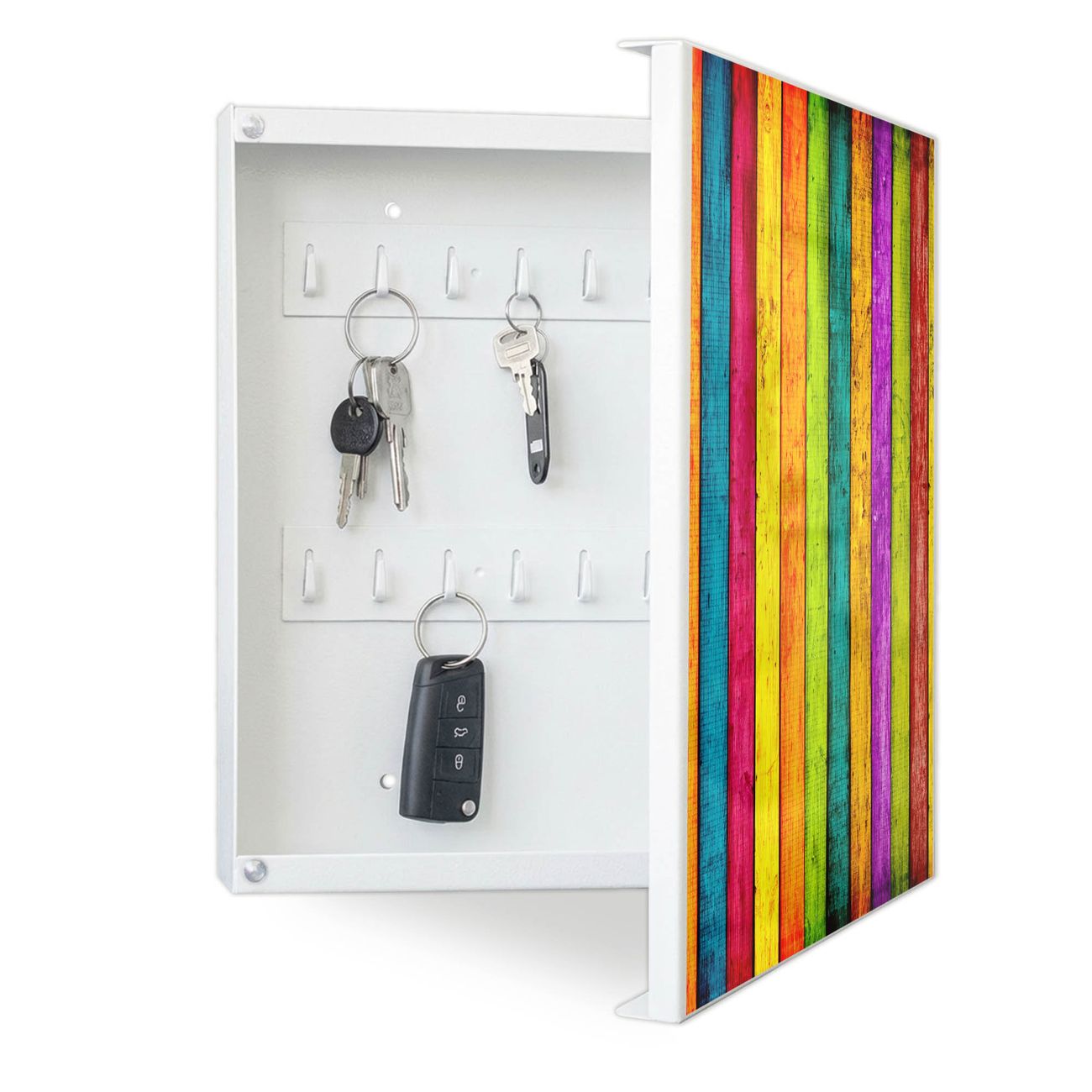 Bringe Ordnung und Eleganz in deinen Eingangsbereich mit dem banjado Schlüsselkasten Motiv Motiv Bunte Holzlatten. Die moderne Schlüsselbox kombiniert funktionales Design mit hochwertiger Verarbeitung und wird so zu einem echten Hingucker in Flur, Büro oder Ferienwohnung. ✅ Stilvolle Schlüsselaufbewahrung mit Motiv Motiv Bunte Holzlatten Der Design-Schlüsselkasten Motiv Motiv Bunte Holzlatten bietet Platz für bis zu 32 Schlüssel, die auf 4 stabilen Reihen mit je 8 Haken übersichtlich verstaut werden. Mit seinen kompakten Maßen von 30 x 30 x 5 cm passt die Schlüsselbox perfekt auch in kleinere Räume. Der weiß lackierte Stahlkorpus mit rechts angeschlagenem Türscharnier harmoniert mit gedruckten Folie auf der Front und fügt sich nahtlos in jedes Wohnambiente ein. Ob als Schlüsselorganizer für Zuhause oder als praktische Lösung für Büros, Praxen und Gewerbe, der banjado Schlüsselkasten sorgt für Ordnung und Übersicht. Dank der magnetischen, mit Kreidestiften beschreibbaren Folie auf der Front kannst du Notizen anheften oder Termine direkt auf der Oberfläche festhalten. Die Schlüsselbox Motiv Motiv Bunte Holzlatten zur Wandmontage wird inklusive Befestigungsmaterial geliefert und ist schnell angebracht. So hast du deine Schlüssel jederzeit griffbereit und zugleich stilvoll verstaut. Mit diesem banjado Schlüsselkasten Motiv Motiv Bunte Holzlatten kombinierst du praktische Aufbewahrung mit stilvollem Wohndesign. Ob privat oder geschäftlich, die Schlüsselbox sorgt für mehr Ordnung, Übersicht und ein wohnliches Ambiente.Vorteile im Überblick