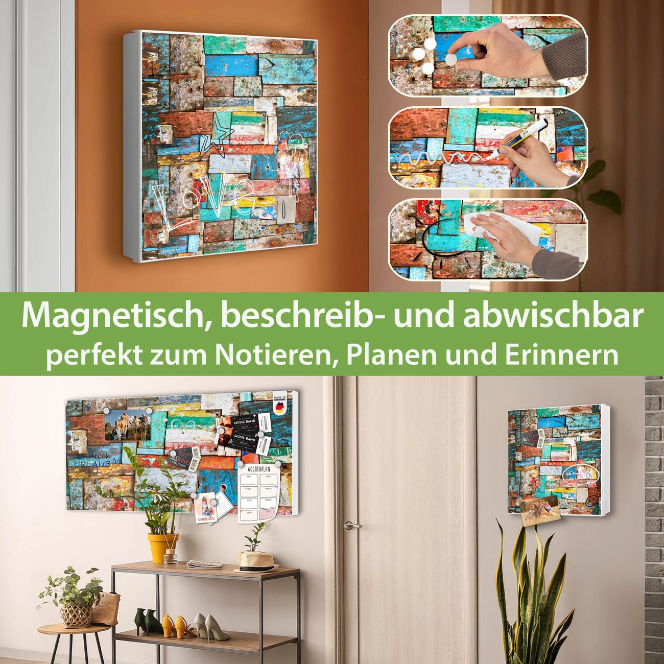 Bringe Ordnung und Eleganz in deinen Eingangsbereich mit dem banjado Schlüsselkasten Motiv Motiv Bunte Holzschindeln. Die moderne Schlüsselbox kombiniert funktionales Design mit hochwertiger Verarbeitung und wird so zu einem echten Hingucker in Flur, Büro oder Ferienwohnung. ✅ Stilvolle Schlüsselaufbewahrung mit Motiv Motiv Bunte Holzschindeln Der Design-Schlüsselkasten Motiv Motiv Bunte Holzschindeln bietet Platz für bis zu 32 Schlüssel, die auf 4 stabilen Reihen mit je 8 Haken übersichtlich verstaut werden. Mit seinen kompakten Maßen von 30 x 30 x 5 cm passt die Schlüsselbox perfekt auch in kleinere Räume. Der weiß lackierte Stahlkorpus mit rechts angeschlagenem Türscharnier harmoniert mit gedruckten Folie auf der Front und fügt sich nahtlos in jedes Wohnambiente ein. Ob als Schlüsselorganizer für Zuhause oder als praktische Lösung für Büros, Praxen und Gewerbe, der banjado Schlüsselkasten sorgt für Ordnung und Übersicht. Dank der magnetischen, mit Kreidestiften beschreibbaren Folie auf der Front kannst du Notizen anheften oder Termine direkt auf der Oberfläche festhalten. Die Schlüsselbox Motiv Motiv Bunte Holzschindeln zur Wandmontage wird inklusive Befestigungsmaterial geliefert und ist schnell angebracht. So hast du deine Schlüssel jederzeit griffbereit und zugleich stilvoll verstaut. Mit diesem banjado Schlüsselkasten Motiv Motiv Bunte Holzschindeln kombinierst du praktische Aufbewahrung mit stilvollem Wohndesign. Ob privat oder geschäftlich, die Schlüsselbox sorgt für mehr Ordnung, Übersicht und ein wohnliches Ambiente.Vorteile im Überblick