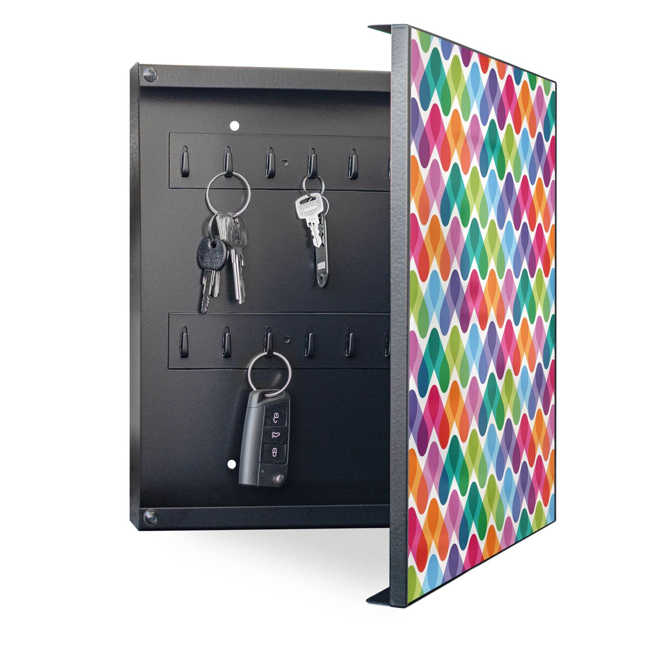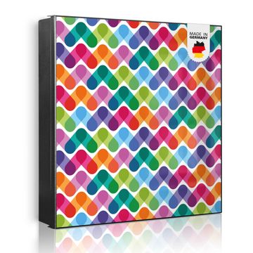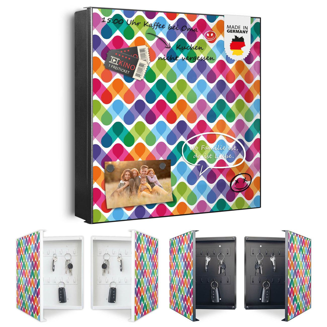 Bringe Ordnung und Eleganz in deinen Eingangsbereich mit dem banjado Schlüsselkasten Motiv Motiv Bunte Ketten. Die moderne Schlüsselbox kombiniert funktionales Design mit hochwertiger Verarbeitung und wird so zu einem echten Hingucker in Flur, Büro oder Ferienwohnung. ✅ Stilvolle Schlüsselaufbewahrung mit Motiv Motiv Bunte Ketten Der Design-Schlüsselkasten Motiv Motiv Bunte Ketten bietet Platz für bis zu 32 Schlüssel, die auf 4 stabilen Reihen mit je 8 Haken übersichtlich verstaut werden. Mit seinen kompakten Maßen von 30 x 30 x 5 cm passt die Schlüsselbox perfekt auch in kleinere Räume. Der schwarz lackierte Stahlkorpus mit rechts angeschlagenem Türscharnier harmoniert mit gedruckten Folie auf der Front und fügt sich nahtlos in jedes Wohnambiente ein. Ob als Schlüsselorganizer für Zuhause oder als praktische Lösung für Büros, Praxen und Gewerbe, der banjado Schlüsselkasten sorgt für Ordnung und Übersicht. Dank der magnetischen, mit Kreidestiften beschreibbaren Folie auf der Front kannst du Notizen anheften oder Termine direkt auf der Oberfläche festhalten. Die Schlüsselbox Motiv Motiv Bunte Ketten zur Wandmontage wird inklusive Befestigungsmaterial geliefert und ist schnell angebracht. So hast du deine Schlüssel jederzeit griffbereit und zugleich stilvoll verstaut. Mit diesem banjado Schlüsselkasten Motiv Motiv Bunte Ketten kombinierst du praktische Aufbewahrung mit stilvollem Wohndesign. Ob privat oder geschäftlich, die Schlüsselbox sorgt für mehr Ordnung, Übersicht und ein wohnliches Ambiente.Vorteile im Überblick