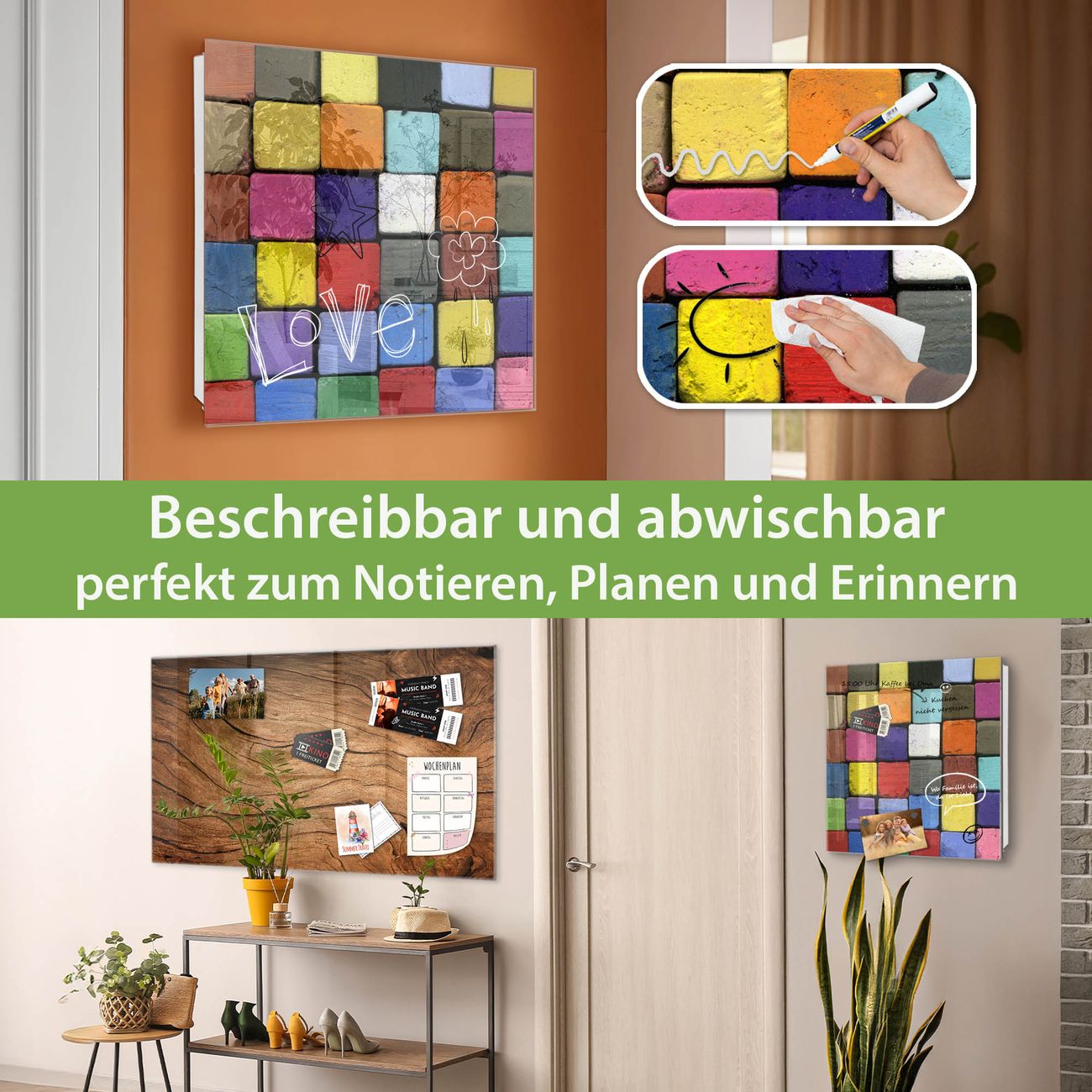 ✅ Magnetisch und mit Kreidestift beschreibbar, gehärtetes Glas, links angeschlagene TürOrdnung und Design in einem