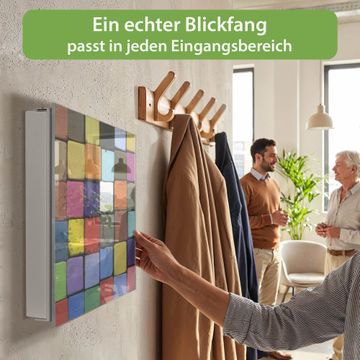 Bringe Ordnung und Eleganz in deinen Eingangsbereich mit dem banjado Schlüsselkasten Motiv Motiv Bunte Kreide. Die moderne Schlüsselbox kombiniert funktionales Design mit hochwertiger Verarbeitung und wird so zu einem echten Hingucker in Flur, Büro oder Ferienwohnung. ✅ Stilvolle Schlüsselaufbewahrung mit Glasfront im Motiv Motiv Bunte Kreide Der Design-Schlüsselkasten Motiv Motiv Bunte Kreide bietet Platz für bis zu 50 Schlüssel, die auf 5 stabilen Reihen mit je 10 Haken übersichtlich verstaut werden. Mit seinen kompakten Maßen von 30 x 30 x 5 cm passt die Schlüsselbox perfekt auch in kleinere Räume. Der weiß lackierte Stahlkorpus mit rechts angeschlagenem Türscharnier harmoniert mit der Glasfront und fügt sich nahtlos in jedes Wohnambiente ein. Ob als Schlüsselorganizer für Zuhause oder als praktische Lösung für Büros, Praxen und Gewerbe, der banjado Schlüsselkasten sorgt für Ordnung und Übersicht. Dank der magnetischen, mit Kreidestiften beschreibbaren Glasfront kannst du Notizen anheften oder Termine direkt auf der Oberfläche festhalten. Die Schlüsselbox Motiv Motiv Bunte Kreide zur Wandmontage wird inklusive Befestigungsmaterial geliefert und ist schnell angebracht. So hast du deine Schlüssel jederzeit griffbereit und zugleich stilvoll verstaut. Mit diesem banjado Schlüsselkasten Motiv Motiv Bunte Kreide kombinierst du praktische Aufbewahrung mit stilvollem Wohndesign. Ob privat oder geschäftlich, die Schlüsselbox sorgt für mehr Ordnung, Übersicht und ein wohnliches Ambiente.Vorteile im Überblick