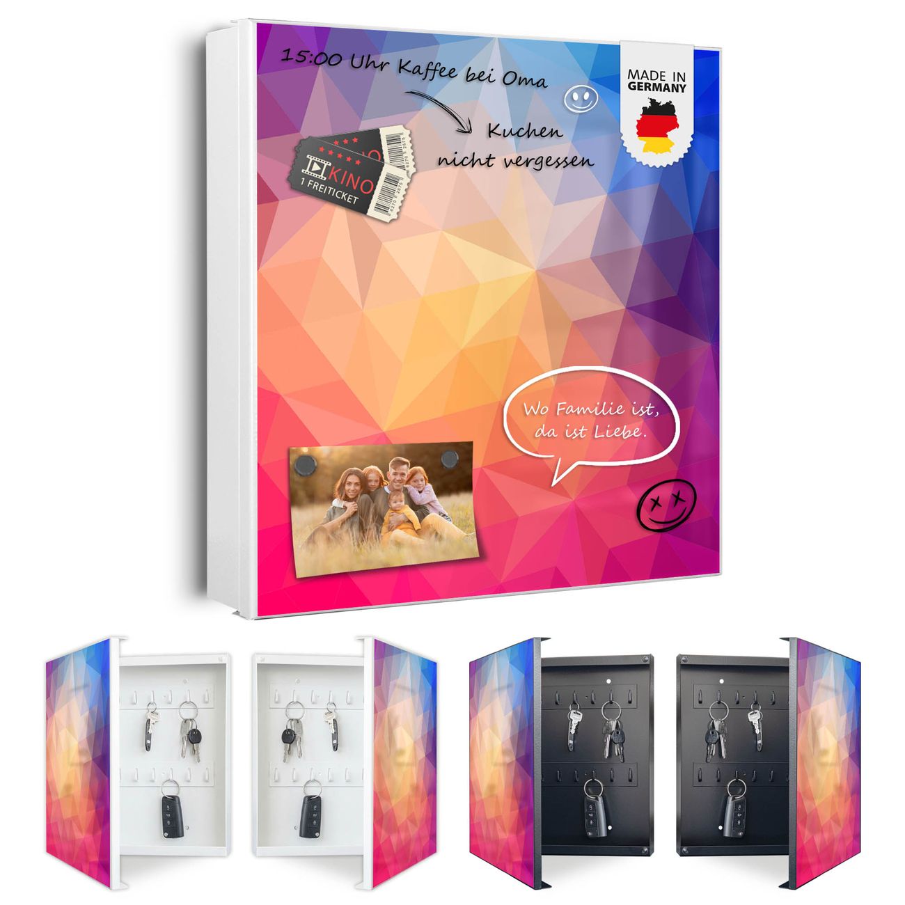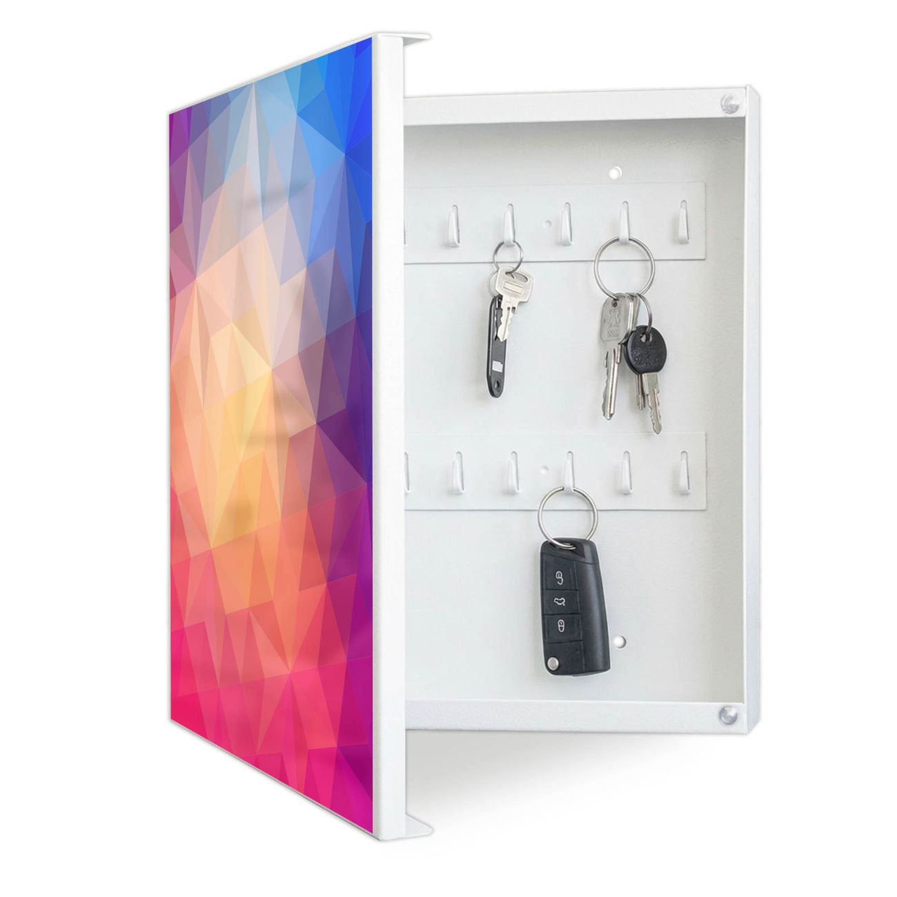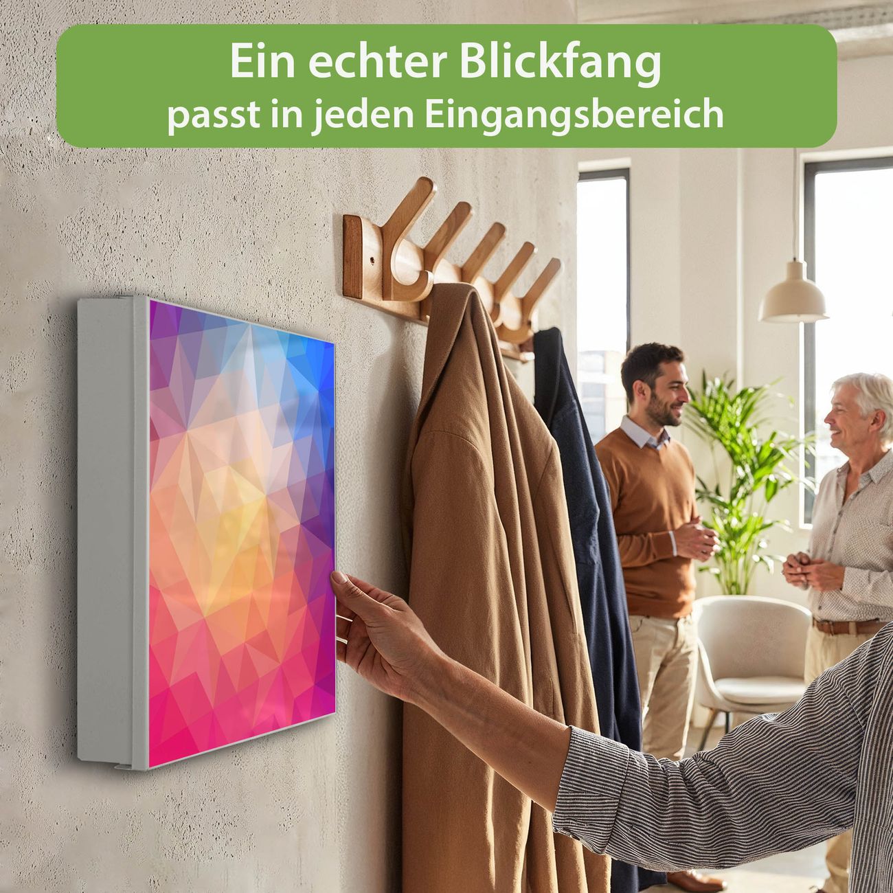 Bringe Ordnung und Eleganz in deinen Eingangsbereich mit dem banjado Schlüsselkasten Motiv Motiv Bunte Kristalle. Die moderne Schlüsselbox kombiniert funktionales Design mit hochwertiger Verarbeitung und wird so zu einem echten Hingucker in Flur, Büro oder Ferienwohnung. ✅ Stilvolle Schlüsselaufbewahrung mit Motiv Motiv Bunte Kristalle Der Design-Schlüsselkasten Motiv Motiv Bunte Kristalle bietet Platz für bis zu 32 Schlüssel, die auf 4 stabilen Reihen mit je 8 Haken übersichtlich verstaut werden. Mit seinen kompakten Maßen von 30 x 30 x 5 cm passt die Schlüsselbox perfekt auch in kleinere Räume. Der weiß lackierte Stahlkorpus mit links angeschlagenem Türscharnier harmoniert mit gedruckten Folie auf der Front und fügt sich nahtlos in jedes Wohnambiente ein. Ob als Schlüsselorganizer für Zuhause oder als praktische Lösung für Büros, Praxen und Gewerbe, der banjado Schlüsselkasten sorgt für Ordnung und Übersicht. Dank der magnetischen, mit Kreidestiften beschreibbaren Folie auf der Front kannst du Notizen anheften oder Termine direkt auf der Oberfläche festhalten. Die Schlüsselbox Motiv Motiv Bunte Kristalle zur Wandmontage wird inklusive Befestigungsmaterial geliefert und ist schnell angebracht. So hast du deine Schlüssel jederzeit griffbereit und zugleich stilvoll verstaut. Mit diesem banjado Schlüsselkasten Motiv Motiv Bunte Kristalle kombinierst du praktische Aufbewahrung mit stilvollem Wohndesign. Ob privat oder geschäftlich, die Schlüsselbox sorgt für mehr Ordnung, Übersicht und ein wohnliches Ambiente.Vorteile im Überblick