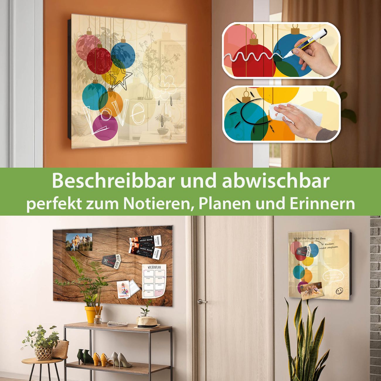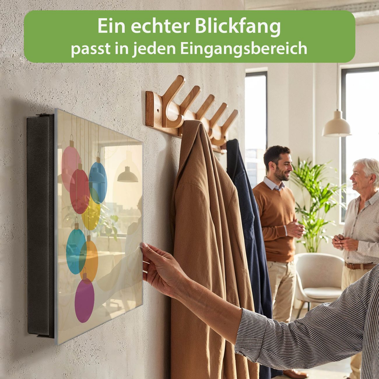 Bringe Ordnung und Eleganz in deinen Eingangsbereich mit dem banjado Schlüsselkasten Motiv Motiv Bunte Kugeln. Die moderne Schlüsselbox kombiniert funktionales Design mit hochwertiger Verarbeitung und wird so zu einem echten Hingucker in Flur, Büro oder Ferienwohnung. ✅ Stilvolle Schlüsselaufbewahrung mit Glasfront im Motiv Motiv Bunte Kugeln Der Design-Schlüsselkasten Motiv Motiv Bunte Kugeln bietet Platz für bis zu 50 Schlüssel, die auf 5 stabilen Reihen mit je 10 Haken übersichtlich verstaut werden. Mit seinen kompakten Maßen von 30 x 30 x 5 cm passt die Schlüsselbox perfekt auch in kleinere Räume. Der schwarz lackierte Stahlkorpus mit rechts angeschlagenem Türscharnier harmoniert mit der Glasfront und fügt sich nahtlos in jedes Wohnambiente ein. Ob als Schlüsselorganizer für Zuhause oder als praktische Lösung für Büros, Praxen und Gewerbe, der banjado Schlüsselkasten sorgt für Ordnung und Übersicht. Dank der magnetischen, mit Kreidestiften beschreibbaren Glasfront kannst du Notizen anheften oder Termine direkt auf der Oberfläche festhalten. Die Schlüsselbox Motiv Motiv Bunte Kugeln zur Wandmontage wird inklusive Befestigungsmaterial geliefert und ist schnell angebracht. So hast du deine Schlüssel jederzeit griffbereit und zugleich stilvoll verstaut. Mit diesem banjado Schlüsselkasten Motiv Motiv Bunte Kugeln kombinierst du praktische Aufbewahrung mit stilvollem Wohndesign. Ob privat oder geschäftlich, die Schlüsselbox sorgt für mehr Ordnung, Übersicht und ein wohnliches Ambiente.Vorteile im Überblick