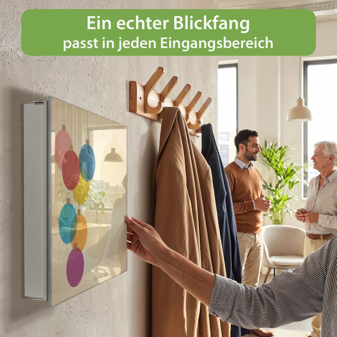Bringe Ordnung und Eleganz in deinen Eingangsbereich mit dem banjado Schlüsselkasten Motiv Motiv Bunte Kugeln. Die moderne Schlüsselbox kombiniert funktionales Design mit hochwertiger Verarbeitung und wird so zu einem echten Hingucker in Flur, Büro oder Ferienwohnung. ✅ Stilvolle Schlüsselaufbewahrung mit Glasfront im Motiv Motiv Bunte Kugeln Der Design-Schlüsselkasten Motiv Motiv Bunte Kugeln bietet Platz für bis zu 50 Schlüssel, die auf 5 stabilen Reihen mit je 10 Haken übersichtlich verstaut werden. Mit seinen kompakten Maßen von 30 x 30 x 5 cm passt die Schlüsselbox perfekt auch in kleinere Räume. Der weiß lackierte Stahlkorpus mit rechts angeschlagenem Türscharnier harmoniert mit der Glasfront und fügt sich nahtlos in jedes Wohnambiente ein. Ob als Schlüsselorganizer für Zuhause oder als praktische Lösung für Büros, Praxen und Gewerbe, der banjado Schlüsselkasten sorgt für Ordnung und Übersicht. Dank der magnetischen, mit Kreidestiften beschreibbaren Glasfront kannst du Notizen anheften oder Termine direkt auf der Oberfläche festhalten. Die Schlüsselbox Motiv Motiv Bunte Kugeln zur Wandmontage wird inklusive Befestigungsmaterial geliefert und ist schnell angebracht. So hast du deine Schlüssel jederzeit griffbereit und zugleich stilvoll verstaut. Mit diesem banjado Schlüsselkasten Motiv Motiv Bunte Kugeln kombinierst du praktische Aufbewahrung mit stilvollem Wohndesign. Ob privat oder geschäftlich, die Schlüsselbox sorgt für mehr Ordnung, Übersicht und ein wohnliches Ambiente.Vorteile im Überblick