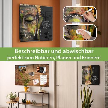 Bringe Ordnung und Eleganz in deinen Eingangsbereich mit dem banjado Schlüsselkasten Motiv Motiv Bunter Buddha. Die moderne Schlüsselbox kombiniert funktionales Design mit hochwertiger Verarbeitung und wird so zu einem echten Hingucker in Flur, Büro oder Ferienwohnung. ✅ Stilvolle Schlüsselaufbewahrung mit Glasfront im Motiv Motiv Bunter Buddha Der Design-Schlüsselkasten Motiv Motiv Bunter Buddha bietet Platz für bis zu 50 Schlüssel, die auf 5 stabilen Reihen mit je 10 Haken übersichtlich verstaut werden. Mit seinen kompakten Maßen von 30 x 30 x 5 cm passt die Schlüsselbox perfekt auch in kleinere Räume. Der schwarz lackierte Stahlkorpus mit rechts angeschlagenem Türscharnier harmoniert mit der Glasfront und fügt sich nahtlos in jedes Wohnambiente ein. Ob als Schlüsselorganizer für Zuhause oder als praktische Lösung für Büros, Praxen und Gewerbe, der banjado Schlüsselkasten sorgt für Ordnung und Übersicht. Dank der magnetischen, mit Kreidestiften beschreibbaren Glasfront kannst du Notizen anheften oder Termine direkt auf der Oberfläche festhalten. Die Schlüsselbox Motiv Motiv Bunter Buddha zur Wandmontage wird inklusive Befestigungsmaterial geliefert und ist schnell angebracht. So hast du deine Schlüssel jederzeit griffbereit und zugleich stilvoll verstaut. Mit diesem banjado Schlüsselkasten Motiv Motiv Bunter Buddha kombinierst du praktische Aufbewahrung mit stilvollem Wohndesign. Ob privat oder geschäftlich, die Schlüsselbox sorgt für mehr Ordnung, Übersicht und ein wohnliches Ambiente.Vorteile im Überblick