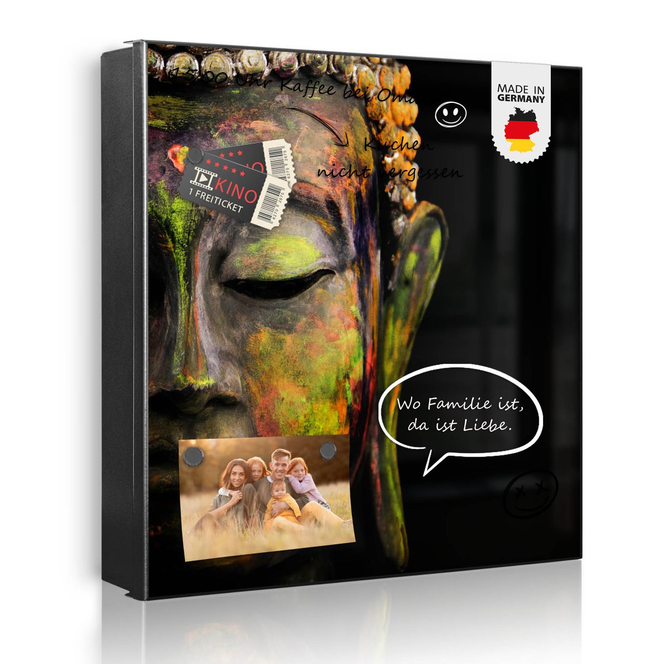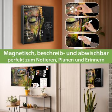 Bringe Ordnung und Eleganz in deinen Eingangsbereich mit dem banjado Schlüsselkasten Motiv Motiv Bunter Buddha. Die moderne Schlüsselbox kombiniert funktionales Design mit hochwertiger Verarbeitung und wird so zu einem echten Hingucker in Flur, Büro oder Ferienwohnung. ✅ Stilvolle Schlüsselaufbewahrung mit Motiv Motiv Bunter Buddha Der Design-Schlüsselkasten Motiv Motiv Bunter Buddha bietet Platz für bis zu 32 Schlüssel, die auf 4 stabilen Reihen mit je 8 Haken übersichtlich verstaut werden. Mit seinen kompakten Maßen von 30 x 30 x 5 cm passt die Schlüsselbox perfekt auch in kleinere Räume. Der schwarz lackierte Stahlkorpus mit links angeschlagenem Türscharnier harmoniert mit gedruckten Folie auf der Front und fügt sich nahtlos in jedes Wohnambiente ein. Ob als Schlüsselorganizer für Zuhause oder als praktische Lösung für Büros, Praxen und Gewerbe, der banjado Schlüsselkasten sorgt für Ordnung und Übersicht. Dank der magnetischen, mit Kreidestiften beschreibbaren Folie auf der Front kannst du Notizen anheften oder Termine direkt auf der Oberfläche festhalten. Die Schlüsselbox Motiv Motiv Bunter Buddha zur Wandmontage wird inklusive Befestigungsmaterial geliefert und ist schnell angebracht. So hast du deine Schlüssel jederzeit griffbereit und zugleich stilvoll verstaut. Mit diesem banjado Schlüsselkasten Motiv Motiv Bunter Buddha kombinierst du praktische Aufbewahrung mit stilvollem Wohndesign. Ob privat oder geschäftlich, die Schlüsselbox sorgt für mehr Ordnung, Übersicht und ein wohnliches Ambiente.Vorteile im Überblick