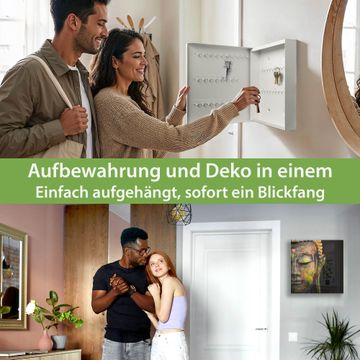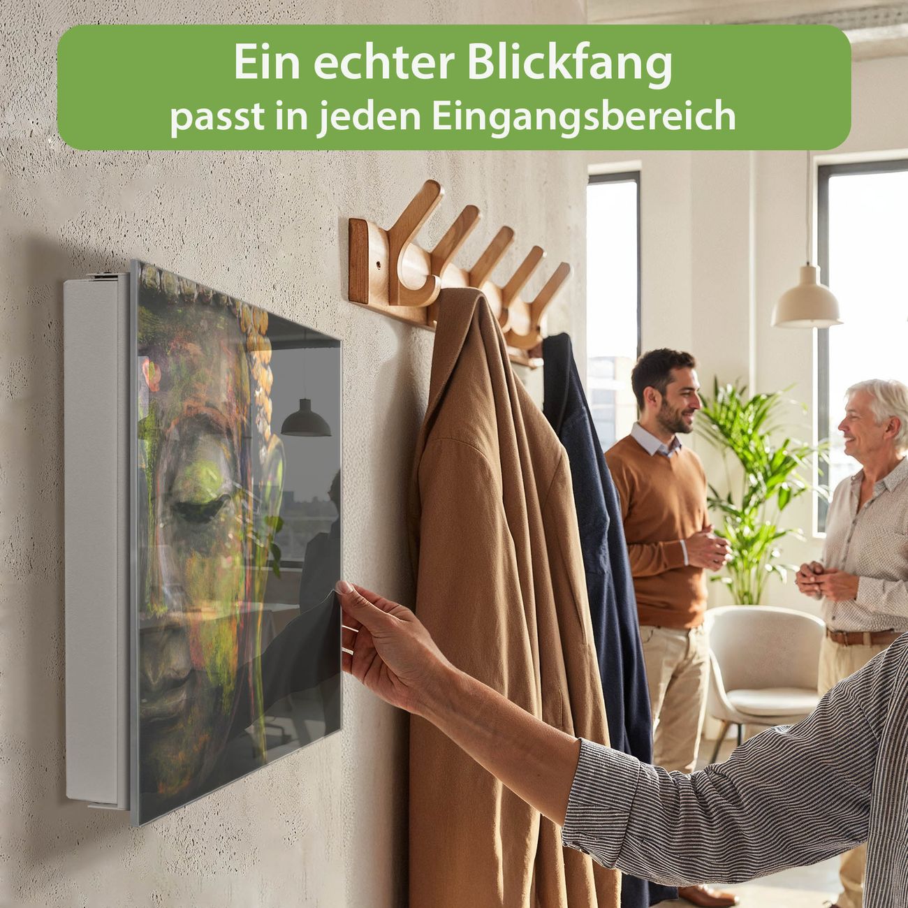 Bringe Ordnung und Eleganz in deinen Eingangsbereich mit dem banjado Schlüsselkasten Motiv Motiv Bunter Buddha. Die moderne Schlüsselbox kombiniert funktionales Design mit hochwertiger Verarbeitung und wird so zu einem echten Hingucker in Flur, Büro oder Ferienwohnung. ✅ Stilvolle Schlüsselaufbewahrung mit Glasfront im Motiv Motiv Bunter Buddha Der Design-Schlüsselkasten Motiv Motiv Bunter Buddha bietet Platz für bis zu 50 Schlüssel, die auf 5 stabilen Reihen mit je 10 Haken übersichtlich verstaut werden. Mit seinen kompakten Maßen von 30 x 30 x 5 cm passt die Schlüsselbox perfekt auch in kleinere Räume. Der weiß lackierte Stahlkorpus mit rechts angeschlagenem Türscharnier harmoniert mit der Glasfront und fügt sich nahtlos in jedes Wohnambiente ein. Ob als Schlüsselorganizer für Zuhause oder als praktische Lösung für Büros, Praxen und Gewerbe, der banjado Schlüsselkasten sorgt für Ordnung und Übersicht. Dank der magnetischen, mit Kreidestiften beschreibbaren Glasfront kannst du Notizen anheften oder Termine direkt auf der Oberfläche festhalten. Die Schlüsselbox Motiv Motiv Bunter Buddha zur Wandmontage wird inklusive Befestigungsmaterial geliefert und ist schnell angebracht. So hast du deine Schlüssel jederzeit griffbereit und zugleich stilvoll verstaut. Mit diesem banjado Schlüsselkasten Motiv Motiv Bunter Buddha kombinierst du praktische Aufbewahrung mit stilvollem Wohndesign. Ob privat oder geschäftlich, die Schlüsselbox sorgt für mehr Ordnung, Übersicht und ein wohnliches Ambiente.Vorteile im Überblick