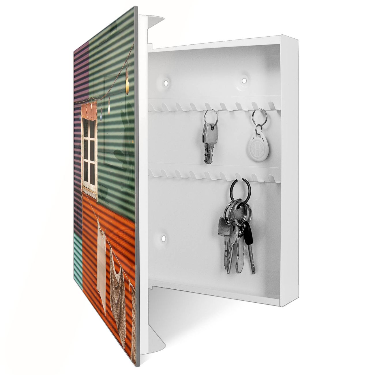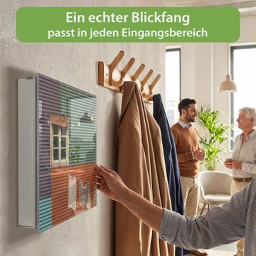 Bringe Ordnung und Eleganz in deinen Eingangsbereich mit dem banjado Schlüsselkasten Motiv Motiv Buntes Haus. Die moderne Schlüsselbox kombiniert funktionales Design mit hochwertiger Verarbeitung und wird so zu einem echten Hingucker in Flur, Büro oder Ferienwohnung. ✅ Stilvolle Schlüsselaufbewahrung mit Glasfront im Motiv Motiv Buntes Haus Der Design-Schlüsselkasten Motiv Motiv Buntes Haus bietet Platz für bis zu 50 Schlüssel, die auf 5 stabilen Reihen mit je 10 Haken übersichtlich verstaut werden. Mit seinen kompakten Maßen von 30 x 30 x 5 cm passt die Schlüsselbox perfekt auch in kleinere Räume. Der weiß lackierte Stahlkorpus mit rechts angeschlagenem Türscharnier harmoniert mit der Glasfront und fügt sich nahtlos in jedes Wohnambiente ein. Ob als Schlüsselorganizer für Zuhause oder als praktische Lösung für Büros, Praxen und Gewerbe, der banjado Schlüsselkasten sorgt für Ordnung und Übersicht. Dank der magnetischen, mit Kreidestiften beschreibbaren Glasfront kannst du Notizen anheften oder Termine direkt auf der Oberfläche festhalten. Die Schlüsselbox Motiv Motiv Buntes Haus zur Wandmontage wird inklusive Befestigungsmaterial geliefert und ist schnell angebracht. So hast du deine Schlüssel jederzeit griffbereit und zugleich stilvoll verstaut. Mit diesem banjado Schlüsselkasten Motiv Motiv Buntes Haus kombinierst du praktische Aufbewahrung mit stilvollem Wohndesign. Ob privat oder geschäftlich, die Schlüsselbox sorgt für mehr Ordnung, Übersicht und ein wohnliches Ambiente.Vorteile im Überblick