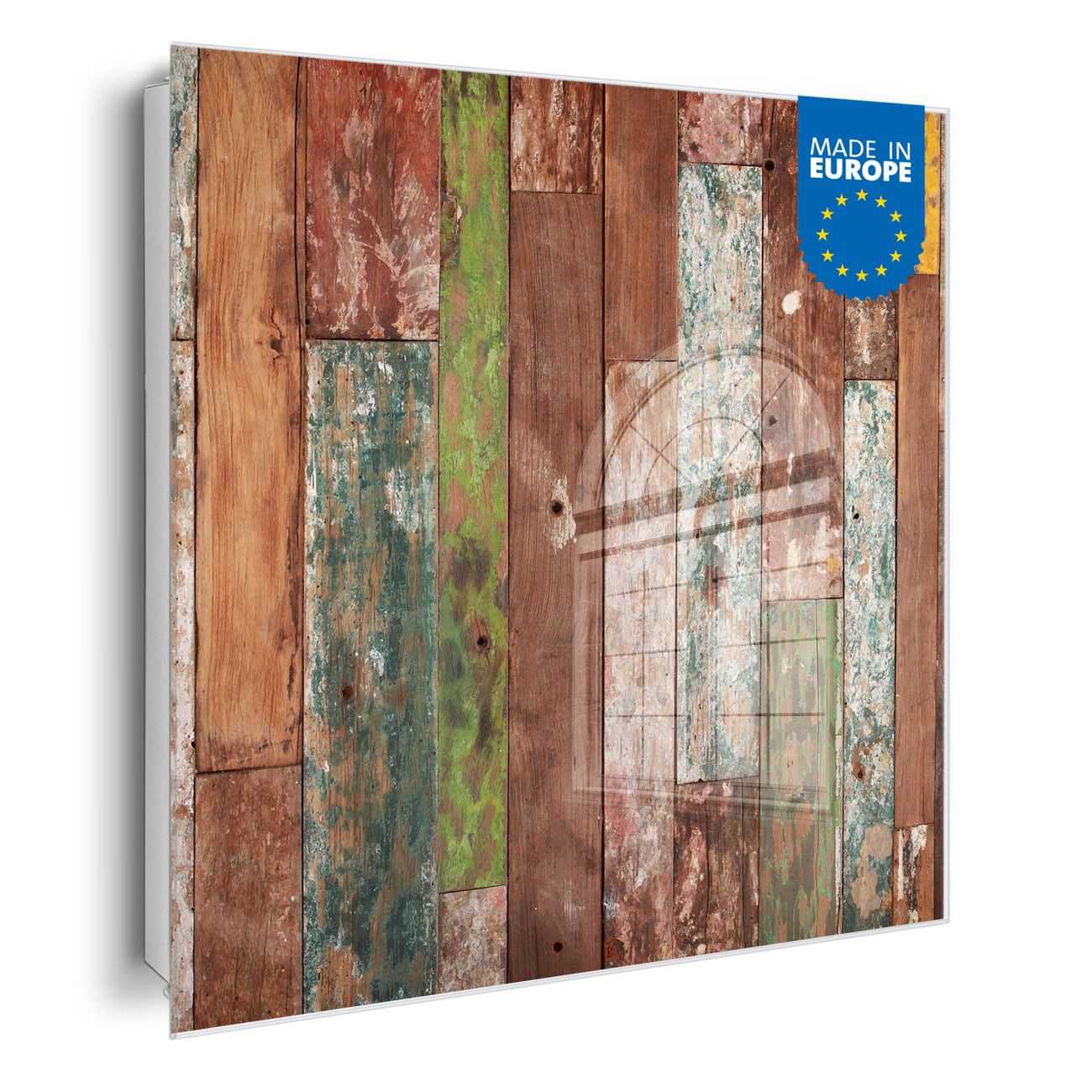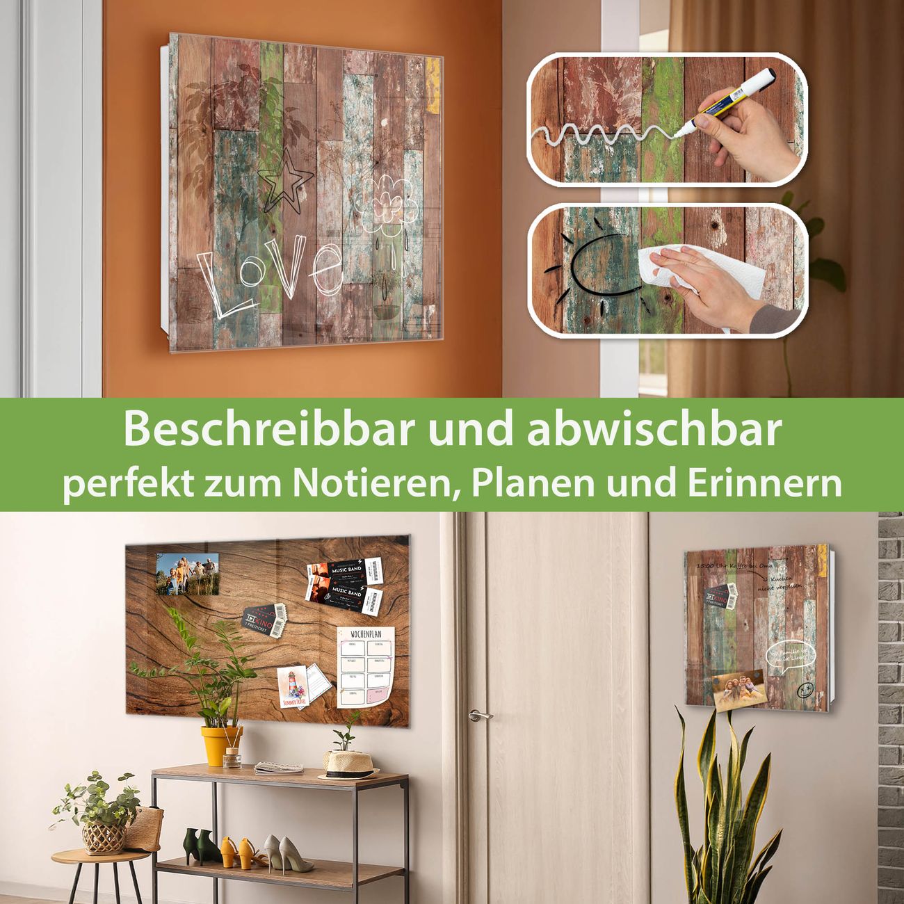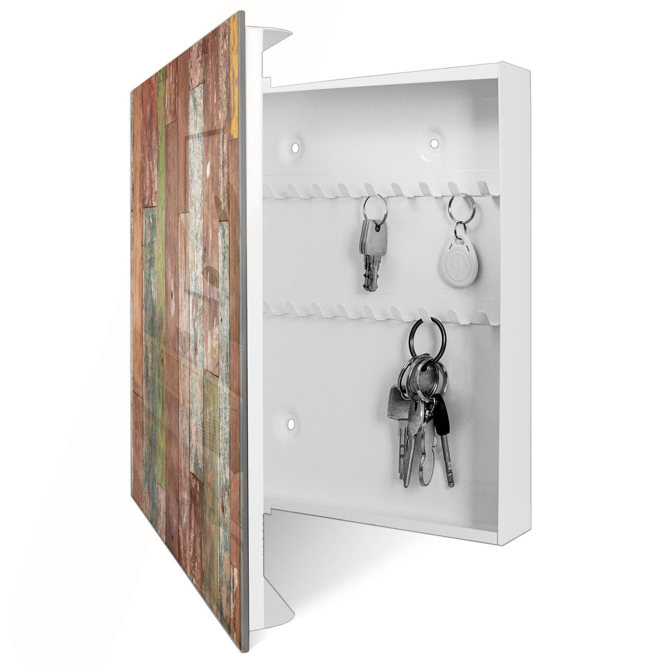 Bringe Ordnung und Eleganz in deinen Eingangsbereich mit dem banjado Schlüsselkasten Motiv Motiv Buntes Holz. Die moderne Schlüsselbox kombiniert funktionales Design mit hochwertiger Verarbeitung und wird so zu einem echten Hingucker in Flur, Büro oder Ferienwohnung. ✅ Stilvolle Schlüsselaufbewahrung mit Glasfront im Motiv Motiv Buntes Holz Der Design-Schlüsselkasten Motiv Motiv Buntes Holz bietet Platz für bis zu 50 Schlüssel, die auf 5 stabilen Reihen mit je 10 Haken übersichtlich verstaut werden. Mit seinen kompakten Maßen von 30 x 30 x 5 cm passt die Schlüsselbox perfekt auch in kleinere Räume. Der weiß lackierte Stahlkorpus mit rechts angeschlagenem Türscharnier harmoniert mit der Glasfront und fügt sich nahtlos in jedes Wohnambiente ein. Ob als Schlüsselorganizer für Zuhause oder als praktische Lösung für Büros, Praxen und Gewerbe, der banjado Schlüsselkasten sorgt für Ordnung und Übersicht. Dank der magnetischen, mit Kreidestiften beschreibbaren Glasfront kannst du Notizen anheften oder Termine direkt auf der Oberfläche festhalten. Die Schlüsselbox Motiv Motiv Buntes Holz zur Wandmontage wird inklusive Befestigungsmaterial geliefert und ist schnell angebracht. So hast du deine Schlüssel jederzeit griffbereit und zugleich stilvoll verstaut. Mit diesem banjado Schlüsselkasten Motiv Motiv Buntes Holz kombinierst du praktische Aufbewahrung mit stilvollem Wohndesign. Ob privat oder geschäftlich, die Schlüsselbox sorgt für mehr Ordnung, Übersicht und ein wohnliches Ambiente.Vorteile im Überblick