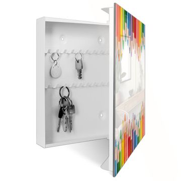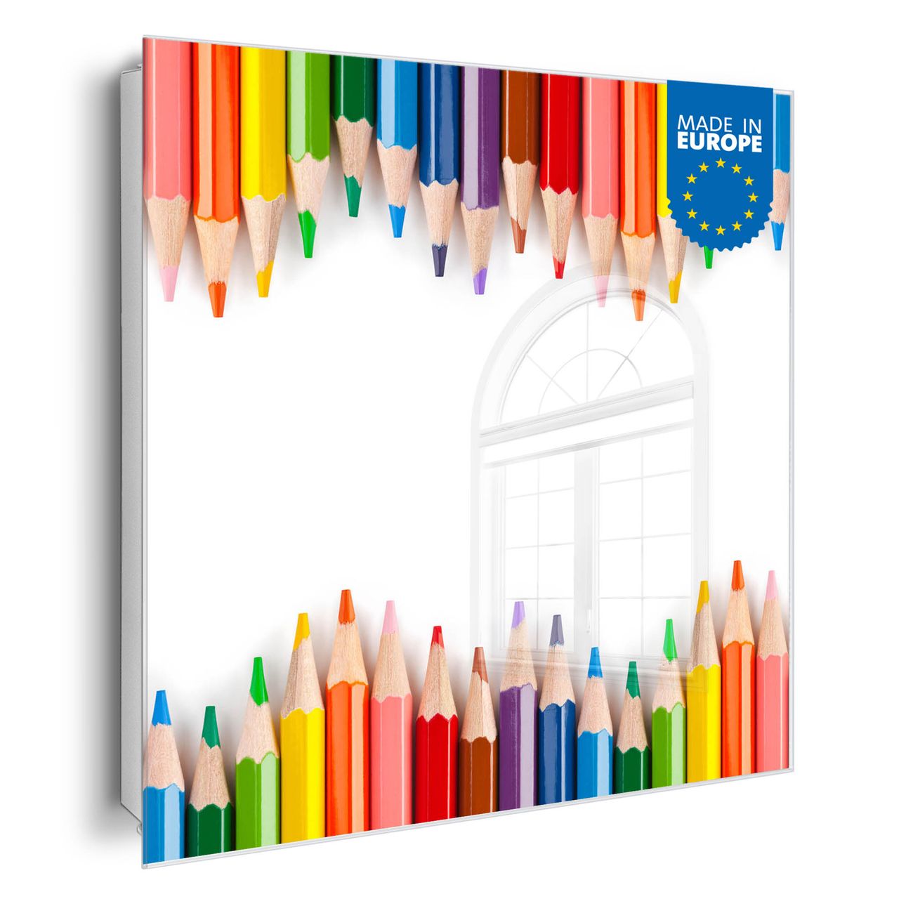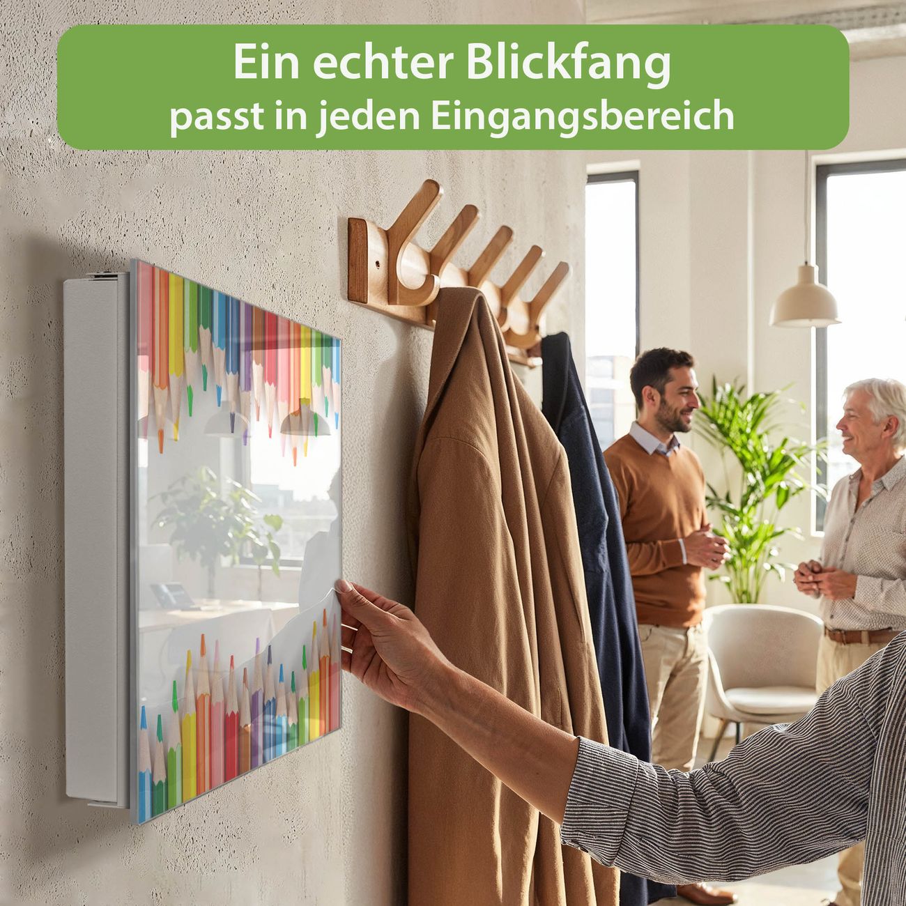 Bringe Ordnung und Eleganz in deinen Eingangsbereich mit dem banjado Schlüsselkasten Motiv Motiv Buntstifte. Die moderne Schlüsselbox kombiniert funktionales Design mit hochwertiger Verarbeitung und wird so zu einem echten Hingucker in Flur, Büro oder Ferienwohnung. ✅ Stilvolle Schlüsselaufbewahrung mit Glasfront im Motiv Motiv Buntstifte Der Design-Schlüsselkasten Motiv Motiv Buntstifte bietet Platz für bis zu 50 Schlüssel, die auf 5 stabilen Reihen mit je 10 Haken übersichtlich verstaut werden. Mit seinen kompakten Maßen von 30 x 30 x 5 cm passt die Schlüsselbox perfekt auch in kleinere Räume. Der weiß lackierte Stahlkorpus mit rechts angeschlagenem Türscharnier harmoniert mit der Glasfront und fügt sich nahtlos in jedes Wohnambiente ein. Ob als Schlüsselorganizer für Zuhause oder als praktische Lösung für Büros, Praxen und Gewerbe, der banjado Schlüsselkasten sorgt für Ordnung und Übersicht. Dank der magnetischen, mit Kreidestiften beschreibbaren Glasfront kannst du Notizen anheften oder Termine direkt auf der Oberfläche festhalten. Die Schlüsselbox Motiv Motiv Buntstifte zur Wandmontage wird inklusive Befestigungsmaterial geliefert und ist schnell angebracht. So hast du deine Schlüssel jederzeit griffbereit und zugleich stilvoll verstaut. Mit diesem banjado Schlüsselkasten Motiv Motiv Buntstifte kombinierst du praktische Aufbewahrung mit stilvollem Wohndesign. Ob privat oder geschäftlich, die Schlüsselbox sorgt für mehr Ordnung, Übersicht und ein wohnliches Ambiente.Vorteile im Überblick