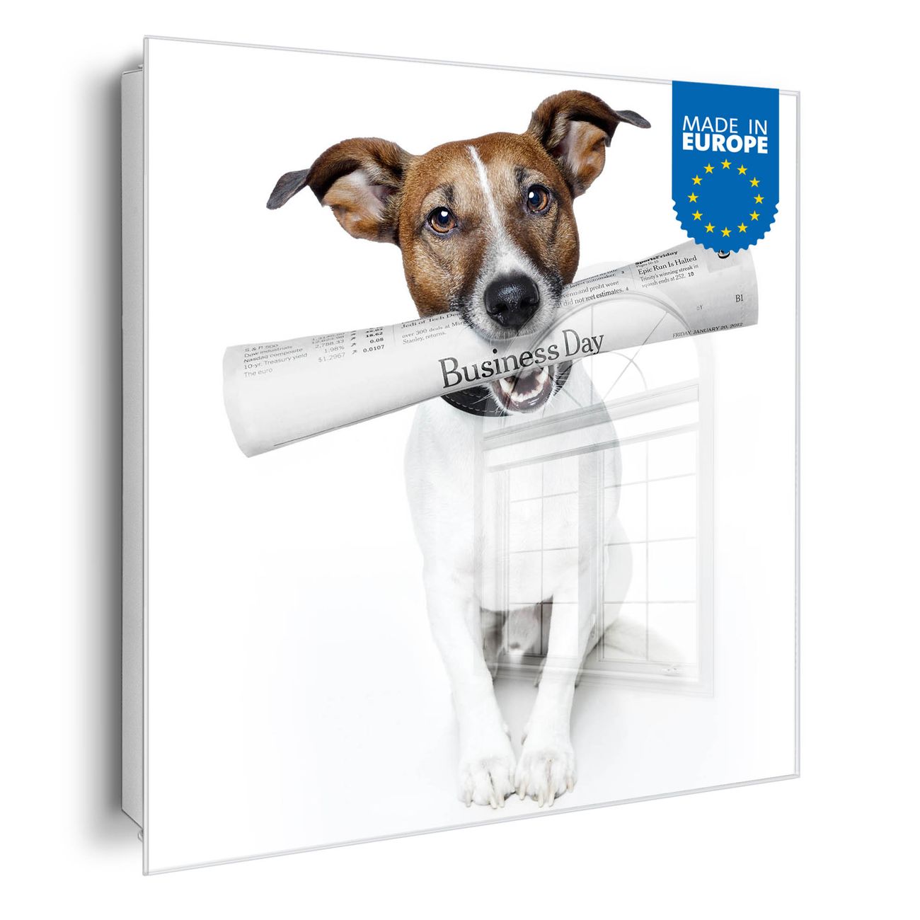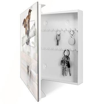 Bringe Ordnung und Eleganz in deinen Eingangsbereich mit dem banjado Schlüsselkasten Motiv Motiv Business Day. Die moderne Schlüsselbox kombiniert funktionales Design mit hochwertiger Verarbeitung und wird so zu einem echten Hingucker in Flur, Büro oder Ferienwohnung. ✅ Stilvolle Schlüsselaufbewahrung mit Glasfront im Motiv Motiv Business Day Der Design-Schlüsselkasten Motiv Motiv Business Day bietet Platz für bis zu 50 Schlüssel, die auf 5 stabilen Reihen mit je 10 Haken übersichtlich verstaut werden. Mit seinen kompakten Maßen von 30 x 30 x 5 cm passt die Schlüsselbox perfekt auch in kleinere Räume. Der weiß lackierte Stahlkorpus mit rechts angeschlagenem Türscharnier harmoniert mit der Glasfront und fügt sich nahtlos in jedes Wohnambiente ein. Ob als Schlüsselorganizer für Zuhause oder als praktische Lösung für Büros, Praxen und Gewerbe, der banjado Schlüsselkasten sorgt für Ordnung und Übersicht. Dank der magnetischen, mit Kreidestiften beschreibbaren Glasfront kannst du Notizen anheften oder Termine direkt auf der Oberfläche festhalten. Die Schlüsselbox Motiv Motiv Business Day zur Wandmontage wird inklusive Befestigungsmaterial geliefert und ist schnell angebracht. So hast du deine Schlüssel jederzeit griffbereit und zugleich stilvoll verstaut. Mit diesem banjado Schlüsselkasten Motiv Motiv Business Day kombinierst du praktische Aufbewahrung mit stilvollem Wohndesign. Ob privat oder geschäftlich, die Schlüsselbox sorgt für mehr Ordnung, Übersicht und ein wohnliches Ambiente.Vorteile im Überblick