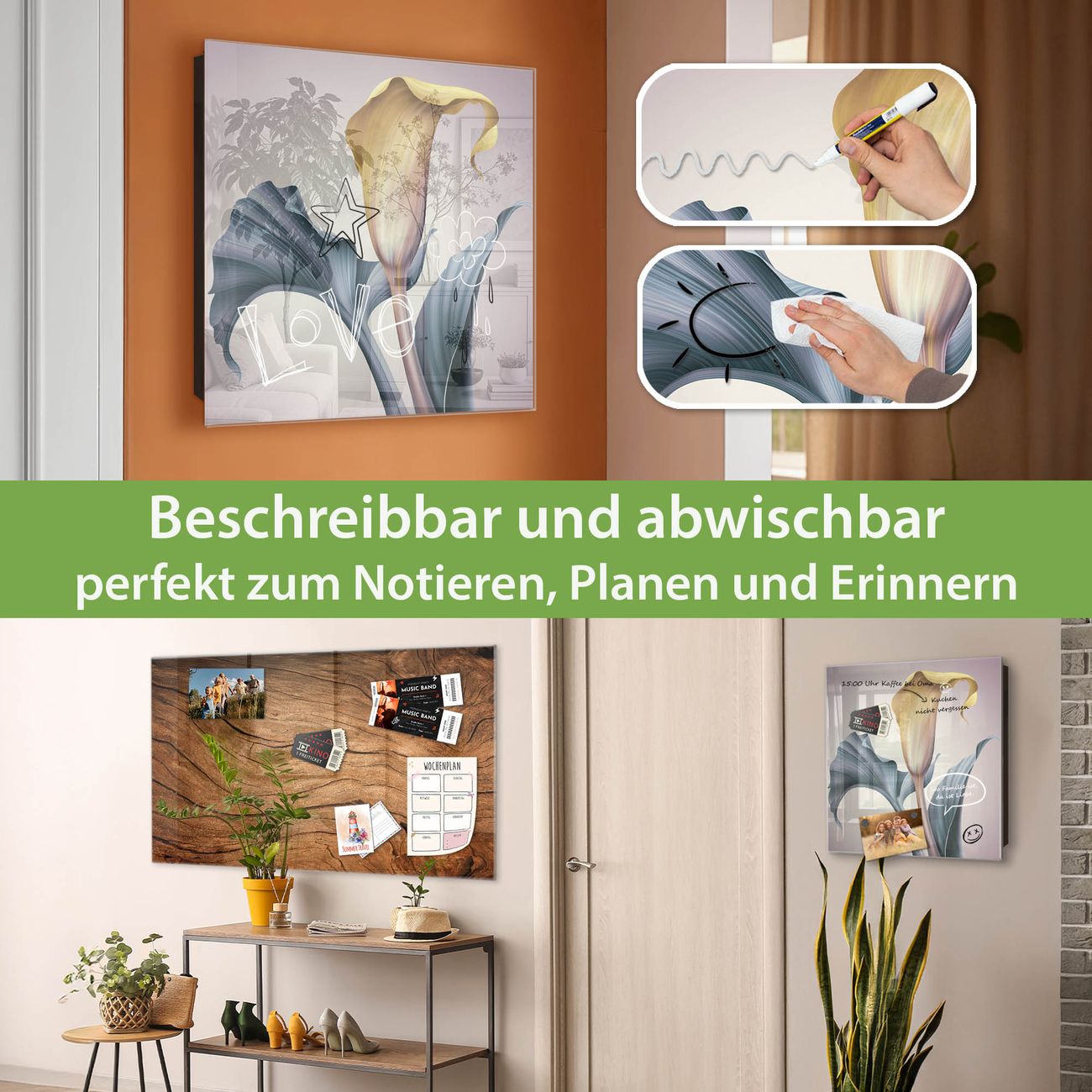 ✅ Magnetisch und mit Kreidestift beschreibbar, gehärtetes Glas, links angeschlagene TürOrdnung und Design in einem
