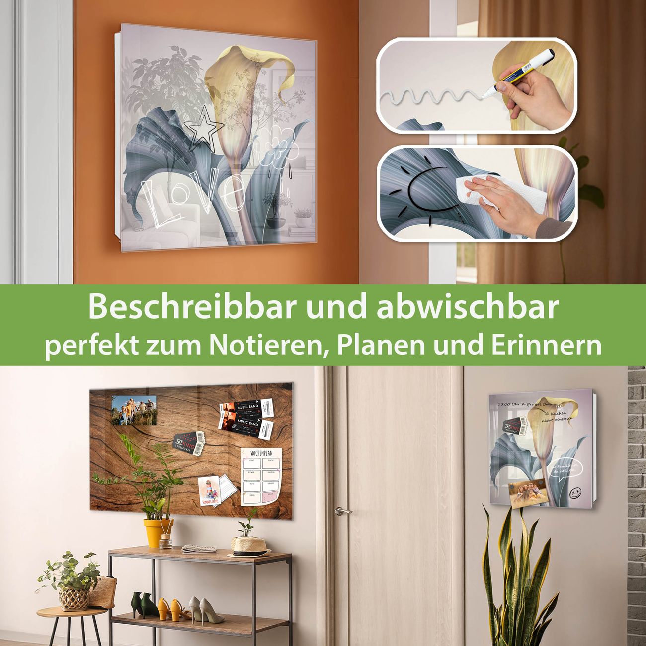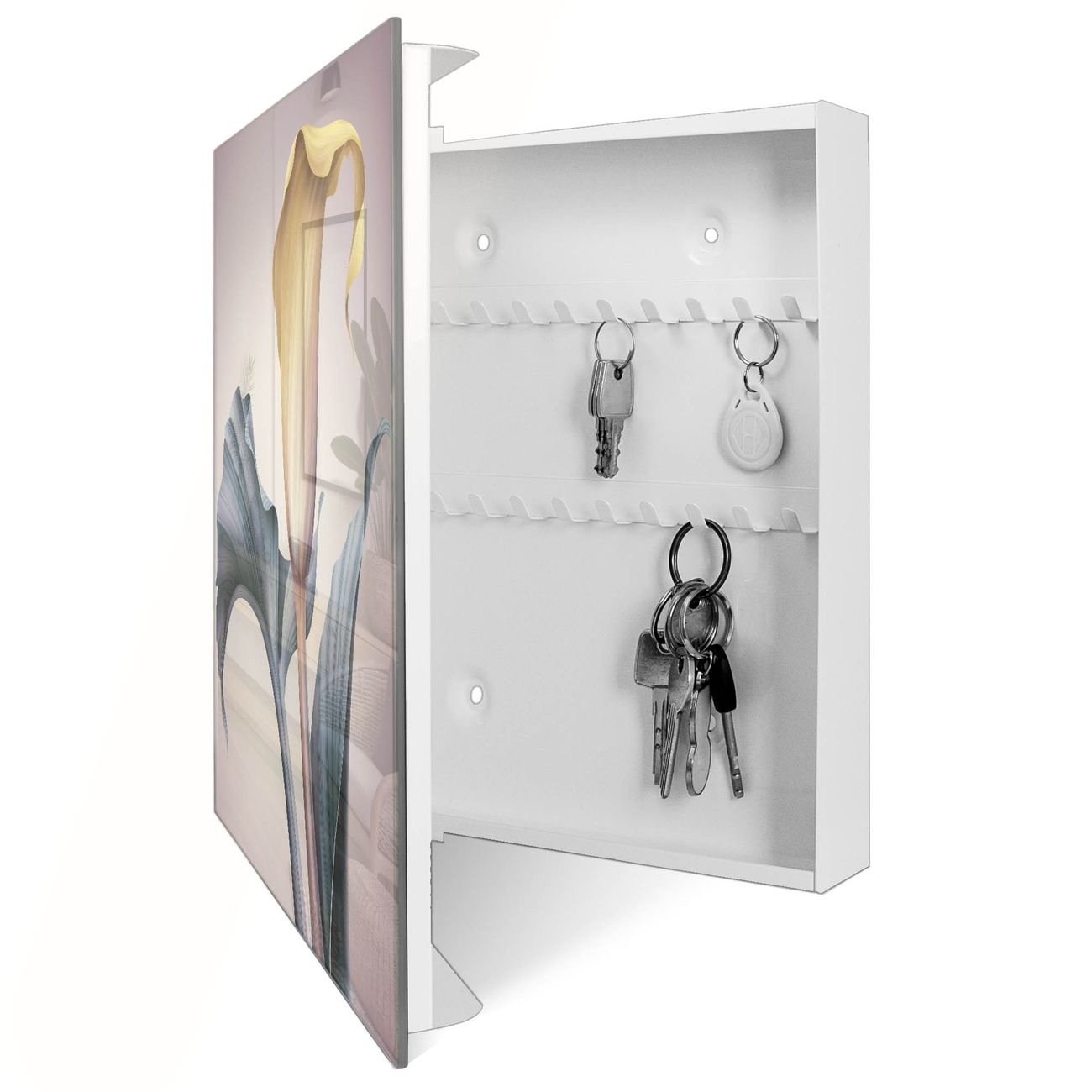 Bringe Ordnung und Eleganz in deinen Eingangsbereich mit dem banjado Schlüsselkasten Motiv Motiv Calla. Die moderne Schlüsselbox kombiniert funktionales Design mit hochwertiger Verarbeitung und wird so zu einem echten Hingucker in Flur, Büro oder Ferienwohnung. ✅ Stilvolle Schlüsselaufbewahrung mit Glasfront im Motiv Motiv Calla Der Design-Schlüsselkasten Motiv Motiv Calla bietet Platz für bis zu 50 Schlüssel, die auf 5 stabilen Reihen mit je 10 Haken übersichtlich verstaut werden. Mit seinen kompakten Maßen von 30 x 30 x 5 cm passt die Schlüsselbox perfekt auch in kleinere Räume. Der weiß lackierte Stahlkorpus mit rechts angeschlagenem Türscharnier harmoniert mit der Glasfront und fügt sich nahtlos in jedes Wohnambiente ein. Ob als Schlüsselorganizer für Zuhause oder als praktische Lösung für Büros, Praxen und Gewerbe, der banjado Schlüsselkasten sorgt für Ordnung und Übersicht. Dank der magnetischen, mit Kreidestiften beschreibbaren Glasfront kannst du Notizen anheften oder Termine direkt auf der Oberfläche festhalten. Die Schlüsselbox Motiv Motiv Calla zur Wandmontage wird inklusive Befestigungsmaterial geliefert und ist schnell angebracht. So hast du deine Schlüssel jederzeit griffbereit und zugleich stilvoll verstaut. Mit diesem banjado Schlüsselkasten Motiv Motiv Calla kombinierst du praktische Aufbewahrung mit stilvollem Wohndesign. Ob privat oder geschäftlich, die Schlüsselbox sorgt für mehr Ordnung, Übersicht und ein wohnliches Ambiente.Vorteile im Überblick