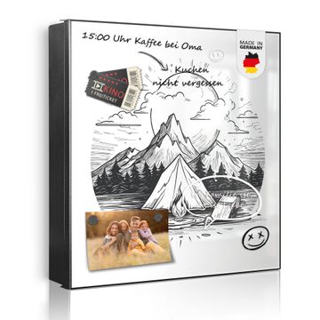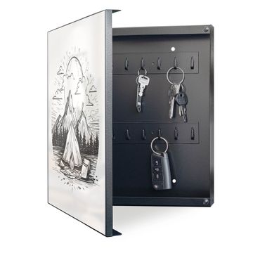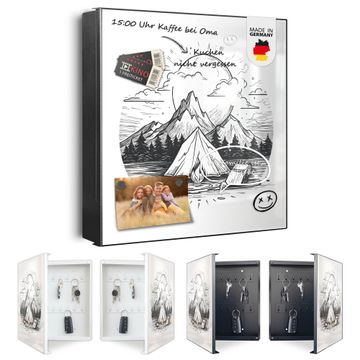 Bringe Ordnung und Eleganz in deinen Eingangsbereich mit dem banjado Schlüsselkasten Motiv Motiv Camping im Mondschein. Die moderne Schlüsselbox kombiniert funktionales Design mit hochwertiger Verarbeitung und wird so zu einem echten Hingucker in Flur, Büro oder Ferienwohnung. ✅ Stilvolle Schlüsselaufbewahrung mit Motiv Motiv Camping im Mondschein Der Design-Schlüsselkasten Motiv Motiv Camping im Mondschein bietet Platz für bis zu 32 Schlüssel, die auf 4 stabilen Reihen mit je 8 Haken übersichtlich verstaut werden. Mit seinen kompakten Maßen von 30 x 30 x 5 cm passt die Schlüsselbox perfekt auch in kleinere Räume. Der schwarz lackierte Stahlkorpus mit links angeschlagenem Türscharnier harmoniert mit gedruckten Folie auf der Front und fügt sich nahtlos in jedes Wohnambiente ein. Ob als Schlüsselorganizer für Zuhause oder als praktische Lösung für Büros, Praxen und Gewerbe, der banjado Schlüsselkasten sorgt für Ordnung und Übersicht. Dank der magnetischen, mit Kreidestiften beschreibbaren Folie auf der Front kannst du Notizen anheften oder Termine direkt auf der Oberfläche festhalten. Die Schlüsselbox Motiv Motiv Camping im Mondschein zur Wandmontage wird inklusive Befestigungsmaterial geliefert und ist schnell angebracht. So hast du deine Schlüssel jederzeit griffbereit und zugleich stilvoll verstaut. Mit diesem banjado Schlüsselkasten Motiv Motiv Camping im Mondschein kombinierst du praktische Aufbewahrung mit stilvollem Wohndesign. Ob privat oder geschäftlich, die Schlüsselbox sorgt für mehr Ordnung, Übersicht und ein wohnliches Ambiente.Vorteile im Überblick