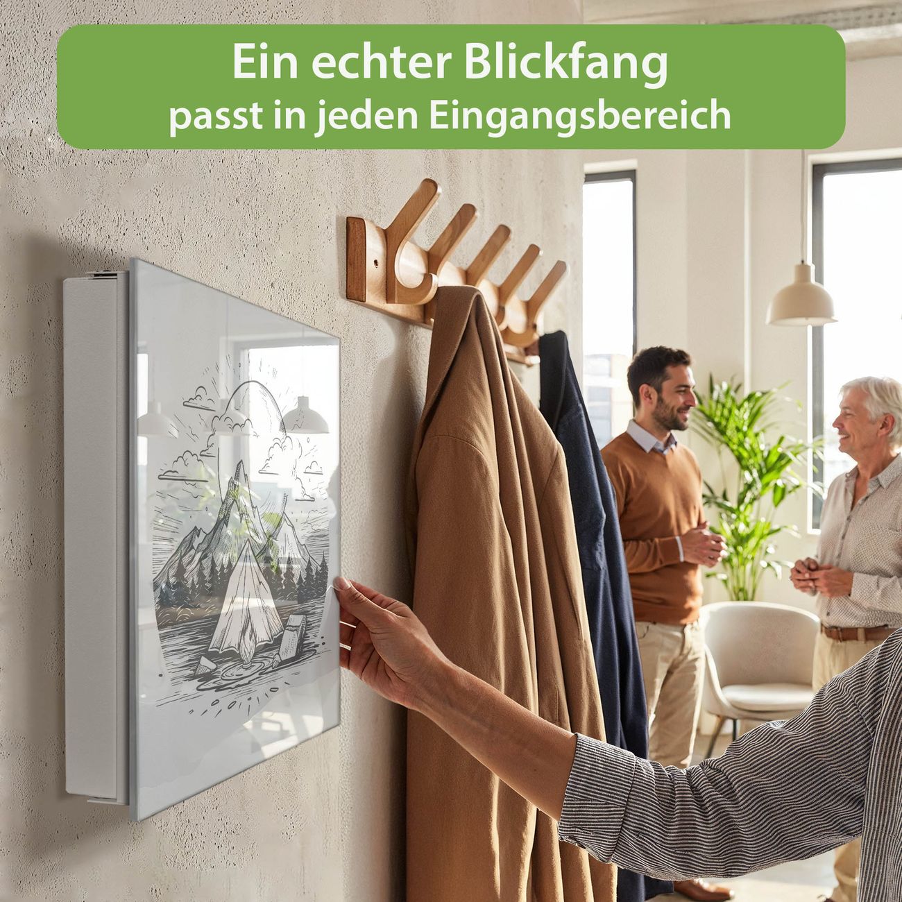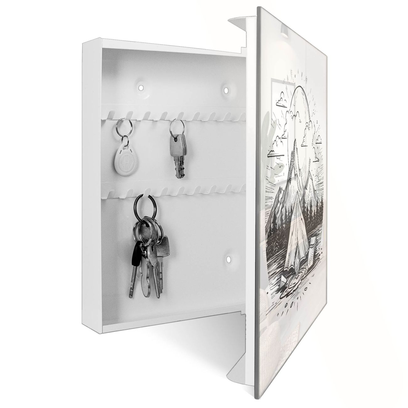 Bringe Ordnung und Eleganz in deinen Eingangsbereich mit dem banjado Schlüsselkasten Motiv Motiv Camping im Mondschein. Die moderne Schlüsselbox kombiniert funktionales Design mit hochwertiger Verarbeitung und wird so zu einem echten Hingucker in Flur, Büro oder Ferienwohnung. ✅ Stilvolle Schlüsselaufbewahrung mit Glasfront im Motiv Motiv Camping im Mondschein Der Design-Schlüsselkasten Motiv Motiv Camping im Mondschein bietet Platz für bis zu 50 Schlüssel, die auf 5 stabilen Reihen mit je 10 Haken übersichtlich verstaut werden. Mit seinen kompakten Maßen von 30 x 30 x 5 cm passt die Schlüsselbox perfekt auch in kleinere Räume. Der weiß lackierte Stahlkorpus mit rechts angeschlagenem Türscharnier harmoniert mit der Glasfront und fügt sich nahtlos in jedes Wohnambiente ein. Ob als Schlüsselorganizer für Zuhause oder als praktische Lösung für Büros, Praxen und Gewerbe, der banjado Schlüsselkasten sorgt für Ordnung und Übersicht. Dank der magnetischen, mit Kreidestiften beschreibbaren Glasfront kannst du Notizen anheften oder Termine direkt auf der Oberfläche festhalten. Die Schlüsselbox Motiv Motiv Camping im Mondschein zur Wandmontage wird inklusive Befestigungsmaterial geliefert und ist schnell angebracht. So hast du deine Schlüssel jederzeit griffbereit und zugleich stilvoll verstaut. Mit diesem banjado Schlüsselkasten Motiv Motiv Camping im Mondschein kombinierst du praktische Aufbewahrung mit stilvollem Wohndesign. Ob privat oder geschäftlich, die Schlüsselbox sorgt für mehr Ordnung, Übersicht und ein wohnliches Ambiente.Vorteile im Überblick
