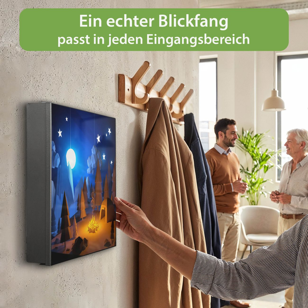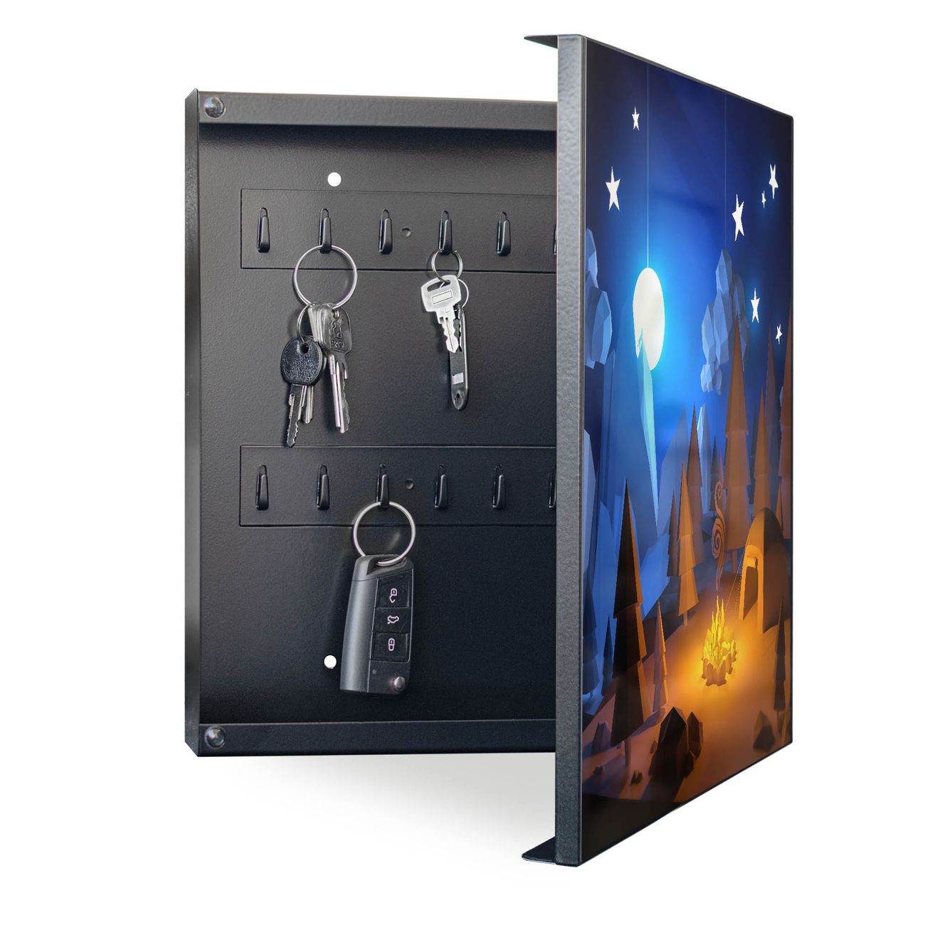 Bringe Ordnung und Eleganz in deinen Eingangsbereich mit dem banjado Schlüsselkasten Motiv Motiv Camping 2. Die moderne Schlüsselbox kombiniert funktionales Design mit hochwertiger Verarbeitung und wird so zu einem echten Hingucker in Flur, Büro oder Ferienwohnung. ✅ Stilvolle Schlüsselaufbewahrung mit Motiv Motiv Camping 2 Der Design-Schlüsselkasten Motiv Motiv Camping 2 bietet Platz für bis zu 32 Schlüssel, die auf 4 stabilen Reihen mit je 8 Haken übersichtlich verstaut werden. Mit seinen kompakten Maßen von 30 x 30 x 5 cm passt die Schlüsselbox perfekt auch in kleinere Räume. Der schwarz lackierte Stahlkorpus mit rechts angeschlagenem Türscharnier harmoniert mit gedruckten Folie auf der Front und fügt sich nahtlos in jedes Wohnambiente ein. Ob als Schlüsselorganizer für Zuhause oder als praktische Lösung für Büros, Praxen und Gewerbe, der banjado Schlüsselkasten sorgt für Ordnung und Übersicht. Dank der magnetischen, mit Kreidestiften beschreibbaren Folie auf der Front kannst du Notizen anheften oder Termine direkt auf der Oberfläche festhalten. Die Schlüsselbox Motiv Motiv Camping 2 zur Wandmontage wird inklusive Befestigungsmaterial geliefert und ist schnell angebracht. So hast du deine Schlüssel jederzeit griffbereit und zugleich stilvoll verstaut. Mit diesem banjado Schlüsselkasten Motiv Motiv Camping 2 kombinierst du praktische Aufbewahrung mit stilvollem Wohndesign. Ob privat oder geschäftlich, die Schlüsselbox sorgt für mehr Ordnung, Übersicht und ein wohnliches Ambiente.Vorteile im Überblick