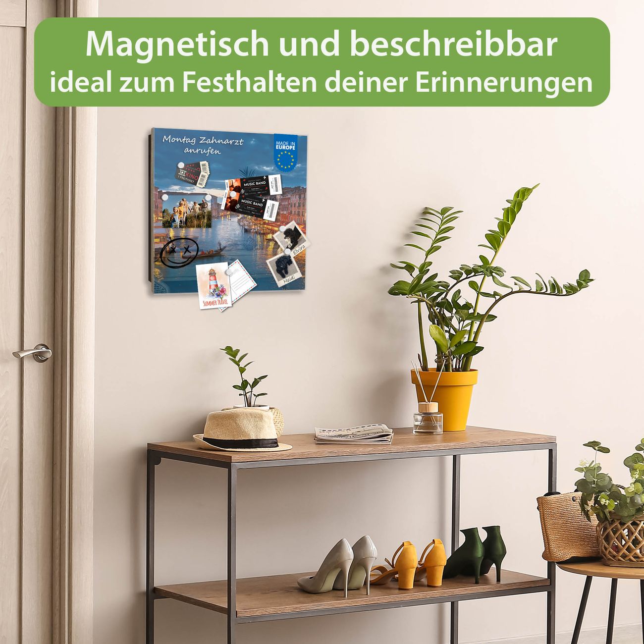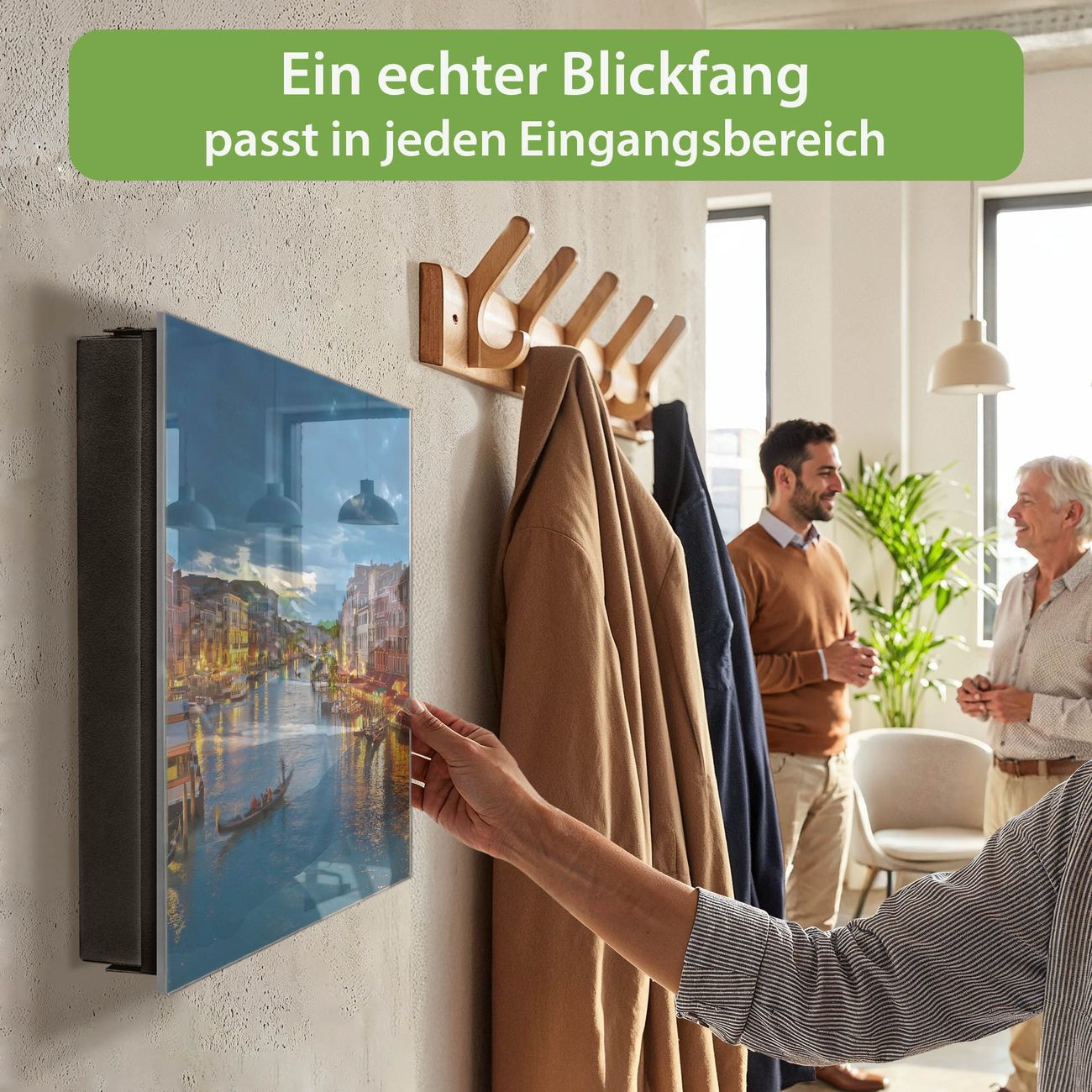 Bringe Ordnung und Eleganz in deinen Eingangsbereich mit dem banjado Schlüsselkasten Motiv Motiv Canale Grande Bei Nacht. Die moderne Schlüsselbox kombiniert funktionales Design mit hochwertiger Verarbeitung und wird so zu einem echten Hingucker in Flur, Büro oder Ferienwohnung. ✅ Stilvolle Schlüsselaufbewahrung mit Glasfront im Motiv Motiv Canale Grande Bei Nacht Der Design-Schlüsselkasten Motiv Motiv Canale Grande Bei Nacht bietet Platz für bis zu 50 Schlüssel, die auf 5 stabilen Reihen mit je 10 Haken übersichtlich verstaut werden. Mit seinen kompakten Maßen von 30 x 30 x 5 cm passt die Schlüsselbox perfekt auch in kleinere Räume. Der schwarz lackierte Stahlkorpus mit rechts angeschlagenem Türscharnier harmoniert mit der Glasfront und fügt sich nahtlos in jedes Wohnambiente ein. Ob als Schlüsselorganizer für Zuhause oder als praktische Lösung für Büros, Praxen und Gewerbe, der banjado Schlüsselkasten sorgt für Ordnung und Übersicht. Dank der magnetischen, mit Kreidestiften beschreibbaren Glasfront kannst du Notizen anheften oder Termine direkt auf der Oberfläche festhalten. Die Schlüsselbox Motiv Motiv Canale Grande Bei Nacht zur Wandmontage wird inklusive Befestigungsmaterial geliefert und ist schnell angebracht. So hast du deine Schlüssel jederzeit griffbereit und zugleich stilvoll verstaut. Mit diesem banjado Schlüsselkasten Motiv Motiv Canale Grande Bei Nacht kombinierst du praktische Aufbewahrung mit stilvollem Wohndesign. Ob privat oder geschäftlich, die Schlüsselbox sorgt für mehr Ordnung, Übersicht und ein wohnliches Ambiente.Vorteile im Überblick