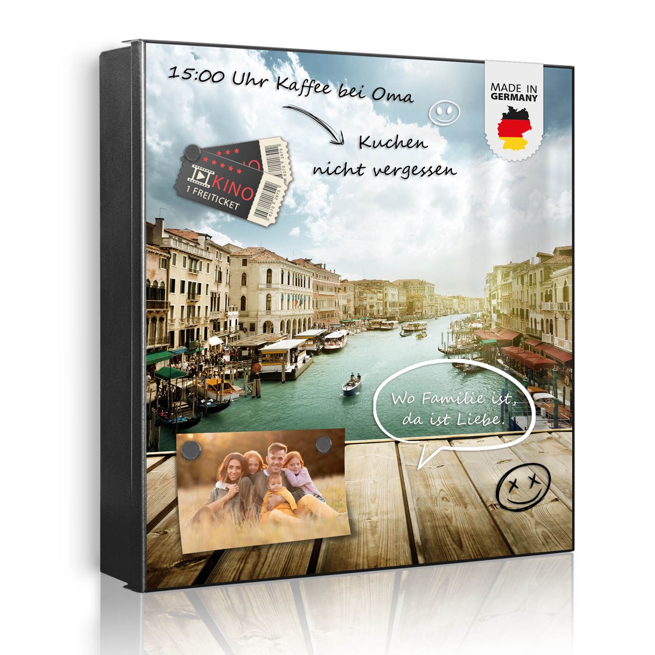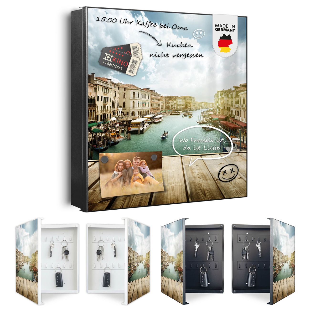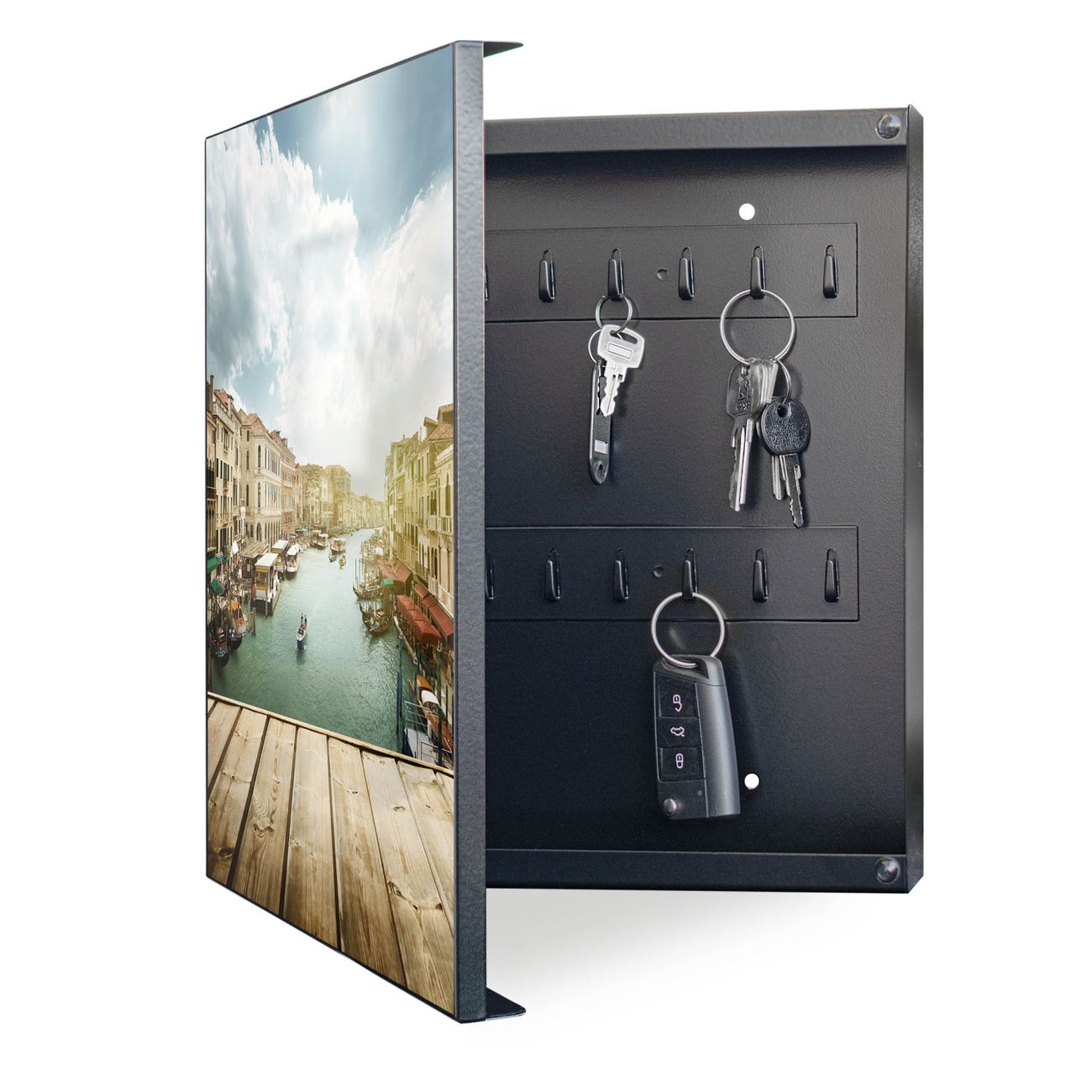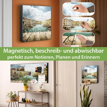 Bringe Ordnung und Eleganz in deinen Eingangsbereich mit dem banjado Schlüsselkasten Motiv Motiv Canale Grande. Die moderne Schlüsselbox kombiniert funktionales Design mit hochwertiger Verarbeitung und wird so zu einem echten Hingucker in Flur, Büro oder Ferienwohnung. ✅ Stilvolle Schlüsselaufbewahrung mit Motiv Motiv Canale Grande Der Design-Schlüsselkasten Motiv Motiv Canale Grande bietet Platz für bis zu 32 Schlüssel, die auf 4 stabilen Reihen mit je 8 Haken übersichtlich verstaut werden. Mit seinen kompakten Maßen von 30 x 30 x 5 cm passt die Schlüsselbox perfekt auch in kleinere Räume. Der schwarz lackierte Stahlkorpus mit links angeschlagenem Türscharnier harmoniert mit gedruckten Folie auf der Front und fügt sich nahtlos in jedes Wohnambiente ein. Ob als Schlüsselorganizer für Zuhause oder als praktische Lösung für Büros, Praxen und Gewerbe, der banjado Schlüsselkasten sorgt für Ordnung und Übersicht. Dank der magnetischen, mit Kreidestiften beschreibbaren Folie auf der Front kannst du Notizen anheften oder Termine direkt auf der Oberfläche festhalten. Die Schlüsselbox Motiv Motiv Canale Grande zur Wandmontage wird inklusive Befestigungsmaterial geliefert und ist schnell angebracht. So hast du deine Schlüssel jederzeit griffbereit und zugleich stilvoll verstaut. Mit diesem banjado Schlüsselkasten Motiv Motiv Canale Grande kombinierst du praktische Aufbewahrung mit stilvollem Wohndesign. Ob privat oder geschäftlich, die Schlüsselbox sorgt für mehr Ordnung, Übersicht und ein wohnliches Ambiente.Vorteile im Überblick