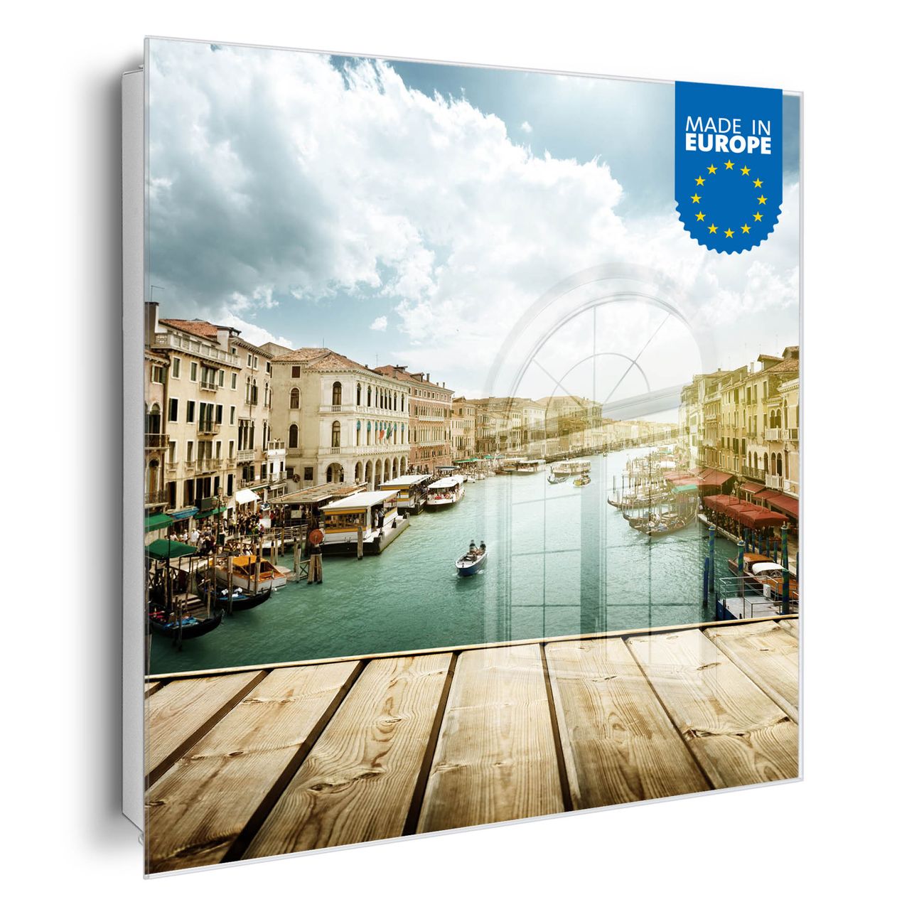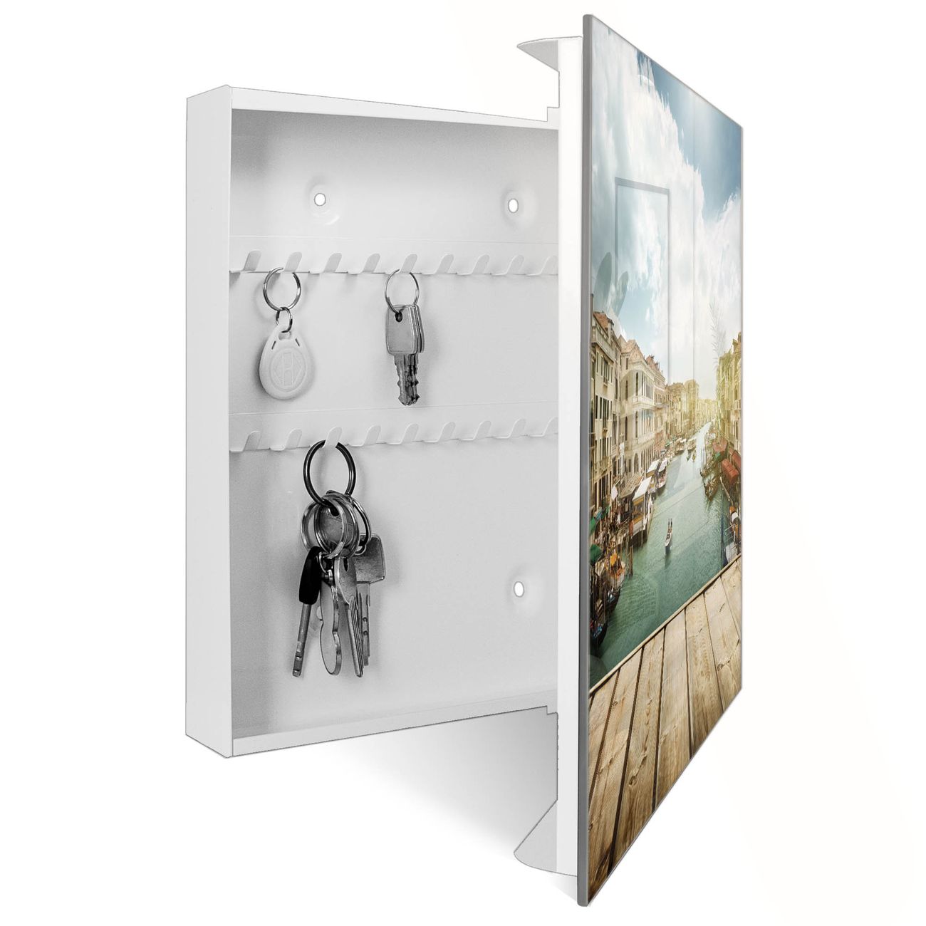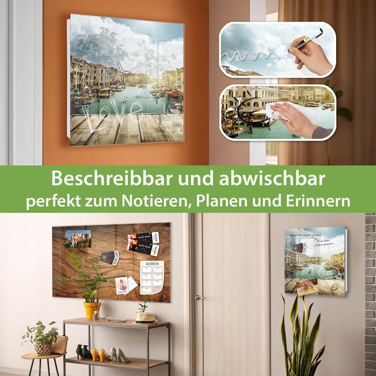 Bringe Ordnung und Eleganz in deinen Eingangsbereich mit dem banjado Schlüsselkasten Motiv Motiv Canale Grande. Die moderne Schlüsselbox kombiniert funktionales Design mit hochwertiger Verarbeitung und wird so zu einem echten Hingucker in Flur, Büro oder Ferienwohnung. ✅ Stilvolle Schlüsselaufbewahrung mit Glasfront im Motiv Motiv Canale Grande Der Design-Schlüsselkasten Motiv Motiv Canale Grande bietet Platz für bis zu 50 Schlüssel, die auf 5 stabilen Reihen mit je 10 Haken übersichtlich verstaut werden. Mit seinen kompakten Maßen von 30 x 30 x 5 cm passt die Schlüsselbox perfekt auch in kleinere Räume. Der weiß lackierte Stahlkorpus mit rechts angeschlagenem Türscharnier harmoniert mit der Glasfront und fügt sich nahtlos in jedes Wohnambiente ein. Ob als Schlüsselorganizer für Zuhause oder als praktische Lösung für Büros, Praxen und Gewerbe, der banjado Schlüsselkasten sorgt für Ordnung und Übersicht. Dank der magnetischen, mit Kreidestiften beschreibbaren Glasfront kannst du Notizen anheften oder Termine direkt auf der Oberfläche festhalten. Die Schlüsselbox Motiv Motiv Canale Grande zur Wandmontage wird inklusive Befestigungsmaterial geliefert und ist schnell angebracht. So hast du deine Schlüssel jederzeit griffbereit und zugleich stilvoll verstaut. Mit diesem banjado Schlüsselkasten Motiv Motiv Canale Grande kombinierst du praktische Aufbewahrung mit stilvollem Wohndesign. Ob privat oder geschäftlich, die Schlüsselbox sorgt für mehr Ordnung, Übersicht und ein wohnliches Ambiente.Vorteile im Überblick