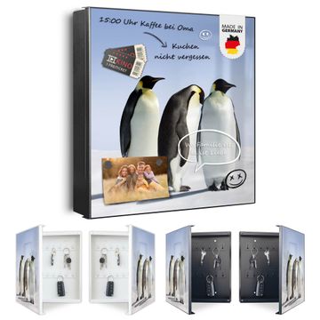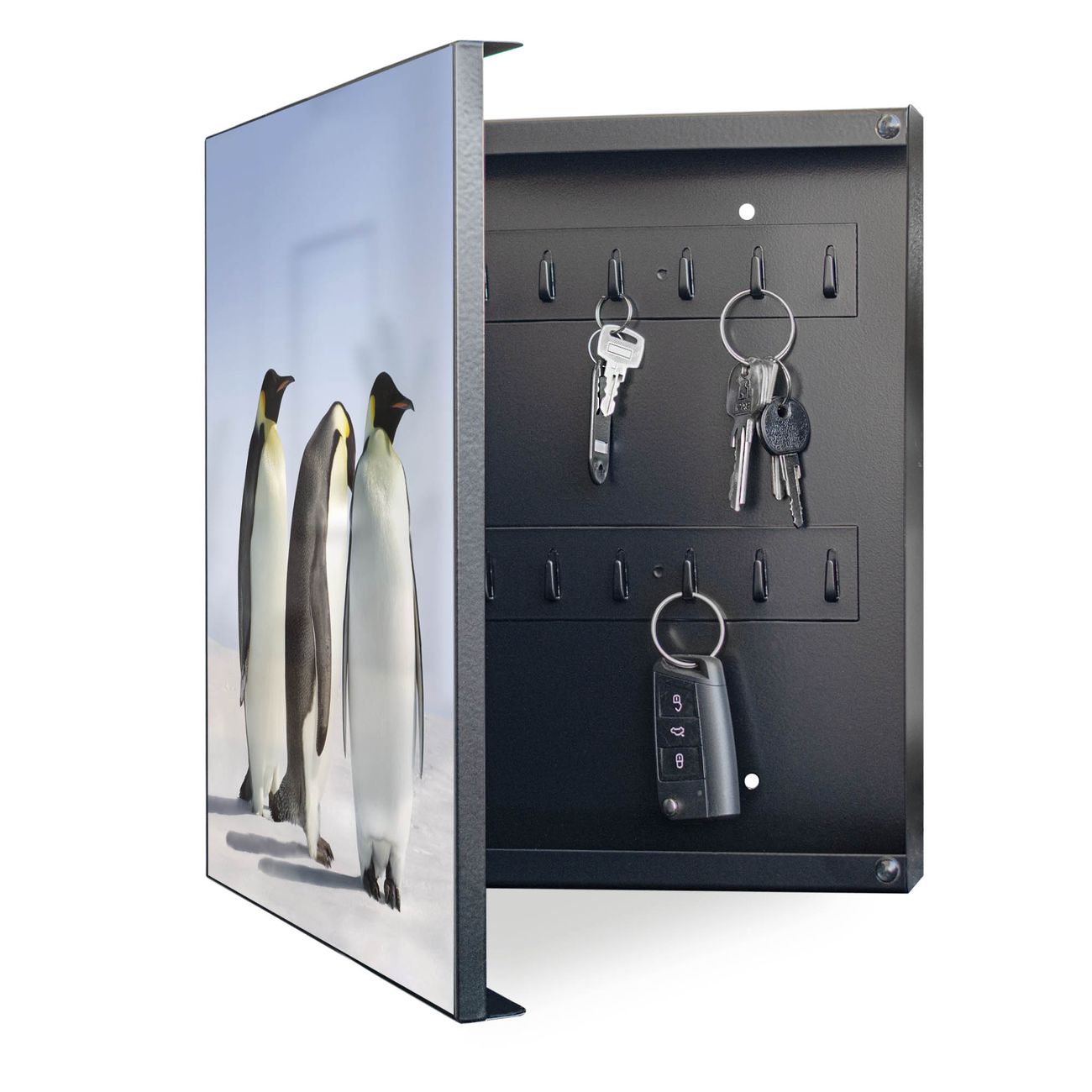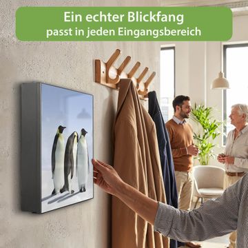 Bringe Ordnung und Eleganz in deinen Eingangsbereich mit dem banjado Schlüsselkasten Motiv Motiv Catch Up. Die moderne Schlüsselbox kombiniert funktionales Design mit hochwertiger Verarbeitung und wird so zu einem echten Hingucker in Flur, Büro oder Ferienwohnung. ✅ Stilvolle Schlüsselaufbewahrung mit Motiv Motiv Catch Up Der Design-Schlüsselkasten Motiv Motiv Catch Up bietet Platz für bis zu 32 Schlüssel, die auf 4 stabilen Reihen mit je 8 Haken übersichtlich verstaut werden. Mit seinen kompakten Maßen von 30 x 30 x 5 cm passt die Schlüsselbox perfekt auch in kleinere Räume. Der schwarz lackierte Stahlkorpus mit links angeschlagenem Türscharnier harmoniert mit gedruckten Folie auf der Front und fügt sich nahtlos in jedes Wohnambiente ein. Ob als Schlüsselorganizer für Zuhause oder als praktische Lösung für Büros, Praxen und Gewerbe, der banjado Schlüsselkasten sorgt für Ordnung und Übersicht. Dank der magnetischen, mit Kreidestiften beschreibbaren Folie auf der Front kannst du Notizen anheften oder Termine direkt auf der Oberfläche festhalten. Die Schlüsselbox Motiv Motiv Catch Up zur Wandmontage wird inklusive Befestigungsmaterial geliefert und ist schnell angebracht. So hast du deine Schlüssel jederzeit griffbereit und zugleich stilvoll verstaut. Mit diesem banjado Schlüsselkasten Motiv Motiv Catch Up kombinierst du praktische Aufbewahrung mit stilvollem Wohndesign. Ob privat oder geschäftlich, die Schlüsselbox sorgt für mehr Ordnung, Übersicht und ein wohnliches Ambiente.Vorteile im Überblick