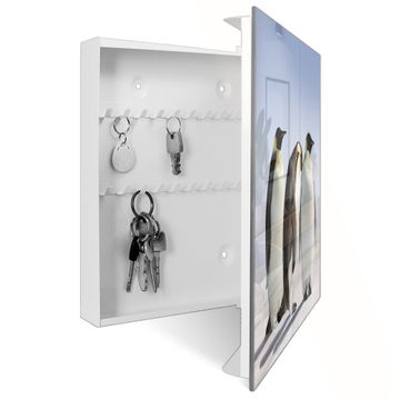 Bringe Ordnung und Eleganz in deinen Eingangsbereich mit dem banjado Schlüsselkasten Motiv Motiv Catch Up. Die moderne Schlüsselbox kombiniert funktionales Design mit hochwertiger Verarbeitung und wird so zu einem echten Hingucker in Flur, Büro oder Ferienwohnung. ✅ Stilvolle Schlüsselaufbewahrung mit Glasfront im Motiv Motiv Catch Up Der Design-Schlüsselkasten Motiv Motiv Catch Up bietet Platz für bis zu 50 Schlüssel, die auf 5 stabilen Reihen mit je 10 Haken übersichtlich verstaut werden. Mit seinen kompakten Maßen von 30 x 30 x 5 cm passt die Schlüsselbox perfekt auch in kleinere Räume. Der weiß lackierte Stahlkorpus mit rechts angeschlagenem Türscharnier harmoniert mit der Glasfront und fügt sich nahtlos in jedes Wohnambiente ein. Ob als Schlüsselorganizer für Zuhause oder als praktische Lösung für Büros, Praxen und Gewerbe, der banjado Schlüsselkasten sorgt für Ordnung und Übersicht. Dank der magnetischen, mit Kreidestiften beschreibbaren Glasfront kannst du Notizen anheften oder Termine direkt auf der Oberfläche festhalten. Die Schlüsselbox Motiv Motiv Catch Up zur Wandmontage wird inklusive Befestigungsmaterial geliefert und ist schnell angebracht. So hast du deine Schlüssel jederzeit griffbereit und zugleich stilvoll verstaut. Mit diesem banjado Schlüsselkasten Motiv Motiv Catch Up kombinierst du praktische Aufbewahrung mit stilvollem Wohndesign. Ob privat oder geschäftlich, die Schlüsselbox sorgt für mehr Ordnung, Übersicht und ein wohnliches Ambiente.Vorteile im Überblick