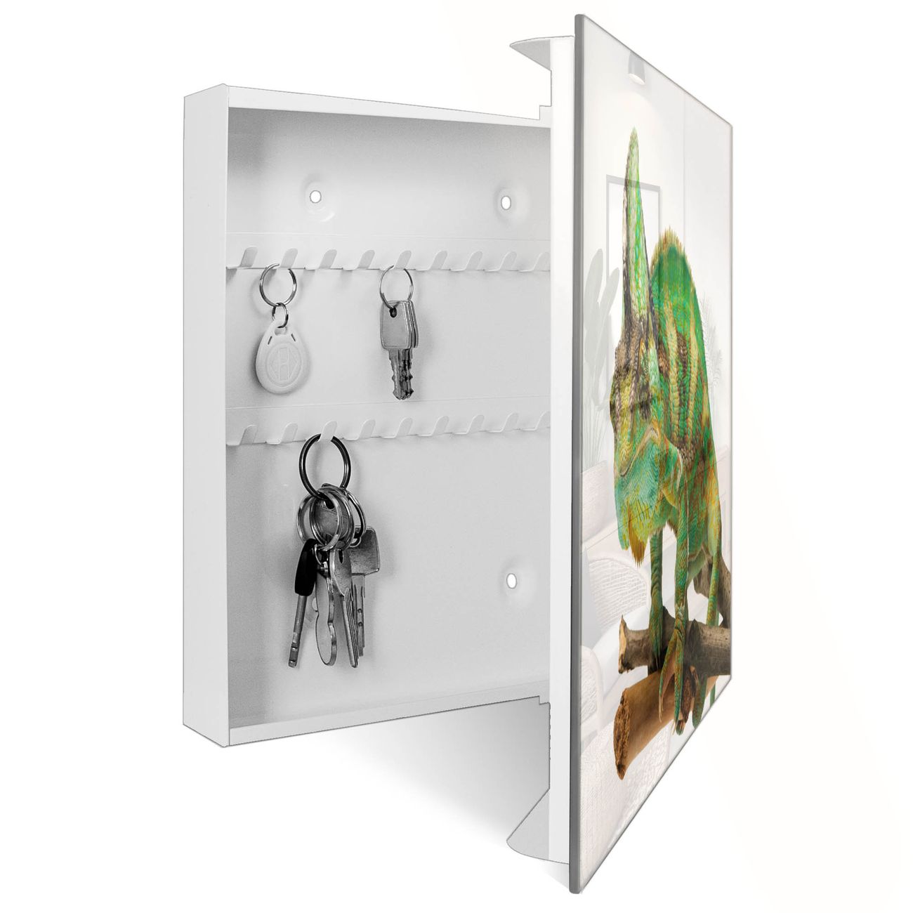 Bringe Ordnung und Eleganz in deinen Eingangsbereich mit dem banjado Schlüsselkasten Motiv Motiv Chamäleon. Die moderne Schlüsselbox kombiniert funktionales Design mit hochwertiger Verarbeitung und wird so zu einem echten Hingucker in Flur, Büro oder Ferienwohnung. ✅ Stilvolle Schlüsselaufbewahrung mit Glasfront im Motiv Motiv Chamäleon Der Design-Schlüsselkasten Motiv Motiv Chamäleon bietet Platz für bis zu 50 Schlüssel, die auf 5 stabilen Reihen mit je 10 Haken übersichtlich verstaut werden. Mit seinen kompakten Maßen von 30 x 30 x 5 cm passt die Schlüsselbox perfekt auch in kleinere Räume. Der weiß lackierte Stahlkorpus mit rechts angeschlagenem Türscharnier harmoniert mit der Glasfront und fügt sich nahtlos in jedes Wohnambiente ein. Ob als Schlüsselorganizer für Zuhause oder als praktische Lösung für Büros, Praxen und Gewerbe, der banjado Schlüsselkasten sorgt für Ordnung und Übersicht. Dank der magnetischen, mit Kreidestiften beschreibbaren Glasfront kannst du Notizen anheften oder Termine direkt auf der Oberfläche festhalten. Die Schlüsselbox Motiv Motiv Chamäleon zur Wandmontage wird inklusive Befestigungsmaterial geliefert und ist schnell angebracht. So hast du deine Schlüssel jederzeit griffbereit und zugleich stilvoll verstaut. Mit diesem banjado Schlüsselkasten Motiv Motiv Chamäleon kombinierst du praktische Aufbewahrung mit stilvollem Wohndesign. Ob privat oder geschäftlich, die Schlüsselbox sorgt für mehr Ordnung, Übersicht und ein wohnliches Ambiente.Vorteile im Überblick