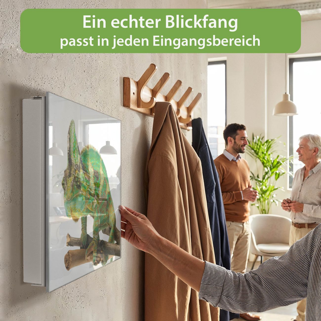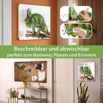 Bringe Ordnung und Eleganz in deinen Eingangsbereich mit dem banjado Schlüsselkasten Motiv Motiv Chamäleon. Die moderne Schlüsselbox kombiniert funktionales Design mit hochwertiger Verarbeitung und wird so zu einem echten Hingucker in Flur, Büro oder Ferienwohnung. ✅ Stilvolle Schlüsselaufbewahrung mit Glasfront im Motiv Motiv Chamäleon Der Design-Schlüsselkasten Motiv Motiv Chamäleon bietet Platz für bis zu 50 Schlüssel, die auf 5 stabilen Reihen mit je 10 Haken übersichtlich verstaut werden. Mit seinen kompakten Maßen von 30 x 30 x 5 cm passt die Schlüsselbox perfekt auch in kleinere Räume. Der weiß lackierte Stahlkorpus mit rechts angeschlagenem Türscharnier harmoniert mit der Glasfront und fügt sich nahtlos in jedes Wohnambiente ein. Ob als Schlüsselorganizer für Zuhause oder als praktische Lösung für Büros, Praxen und Gewerbe, der banjado Schlüsselkasten sorgt für Ordnung und Übersicht. Dank der magnetischen, mit Kreidestiften beschreibbaren Glasfront kannst du Notizen anheften oder Termine direkt auf der Oberfläche festhalten. Die Schlüsselbox Motiv Motiv Chamäleon zur Wandmontage wird inklusive Befestigungsmaterial geliefert und ist schnell angebracht. So hast du deine Schlüssel jederzeit griffbereit und zugleich stilvoll verstaut. Mit diesem banjado Schlüsselkasten Motiv Motiv Chamäleon kombinierst du praktische Aufbewahrung mit stilvollem Wohndesign. Ob privat oder geschäftlich, die Schlüsselbox sorgt für mehr Ordnung, Übersicht und ein wohnliches Ambiente.Vorteile im Überblick