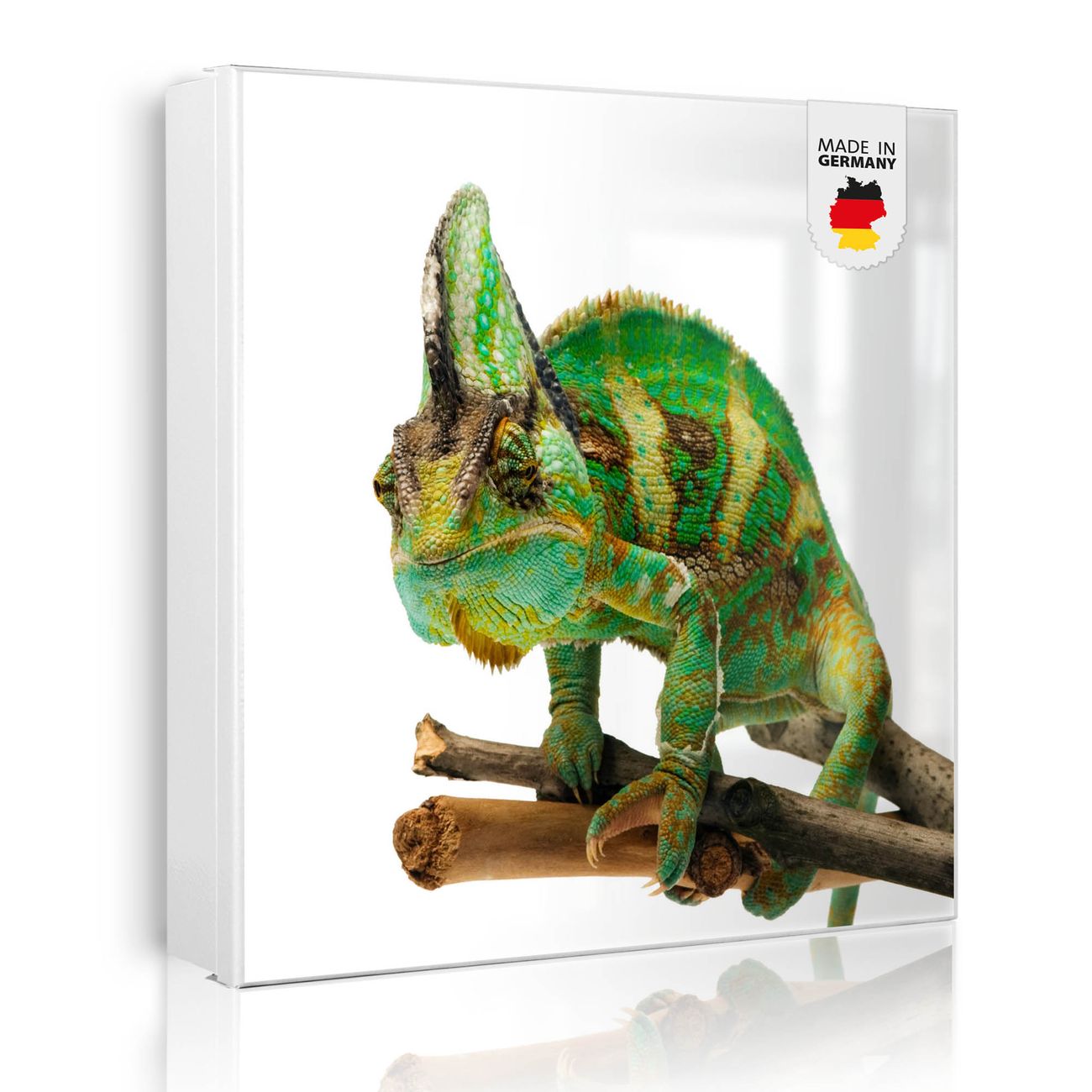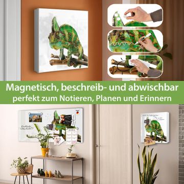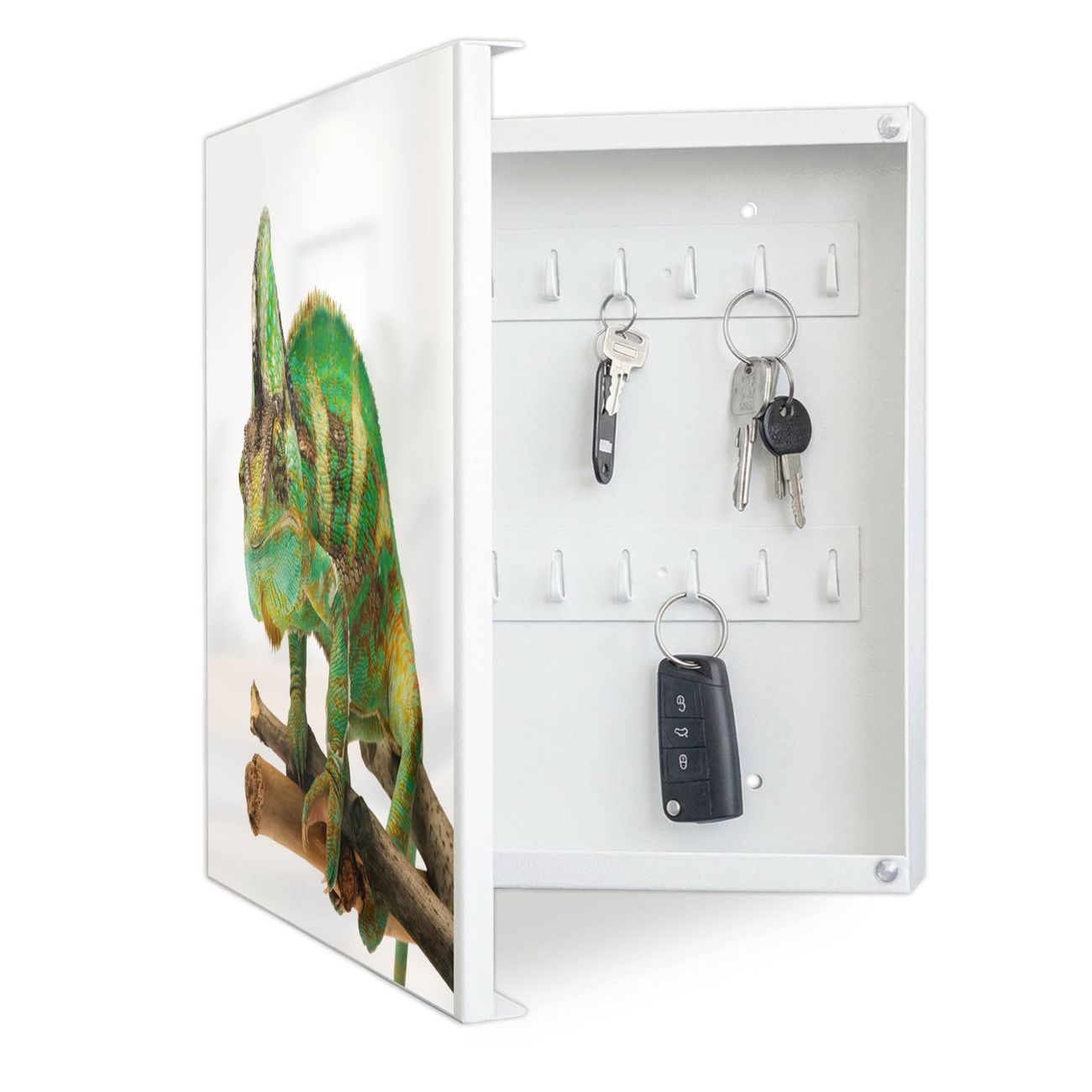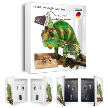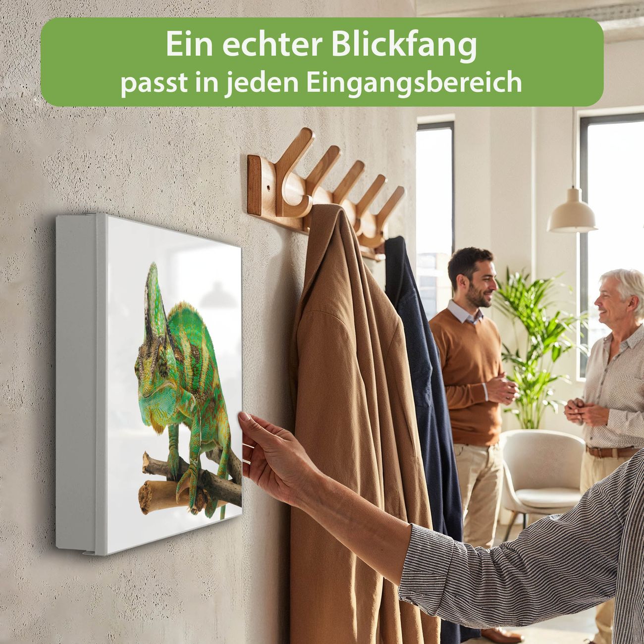 Bringe Ordnung und Eleganz in deinen Eingangsbereich mit dem banjado Schlüsselkasten Motiv Motiv Chamäleon. Die moderne Schlüsselbox kombiniert funktionales Design mit hochwertiger Verarbeitung und wird so zu einem echten Hingucker in Flur, Büro oder Ferienwohnung. ✅ Stilvolle Schlüsselaufbewahrung mit Motiv Motiv Chamäleon Der Design-Schlüsselkasten Motiv Motiv Chamäleon bietet Platz für bis zu 32 Schlüssel, die auf 4 stabilen Reihen mit je 8 Haken übersichtlich verstaut werden. Mit seinen kompakten Maßen von 30 x 30 x 5 cm passt die Schlüsselbox perfekt auch in kleinere Räume. Der weiß lackierte Stahlkorpus mit links angeschlagenem Türscharnier harmoniert mit gedruckten Folie auf der Front und fügt sich nahtlos in jedes Wohnambiente ein. Ob als Schlüsselorganizer für Zuhause oder als praktische Lösung für Büros, Praxen und Gewerbe, der banjado Schlüsselkasten sorgt für Ordnung und Übersicht. Dank der magnetischen, mit Kreidestiften beschreibbaren Folie auf der Front kannst du Notizen anheften oder Termine direkt auf der Oberfläche festhalten. Die Schlüsselbox Motiv Motiv Chamäleon zur Wandmontage wird inklusive Befestigungsmaterial geliefert und ist schnell angebracht. So hast du deine Schlüssel jederzeit griffbereit und zugleich stilvoll verstaut. Mit diesem banjado Schlüsselkasten Motiv Motiv Chamäleon kombinierst du praktische Aufbewahrung mit stilvollem Wohndesign. Ob privat oder geschäftlich, die Schlüsselbox sorgt für mehr Ordnung, Übersicht und ein wohnliches Ambiente.Vorteile im Überblick