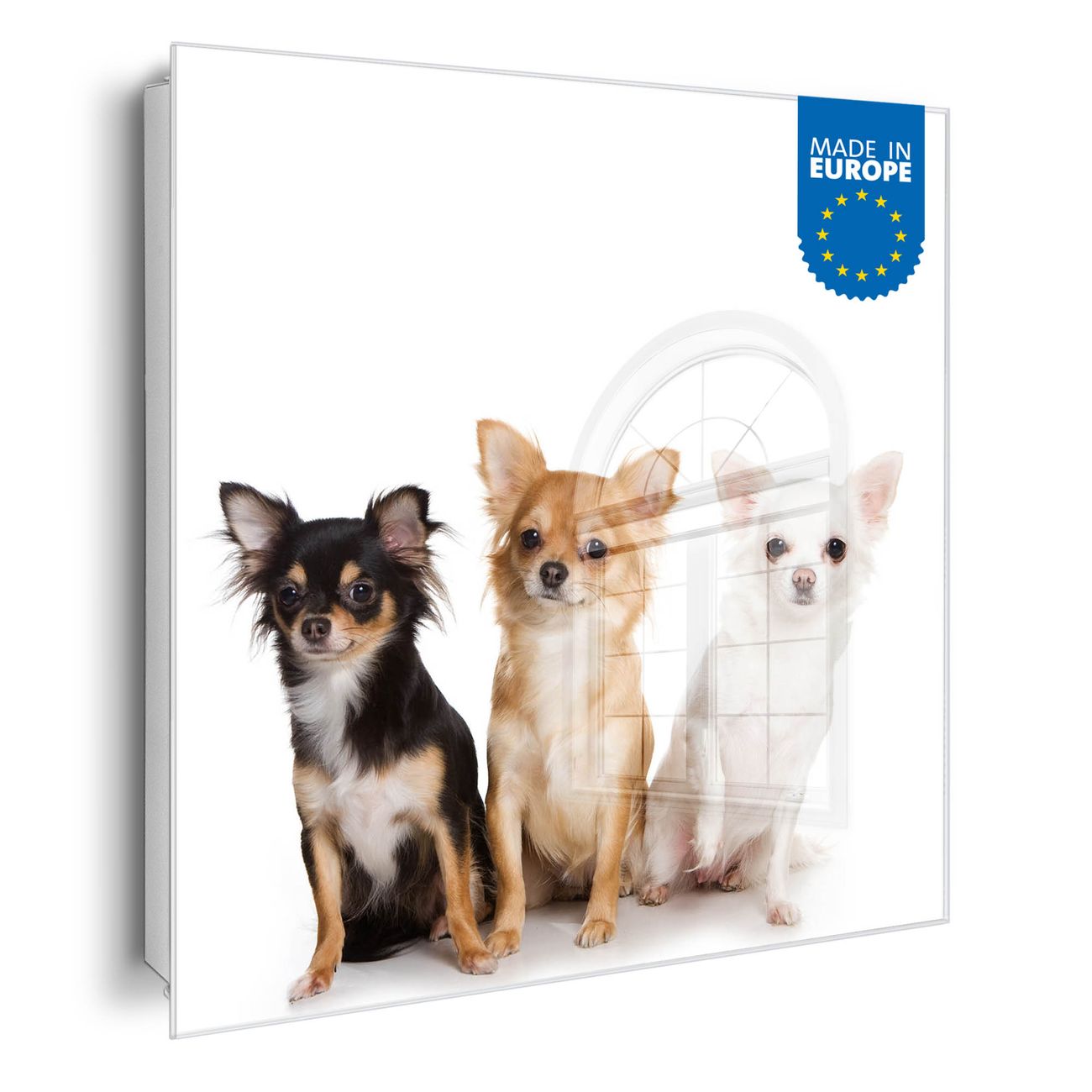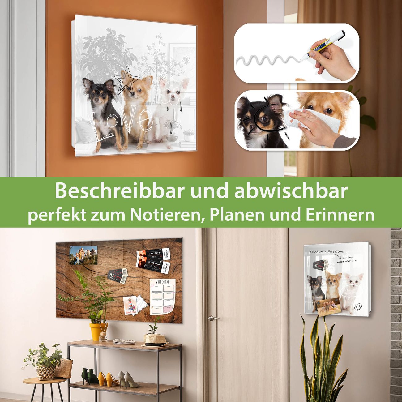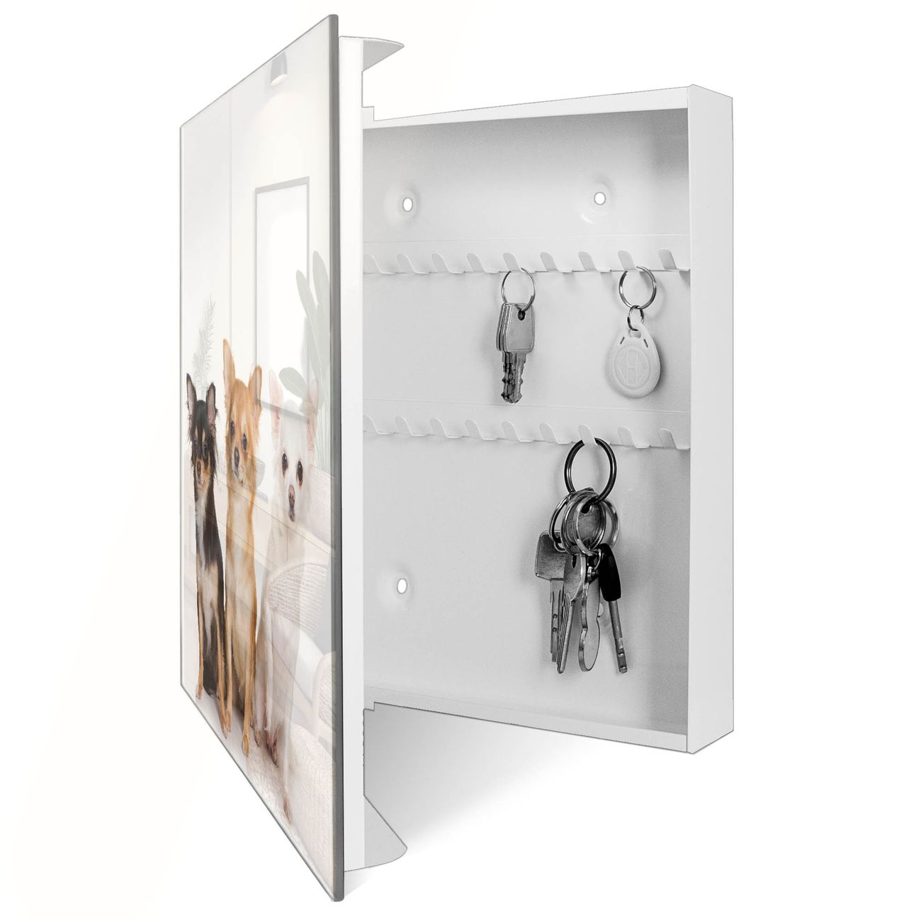 Bringe Ordnung und Eleganz in deinen Eingangsbereich mit dem banjado Schlüsselkasten Motiv Motiv Chihuahua. Die moderne Schlüsselbox kombiniert funktionales Design mit hochwertiger Verarbeitung und wird so zu einem echten Hingucker in Flur, Büro oder Ferienwohnung. ✅ Stilvolle Schlüsselaufbewahrung mit Glasfront im Motiv Motiv Chihuahua Der Design-Schlüsselkasten Motiv Motiv Chihuahua bietet Platz für bis zu 50 Schlüssel, die auf 5 stabilen Reihen mit je 10 Haken übersichtlich verstaut werden. Mit seinen kompakten Maßen von 30 x 30 x 5 cm passt die Schlüsselbox perfekt auch in kleinere Räume. Der weiß lackierte Stahlkorpus mit rechts angeschlagenem Türscharnier harmoniert mit der Glasfront und fügt sich nahtlos in jedes Wohnambiente ein. Ob als Schlüsselorganizer für Zuhause oder als praktische Lösung für Büros, Praxen und Gewerbe, der banjado Schlüsselkasten sorgt für Ordnung und Übersicht. Dank der magnetischen, mit Kreidestiften beschreibbaren Glasfront kannst du Notizen anheften oder Termine direkt auf der Oberfläche festhalten. Die Schlüsselbox Motiv Motiv Chihuahua zur Wandmontage wird inklusive Befestigungsmaterial geliefert und ist schnell angebracht. So hast du deine Schlüssel jederzeit griffbereit und zugleich stilvoll verstaut. Mit diesem banjado Schlüsselkasten Motiv Motiv Chihuahua kombinierst du praktische Aufbewahrung mit stilvollem Wohndesign. Ob privat oder geschäftlich, die Schlüsselbox sorgt für mehr Ordnung, Übersicht und ein wohnliches Ambiente.Vorteile im Überblick