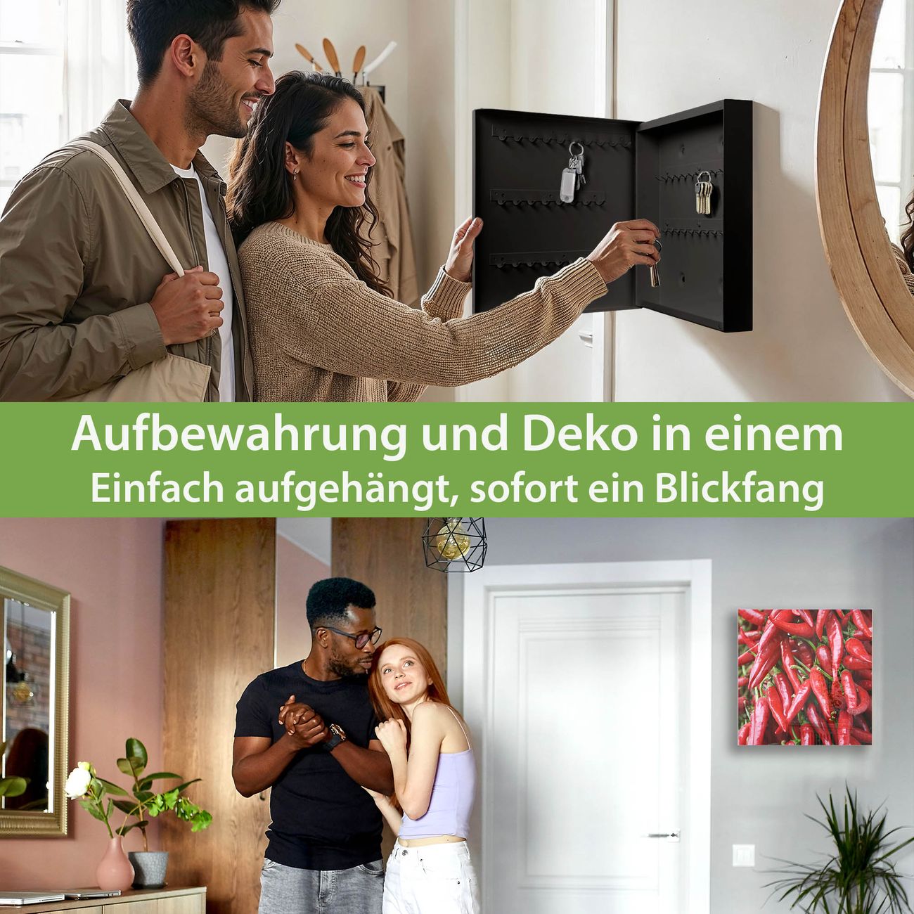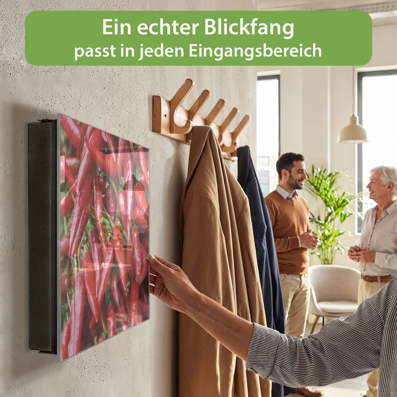 Bringe Ordnung und Eleganz in deinen Eingangsbereich mit dem banjado Schlüsselkasten Motiv Motiv Chilli. Die moderne Schlüsselbox kombiniert funktionales Design mit hochwertiger Verarbeitung und wird so zu einem echten Hingucker in Flur, Büro oder Ferienwohnung. ✅ Stilvolle Schlüsselaufbewahrung mit Glasfront im Motiv Motiv Chilli Der Design-Schlüsselkasten Motiv Motiv Chilli bietet Platz für bis zu 50 Schlüssel, die auf 5 stabilen Reihen mit je 10 Haken übersichtlich verstaut werden. Mit seinen kompakten Maßen von 30 x 30 x 5 cm passt die Schlüsselbox perfekt auch in kleinere Räume. Der schwarz lackierte Stahlkorpus mit rechts angeschlagenem Türscharnier harmoniert mit der Glasfront und fügt sich nahtlos in jedes Wohnambiente ein. Ob als Schlüsselorganizer für Zuhause oder als praktische Lösung für Büros, Praxen und Gewerbe, der banjado Schlüsselkasten sorgt für Ordnung und Übersicht. Dank der magnetischen, mit Kreidestiften beschreibbaren Glasfront kannst du Notizen anheften oder Termine direkt auf der Oberfläche festhalten. Die Schlüsselbox Motiv Motiv Chilli zur Wandmontage wird inklusive Befestigungsmaterial geliefert und ist schnell angebracht. So hast du deine Schlüssel jederzeit griffbereit und zugleich stilvoll verstaut. Mit diesem banjado Schlüsselkasten Motiv Motiv Chilli kombinierst du praktische Aufbewahrung mit stilvollem Wohndesign. Ob privat oder geschäftlich, die Schlüsselbox sorgt für mehr Ordnung, Übersicht und ein wohnliches Ambiente.Vorteile im Überblick