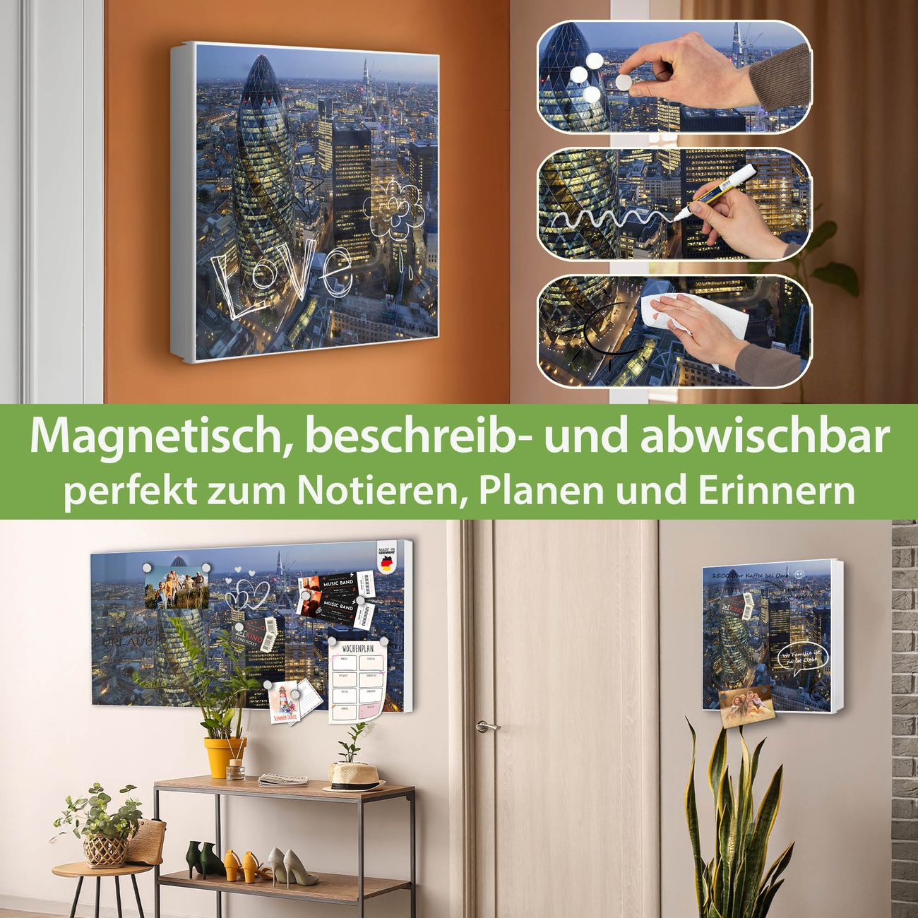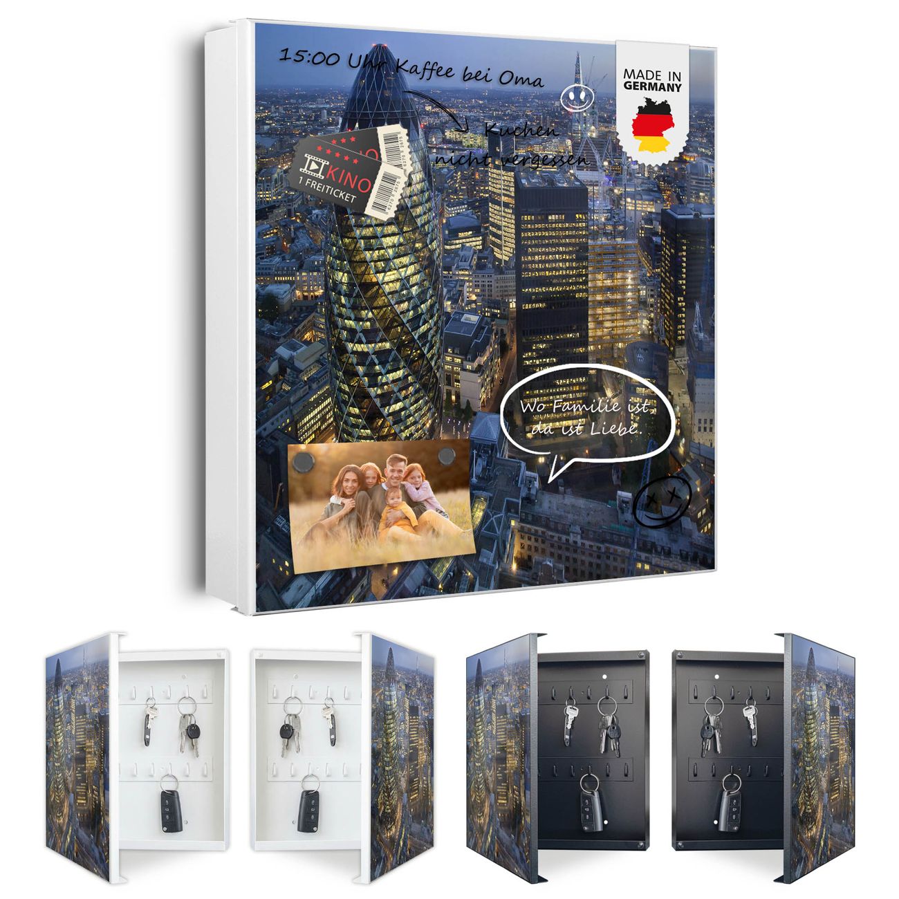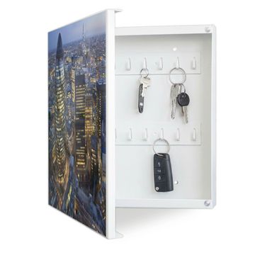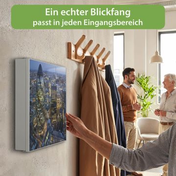 Bringe Ordnung und Eleganz in deinen Eingangsbereich mit dem banjado Schlüsselkasten Motiv Motiv City Of London. Die moderne Schlüsselbox kombiniert funktionales Design mit hochwertiger Verarbeitung und wird so zu einem echten Hingucker in Flur, Büro oder Ferienwohnung. ✅ Stilvolle Schlüsselaufbewahrung mit Motiv Motiv City Of London Der Design-Schlüsselkasten Motiv Motiv City Of London bietet Platz für bis zu 32 Schlüssel, die auf 4 stabilen Reihen mit je 8 Haken übersichtlich verstaut werden. Mit seinen kompakten Maßen von 30 x 30 x 5 cm passt die Schlüsselbox perfekt auch in kleinere Räume. Der weiß lackierte Stahlkorpus mit links angeschlagenem Türscharnier harmoniert mit gedruckten Folie auf der Front und fügt sich nahtlos in jedes Wohnambiente ein. Ob als Schlüsselorganizer für Zuhause oder als praktische Lösung für Büros, Praxen und Gewerbe, der banjado Schlüsselkasten sorgt für Ordnung und Übersicht. Dank der magnetischen, mit Kreidestiften beschreibbaren Folie auf der Front kannst du Notizen anheften oder Termine direkt auf der Oberfläche festhalten. Die Schlüsselbox Motiv Motiv City Of London zur Wandmontage wird inklusive Befestigungsmaterial geliefert und ist schnell angebracht. So hast du deine Schlüssel jederzeit griffbereit und zugleich stilvoll verstaut. Mit diesem banjado Schlüsselkasten Motiv Motiv City Of London kombinierst du praktische Aufbewahrung mit stilvollem Wohndesign. Ob privat oder geschäftlich, die Schlüsselbox sorgt für mehr Ordnung, Übersicht und ein wohnliches Ambiente.Vorteile im Überblick